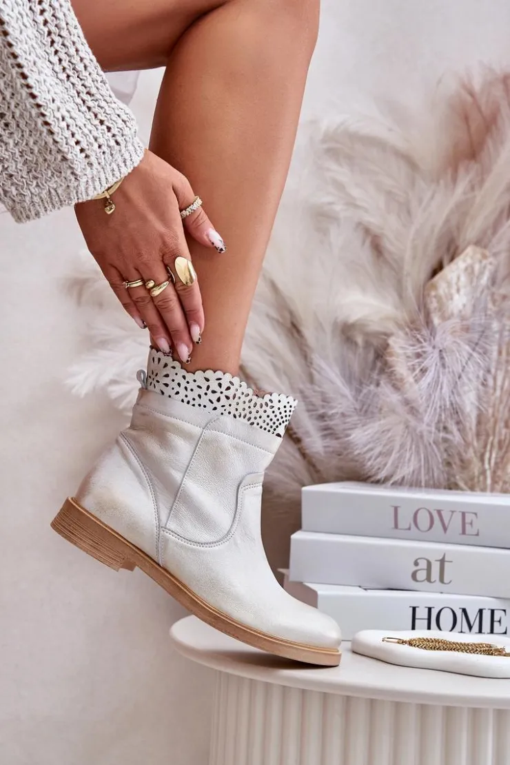 Te śliczne botki damskie zostały wykonane z wysokiej jakości naturalnej skóry. Osadzone na płaskim obcasie, co sprawia, że są niezwykle wygodne i stabilne. Zapinane na suwak z boku cholewki. Model ten posiada ażurowy element na górze cholewki. Noski zaokrąglone. Koniecznie powinnaś je mieć! Przy wyborze rozmiaru prosimy sugerować się tabelą rozmiarów.