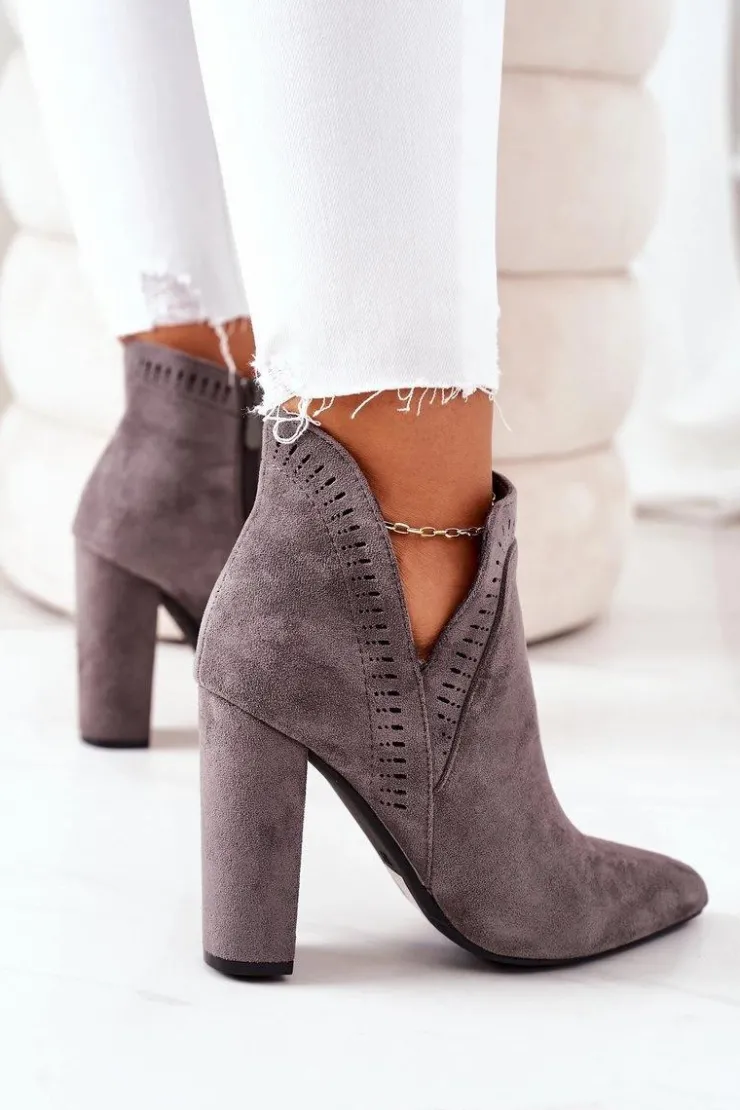 Wyjątkowe botki na słupku wykonane z eko zamszu. Wnętrze butów ocieplone jest kocem obuwniczym. Wygodny słupek to gwarancja wygody. Przy wyborze rozmiaru prosimy sugerować się tabelą rozmiarów.