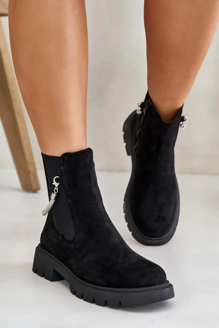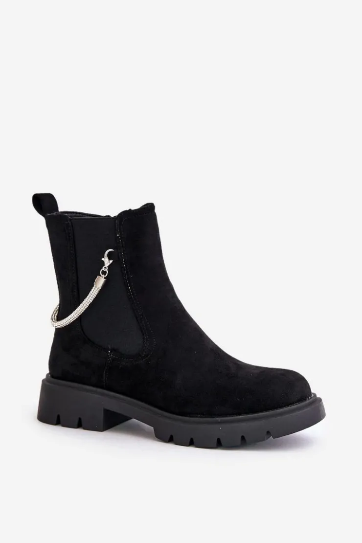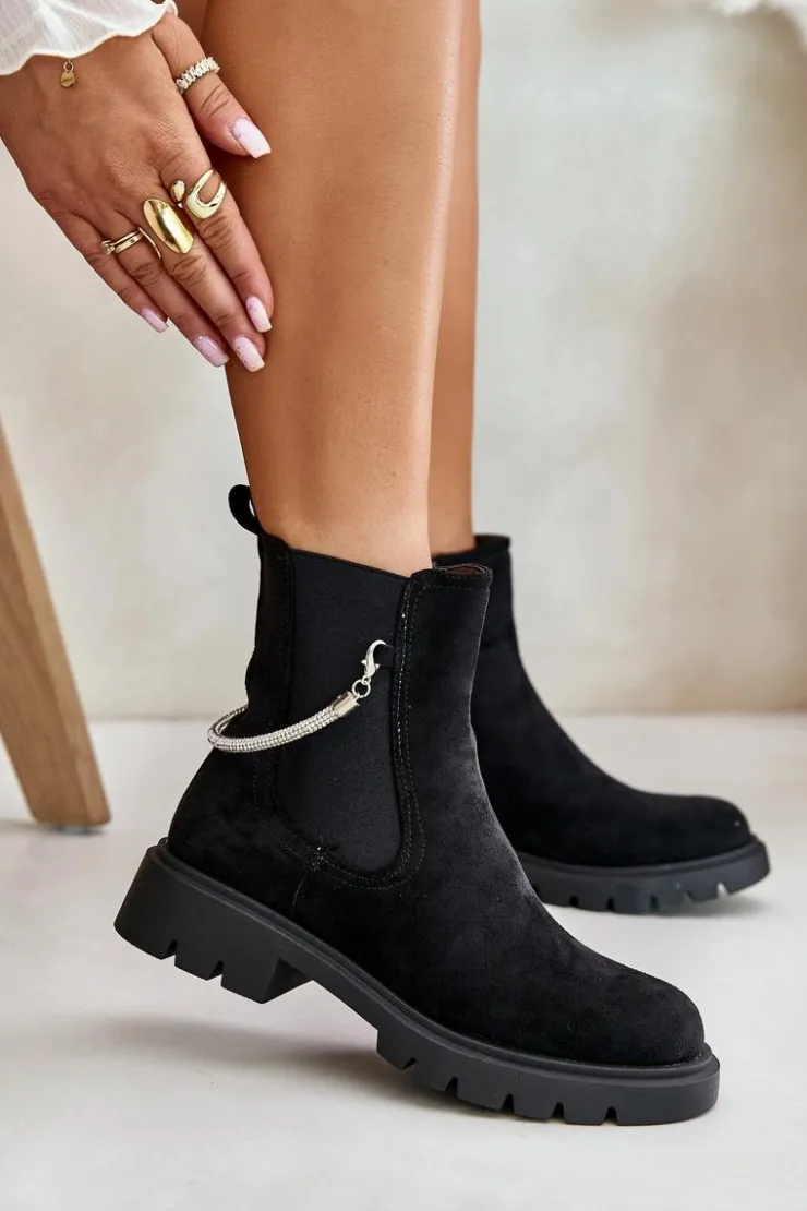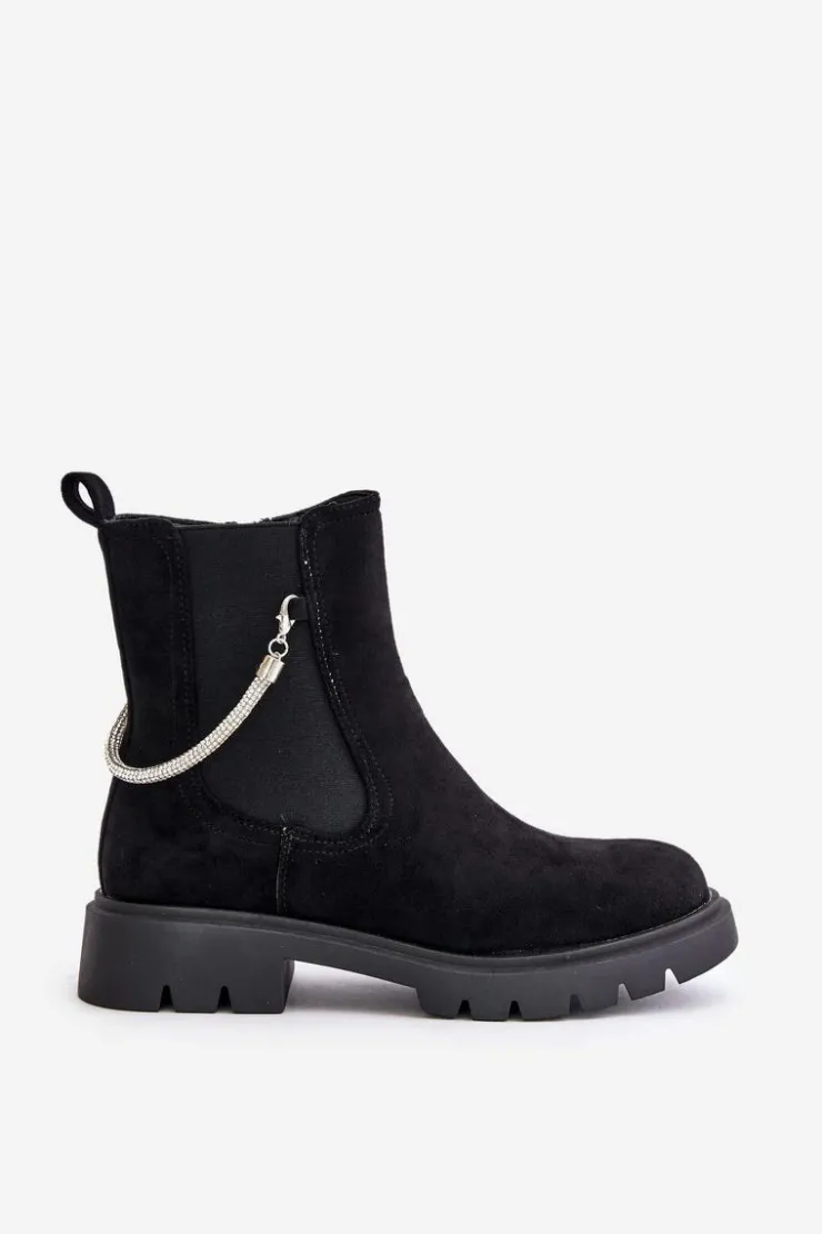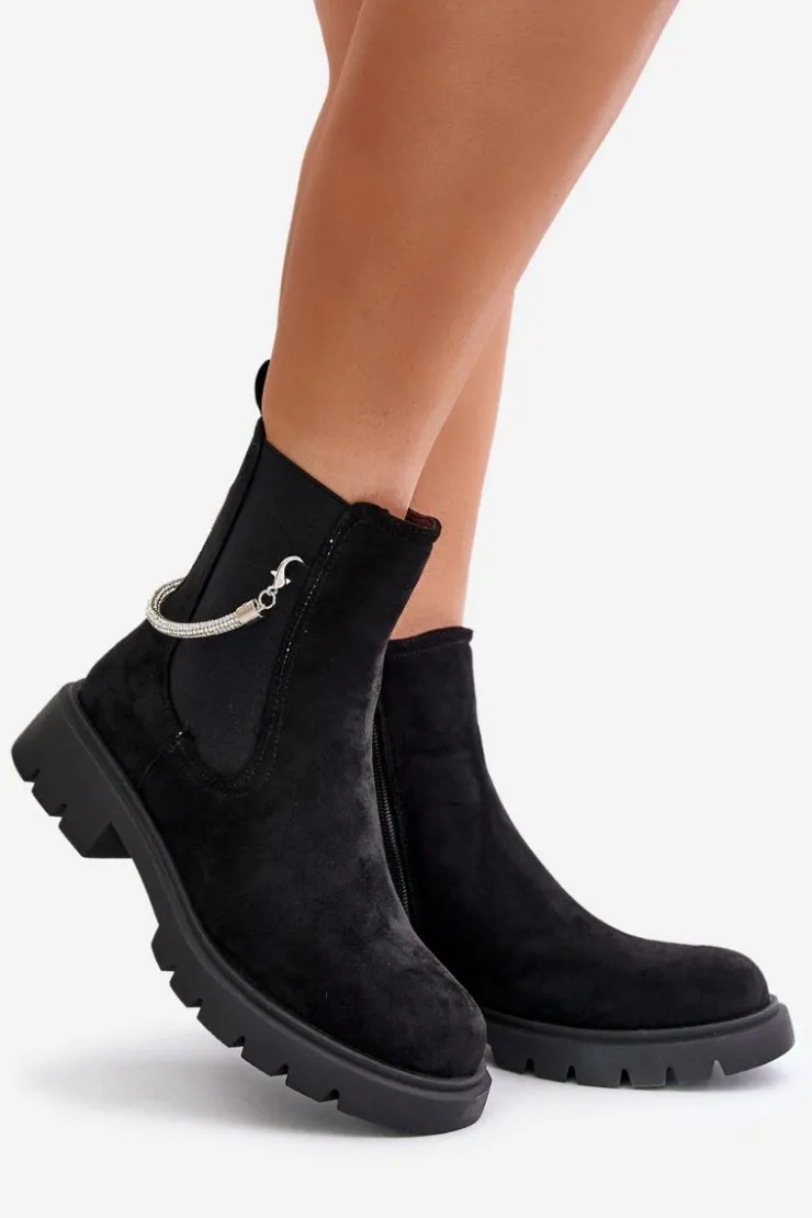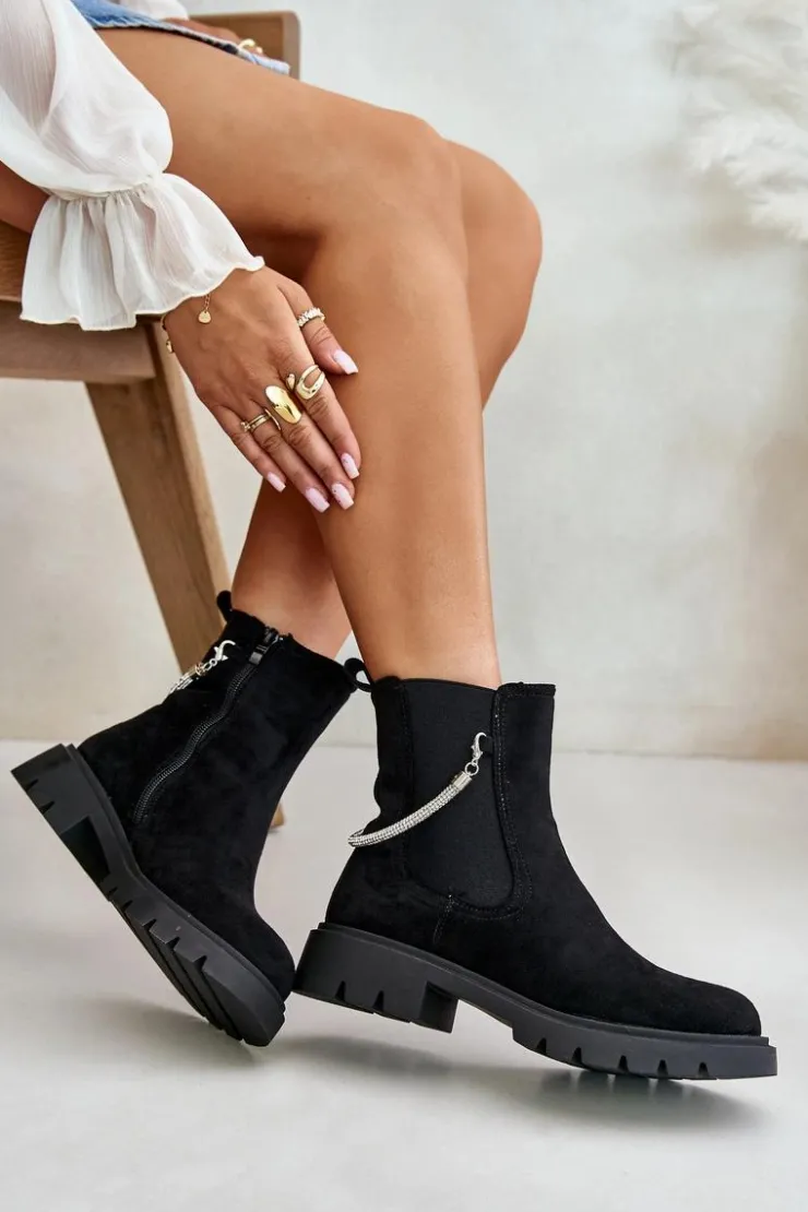 Botki damskie wykonane z eko zamszu. Model ten wyróżnia się ozdobnym, błyszczącym, odpinanym paseczkiem, który nadaje wyjątkowego uroku. Środek ocieplany kocem obuwniczym, co zapewni ciepło i komfort w chłodniejsze dni. Przy wyborze rozmiaru prosimy sugerować się tabelą rozmiarów.