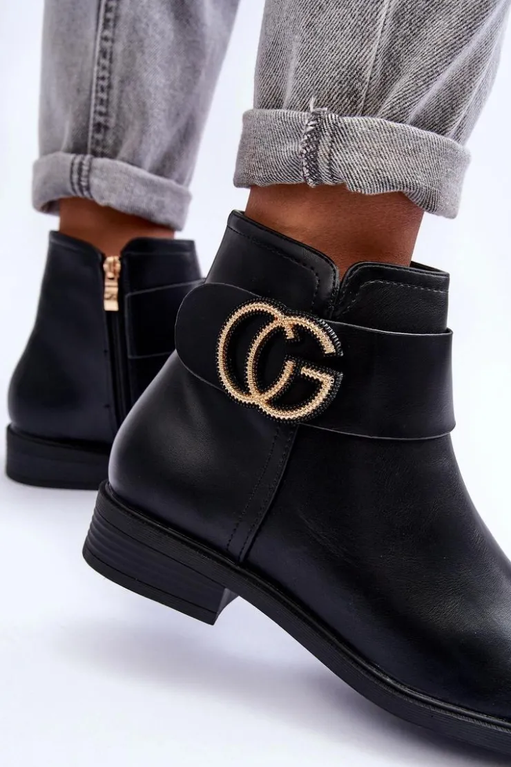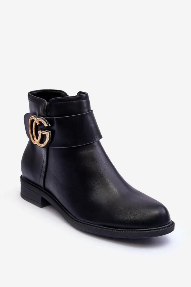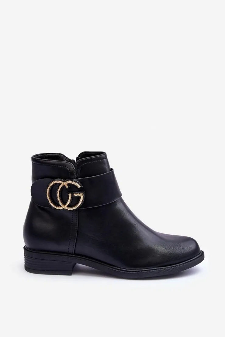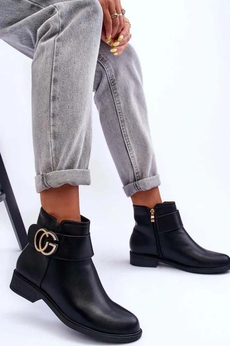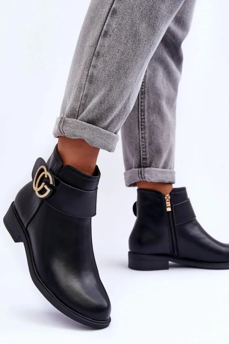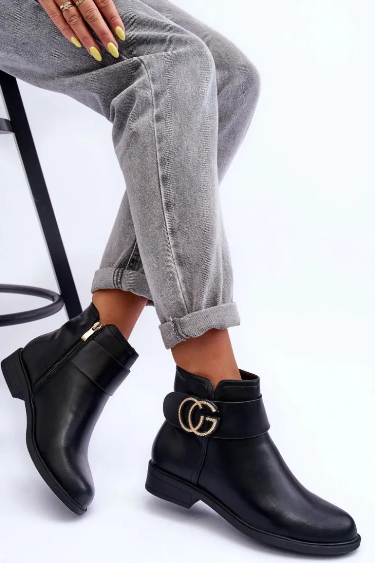 Klasyczne botki damskie wykonane z eko skóry. Zapinane na suwak po wewnętrznej stronie buta. Model ten osadzony został na płaskim obcasie z zaokrąglonym noskiem. Na pasku znajduje się ozdoba. Każda stylizacja w połączeniu z nimi będzie świetnie wyglądać! Przy wyborze rozmiaru prosimy sugerować się tabelą rozmiarów.