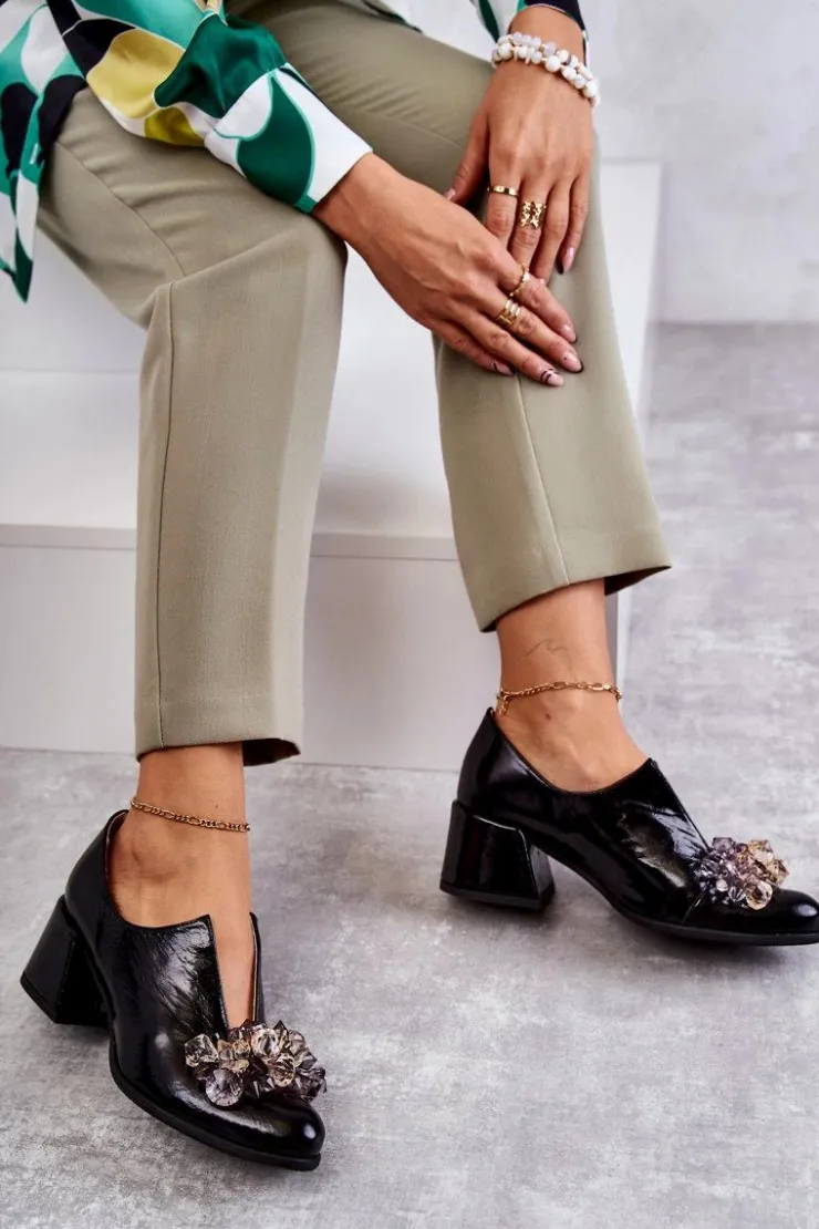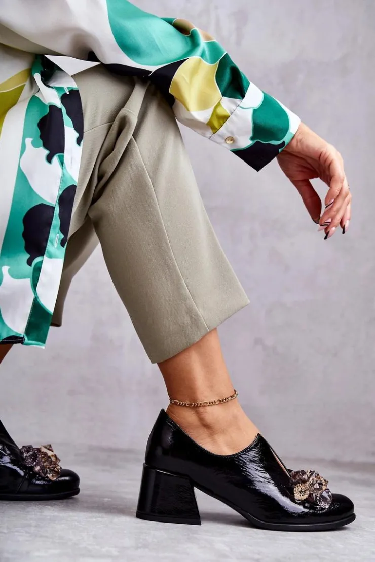 Eleganckie półbuty na niskim obcasie w postaci szerokiego słupka. Zostały wykonane z naturalnej skóry. Posiadają miękką wkładkę. Ozdoba przyszyta na przodzie oraz rozcięcie sprawia, że są naprawdę wyjątkowe. Buty posiadają nosek w kształcie migdała. Koniecznie sprawdź także pozostałe modele półbutów dostępnych w naszej ofercie! Przy wyborze rozmiaru prosimy sugerować się tabelą rozmiarów.