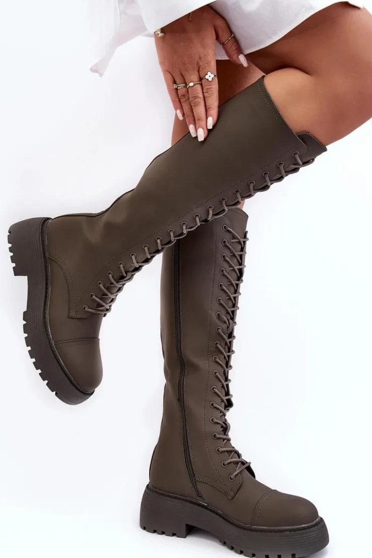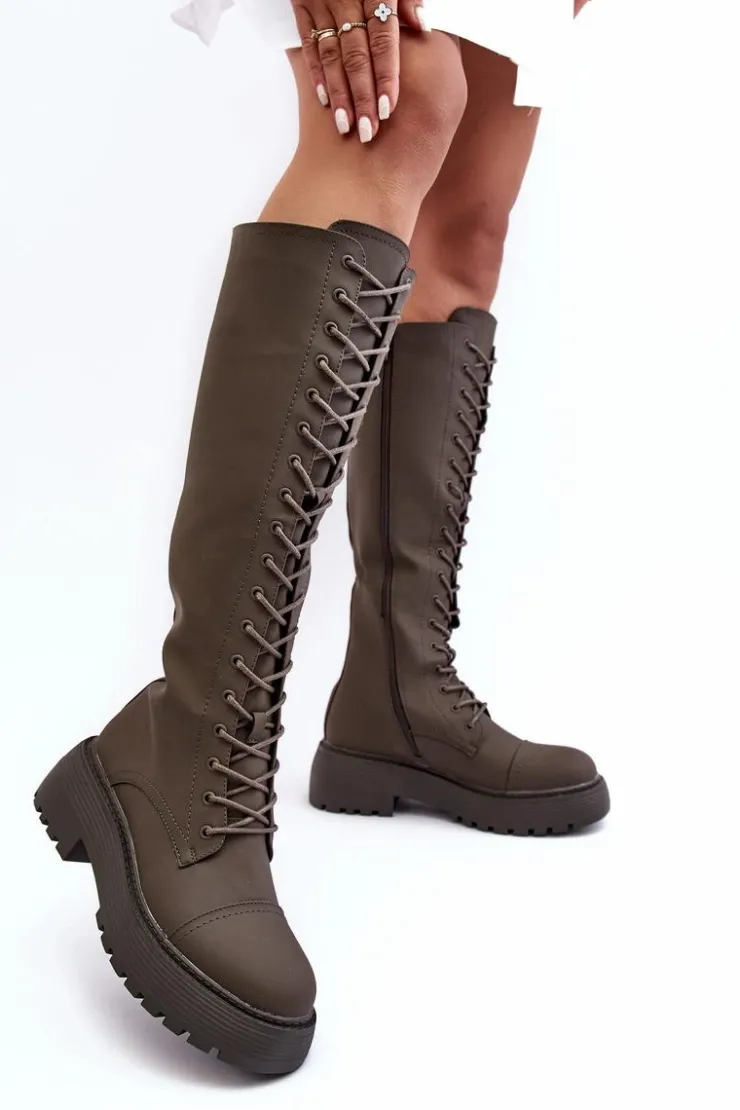 Damskie kozaki — glany posiadają sznurowanie oraz suwak na całości cholewki. Wykonane z eko skóry. Cholewka przed kolano. Środek ocieplony kocem obuwniczym. Model ten osadzony jest na płaskim obcasie i platformie. Przy wyborze rozmiaru prosimy kierować tabelą rozmiarów.