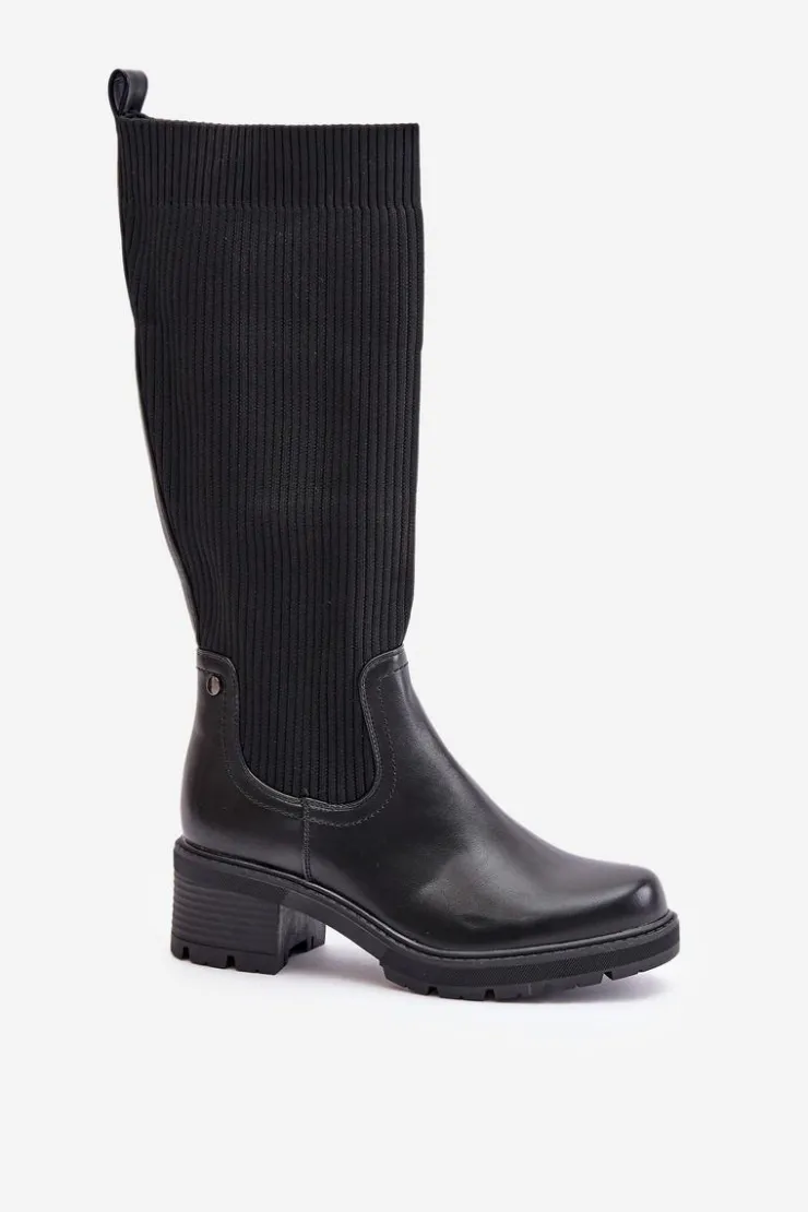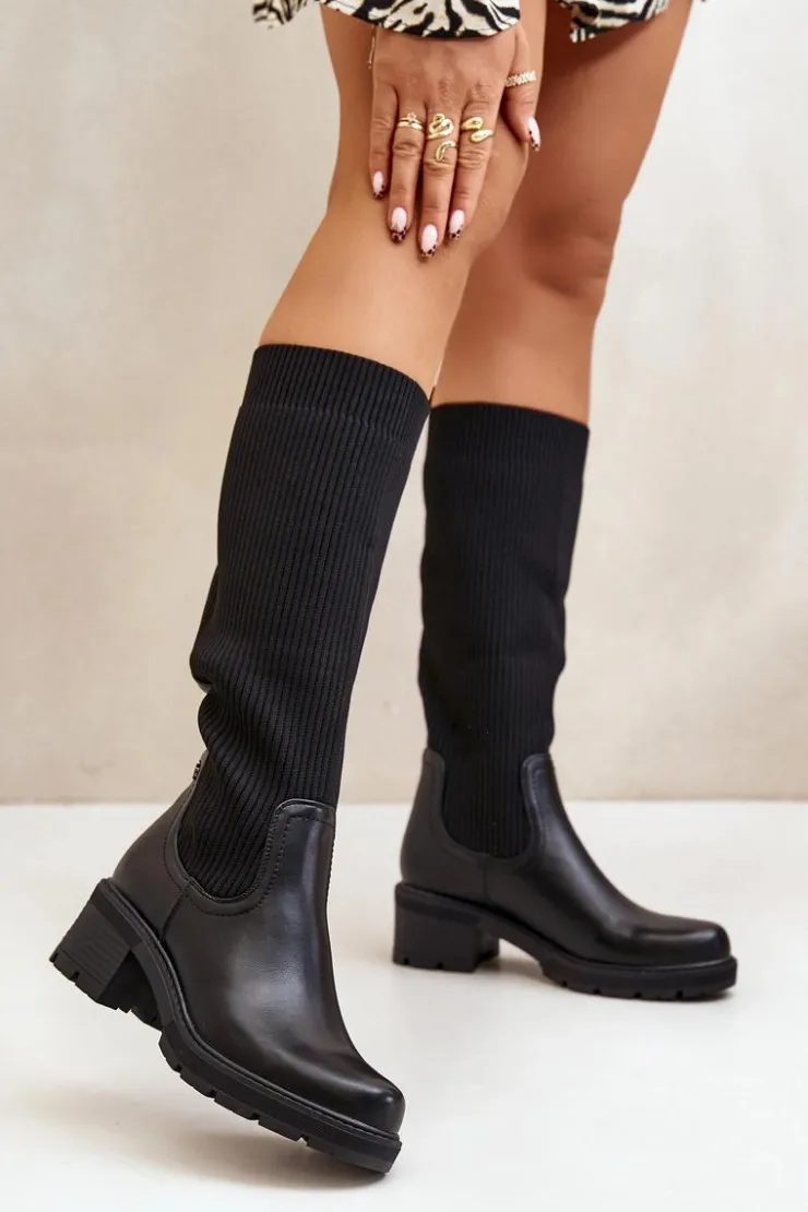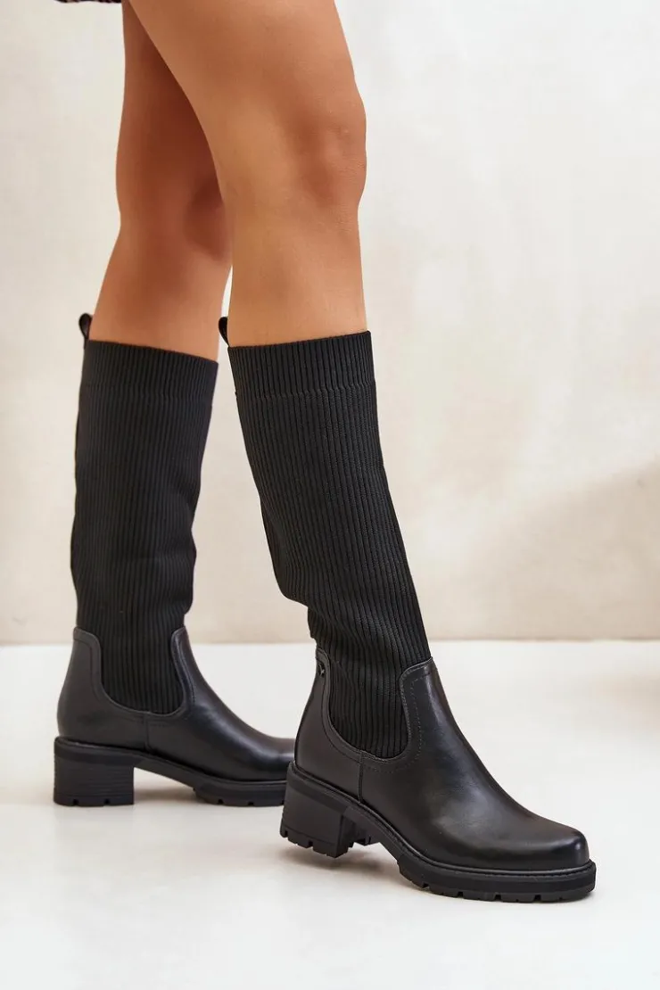 Kozaki damskie z elastyczną cholewką przed kolano. Wykonane z połączenia eko skóry i materiału tekstylnego. Osadzone na obcasie typu klocek. Model wsuwany. Wykorzystasz je w wielu stylizacjach! Koniecznie muszą być Twoje! Przy wyborze rozmiaru prosimy sugerować się tabelą rozmiarów.