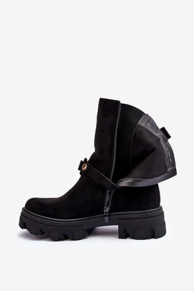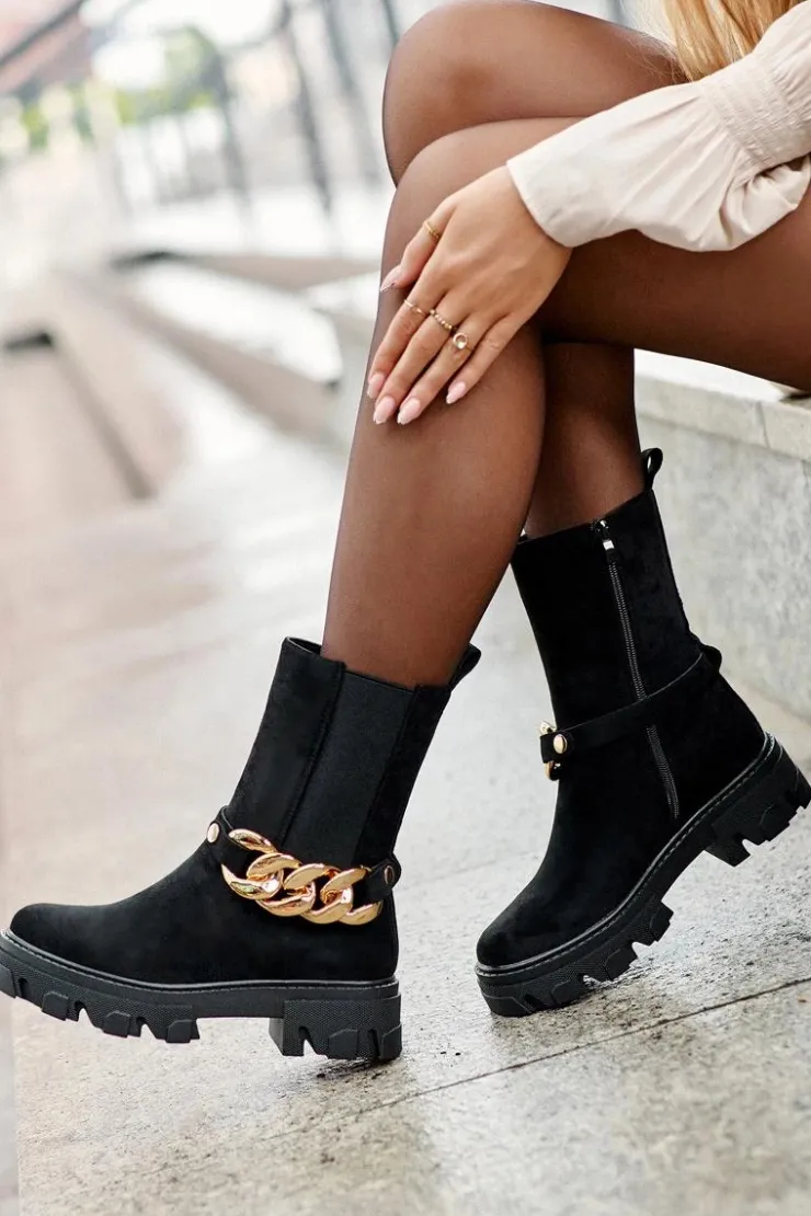 Modne damskie botki z wyższą cholewką wykonaną z eko zamszu. Zapinane na suwak po wewnętrznej stronie. Osadzone na płaskim obcasie i platformie ze żłobieniami. Cholewka ozdobiona ściąganym paskiem z łańcuchem. Świetny model do wielu stylizacji! Przy wyborze rozmiaru prosimy sugerować się tabelą rozmiarów.
