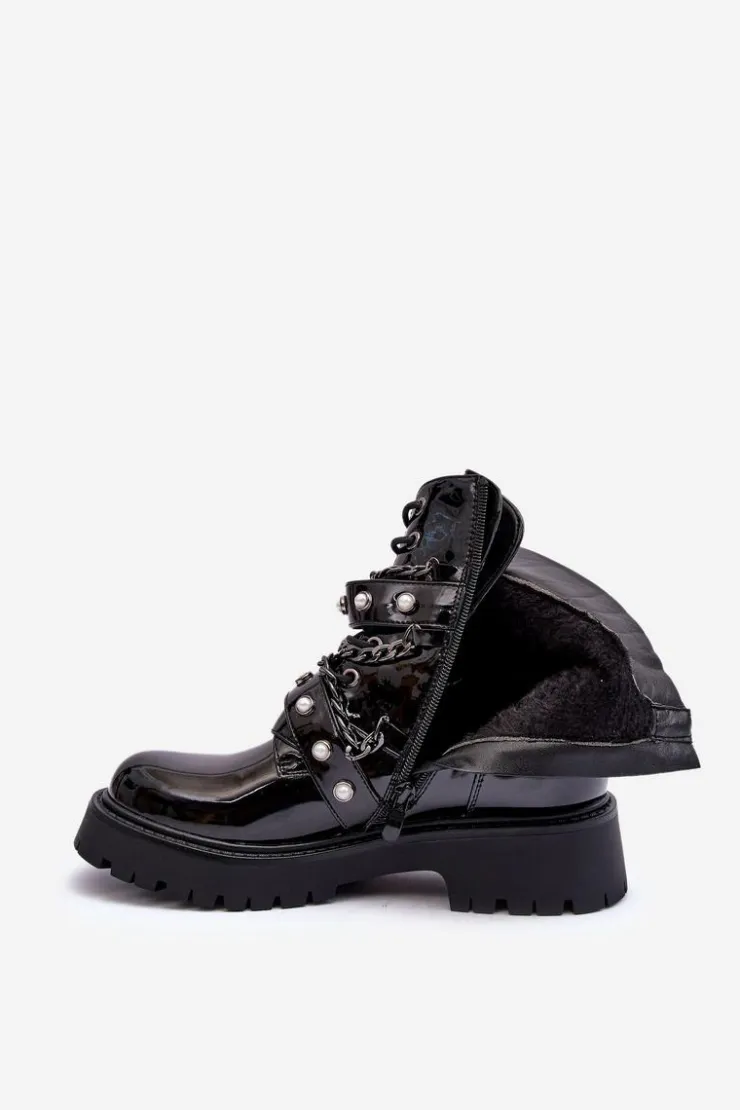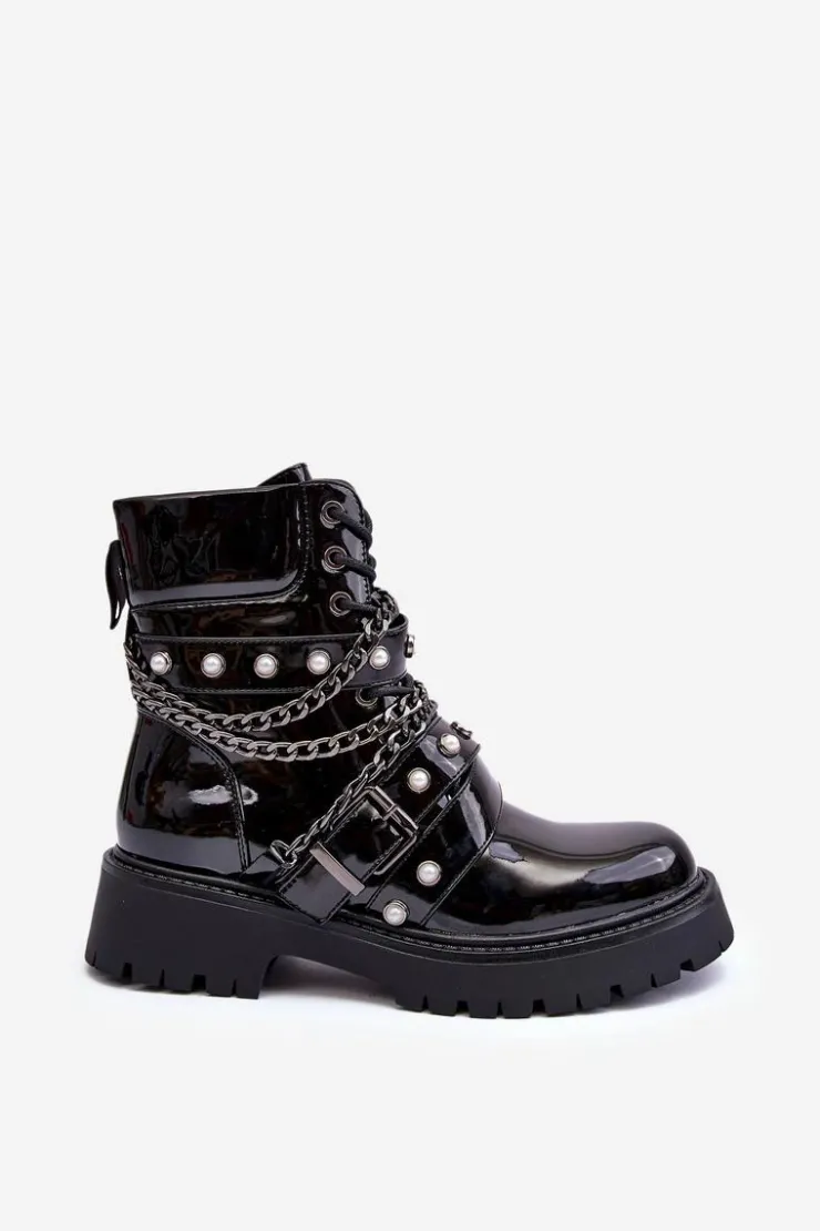 Stylowe botki damskie osadzone na płaskim obcasie i platformie. Wykonane z eko skóry. Cholewka ozdobiona łańcuchem oraz sztucznymi perłami. Wnętrze ocieplone kocem obuwniczym. Model ten zapinany jest na suwak po wewnętrznej stronie cholewki oraz dodatkowo posiada sznurowanie. Noski zaokrąglone. Nie zastanawiaj się dłużej i kup już dziś! Przy wyborze rozmiaru prosimy sugerować się tabelą rozmiarów.