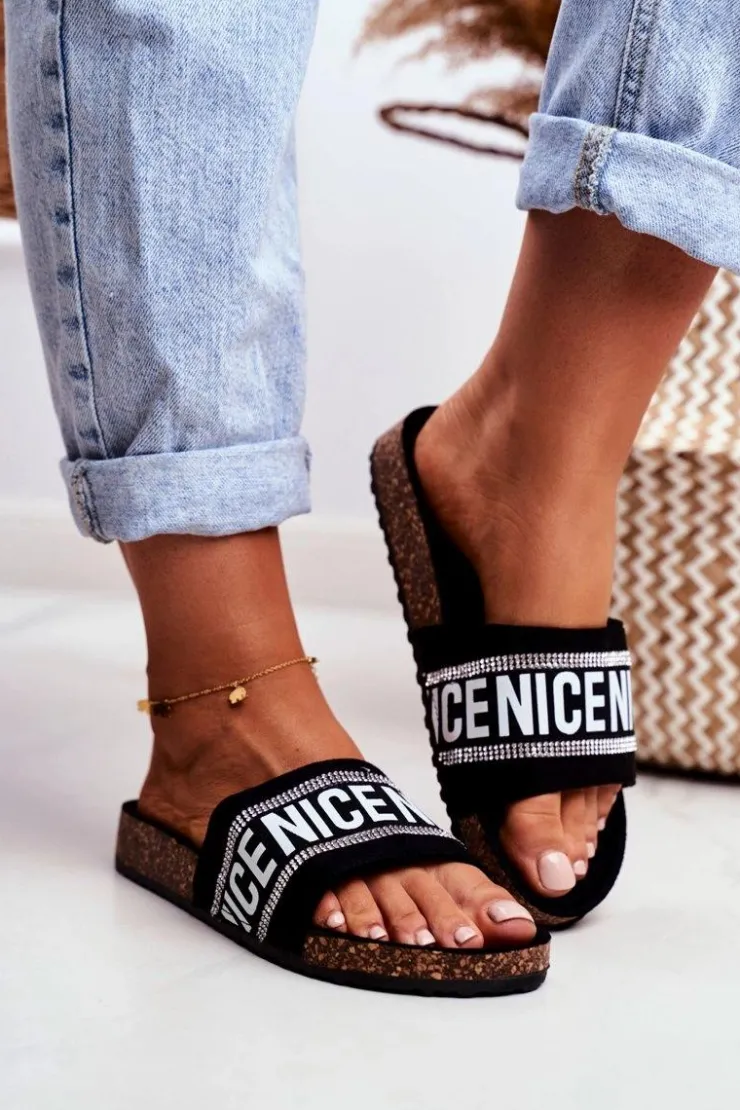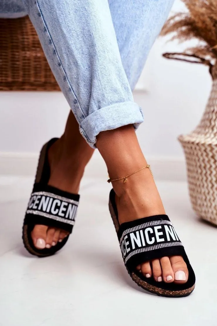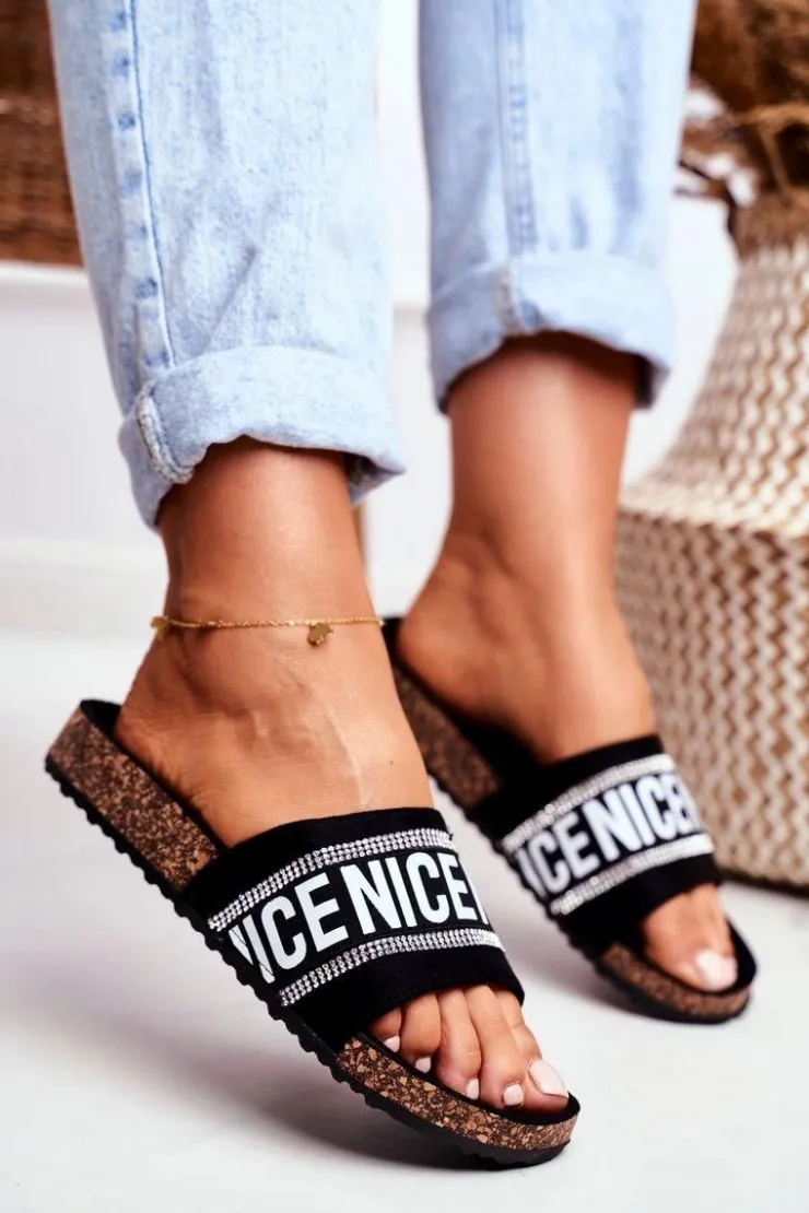 Komfortowe klapki damskie na korkowej podeszwie. Buty wykonane są z eko zamszu, posiadają delikatnie profilowaną wkładkę. Mody fason z cyrkoniami urozmaici Twoją garderobę!