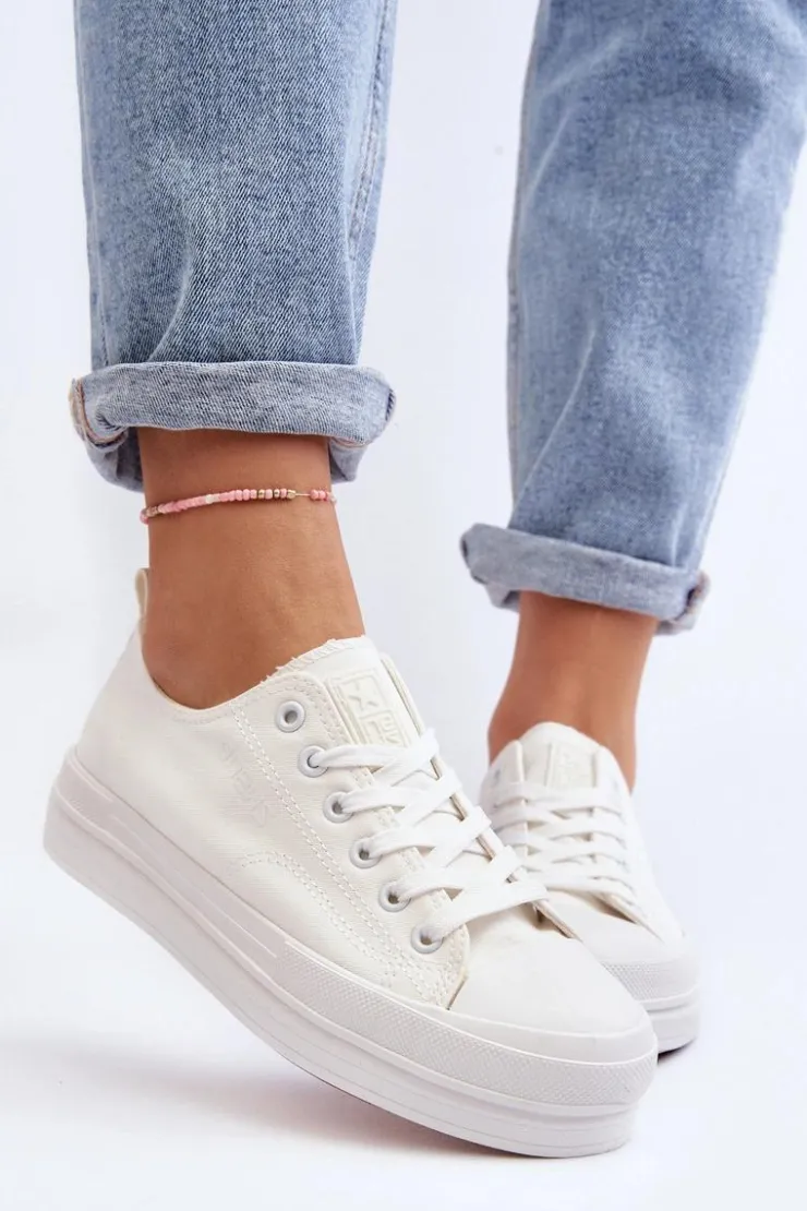 Trampki damskie wykonane z materiału tekstylnego. Osadzone na platformie. Gumowa podeszwa jest antypoślizgowa. Ponadczasowy model, który powinnaś mieć w swojej szafie! Z pewnością założysz je do wielu stylizacji! Nosek został wzmocniony gumowym tworzywem. Przy wyborze rozmiaru prosimy sugerować się tabelą rozmiarów.