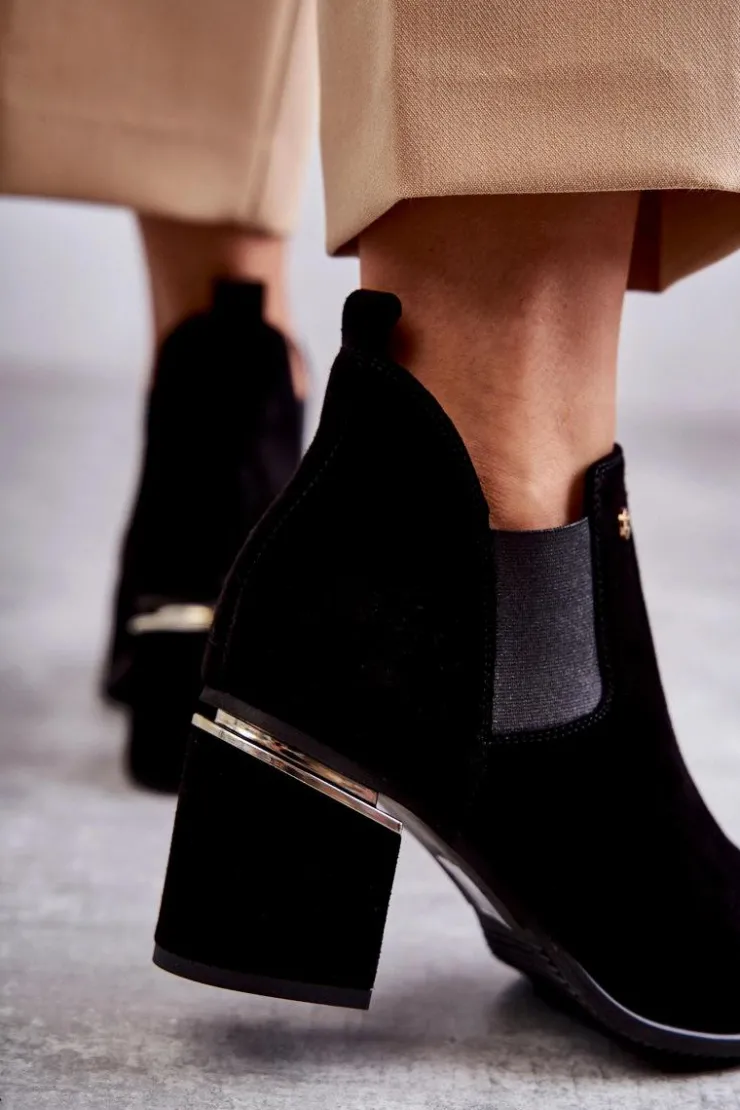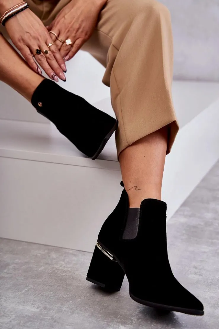 Eleganckie botki świetnie sprawdzą się podczas tworzenia stylizacji w chłodniejsze dni. Botki są wsuwane, z elastycznymi gumkami po bokach cholewki. W całości wykonane z naturalnego zamszu. Atutami tych botków jest przede wszystkim komfort noszenia oraz wysoka jakość wykonania. Dodatkowo posiadają usztywniany zapiętek oraz ozdobny obcas w postaci słupka. Przy wyborze rozmiaru prosimy sugerować się tabelą rozmiarów.