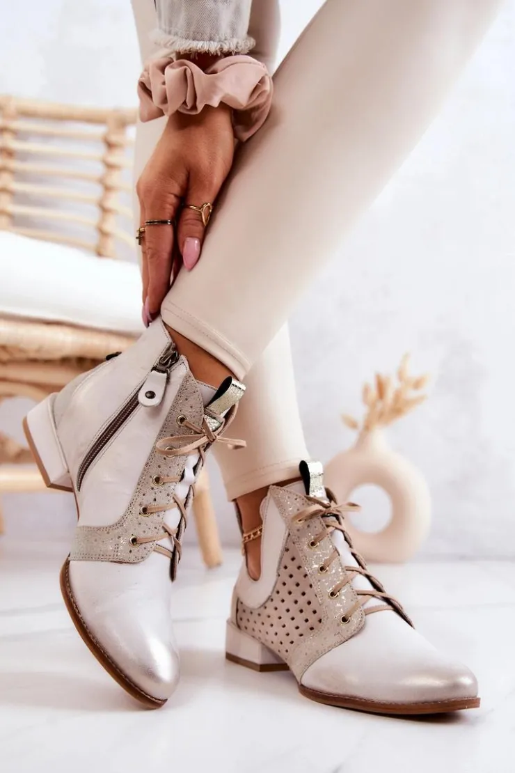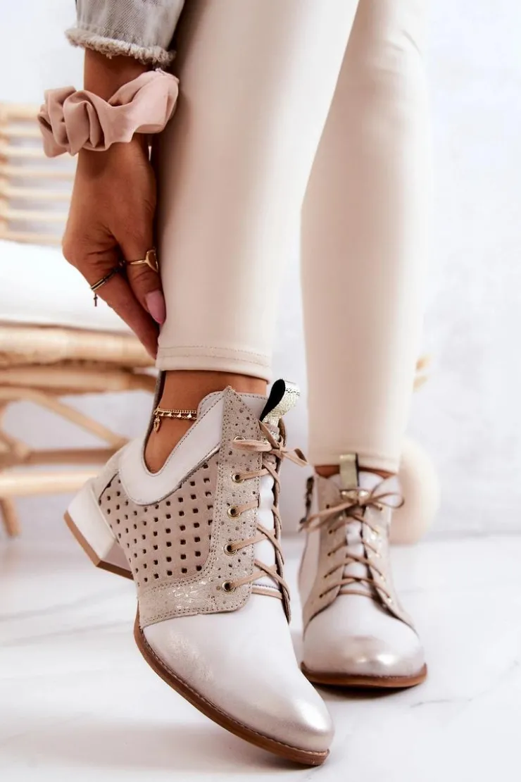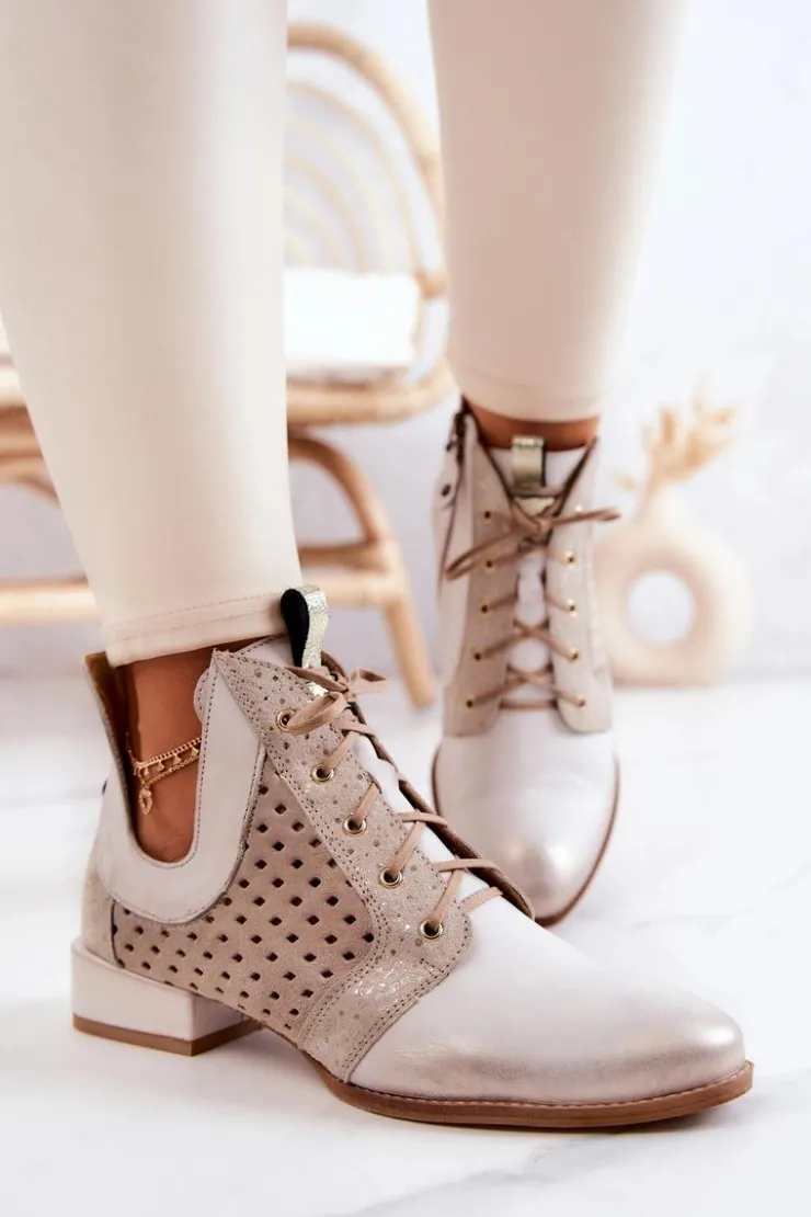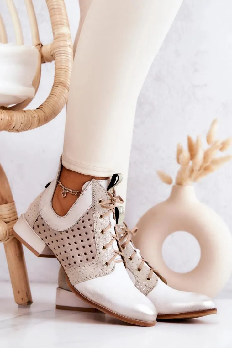 Prezentowane botki firmy Maciejka wykonane są z naturalnej skóry. Niski, stabilny obcas sprawia, że buty są bardzo wygodne. Botki posiadają wiązanie, dzięki któremu można odpowiednio dopasować je do tęgości nogi. Z boku cholewki znajduje się zamek. Miękka, delikatnie perforowana wkładka zapewni wygodę podczas użytkowania. Wycięcie na kostkę wygląda niezwykle efektownie. Przy wyborze rozmiaru prosimy sugerować się tabelą rozmiarów.
