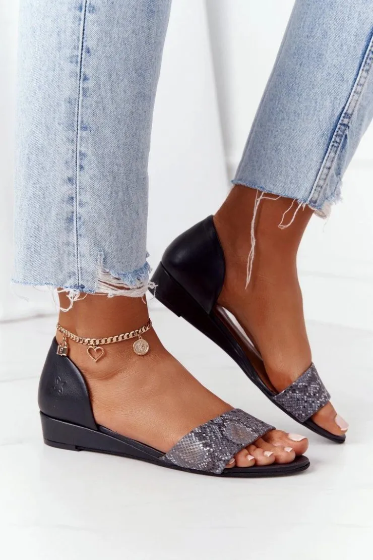 Maciejka Sandały Na Koturnie|Sandały Płaskie*Skórzane Sandały 1971-59 Czarno-Popielate