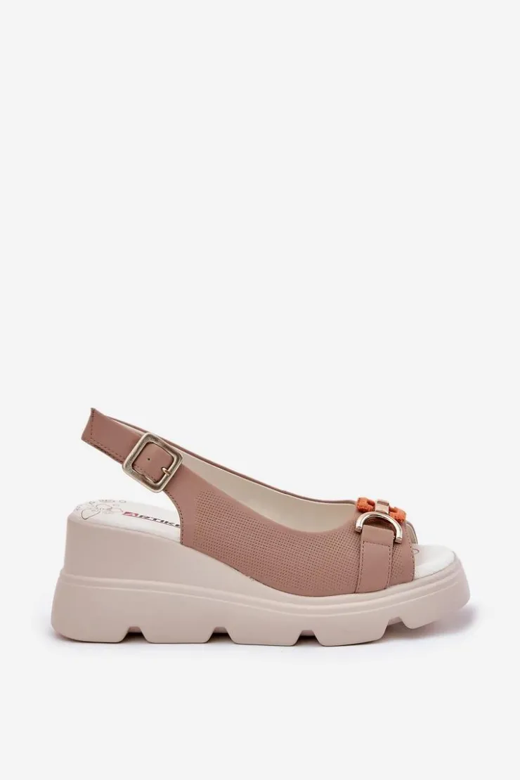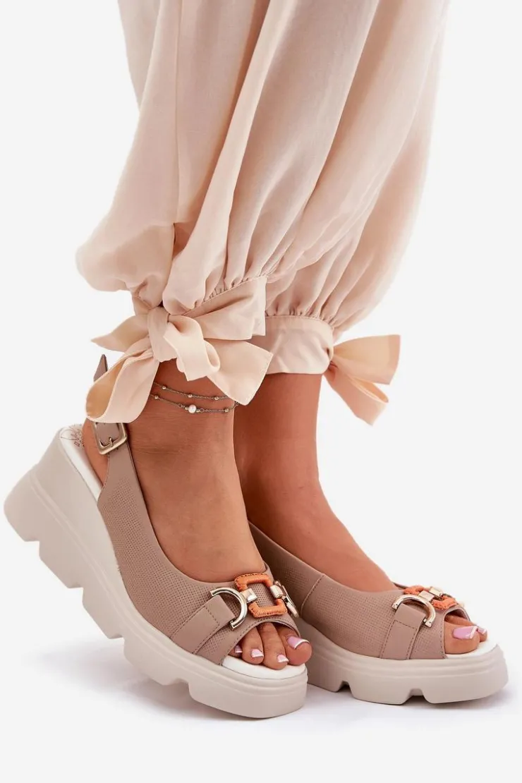 Damskie sandały wykonane z wysokiej jakości naturalnej skóry to połączenie elegancji i komfortu. Osadzone na platformie i koturnie, zapewniają wygodę oraz stabilność przez cały dzień. Z przodu znajduje się subtelny ozdobny detal, który dodaje im wyjątkowego charakteru. Miękka wkładka gwarantuje komfort noszenia, a zapinanie na klamrę z regulowanym paskiem umożliwia idealne dopasowanie do stopy. Te sandały to doskonały wybór do letnich stylizacji, idealne na różne okazje. Przy wyborze rozmiaru prosimy sugerować się tabelą rozmiarów.