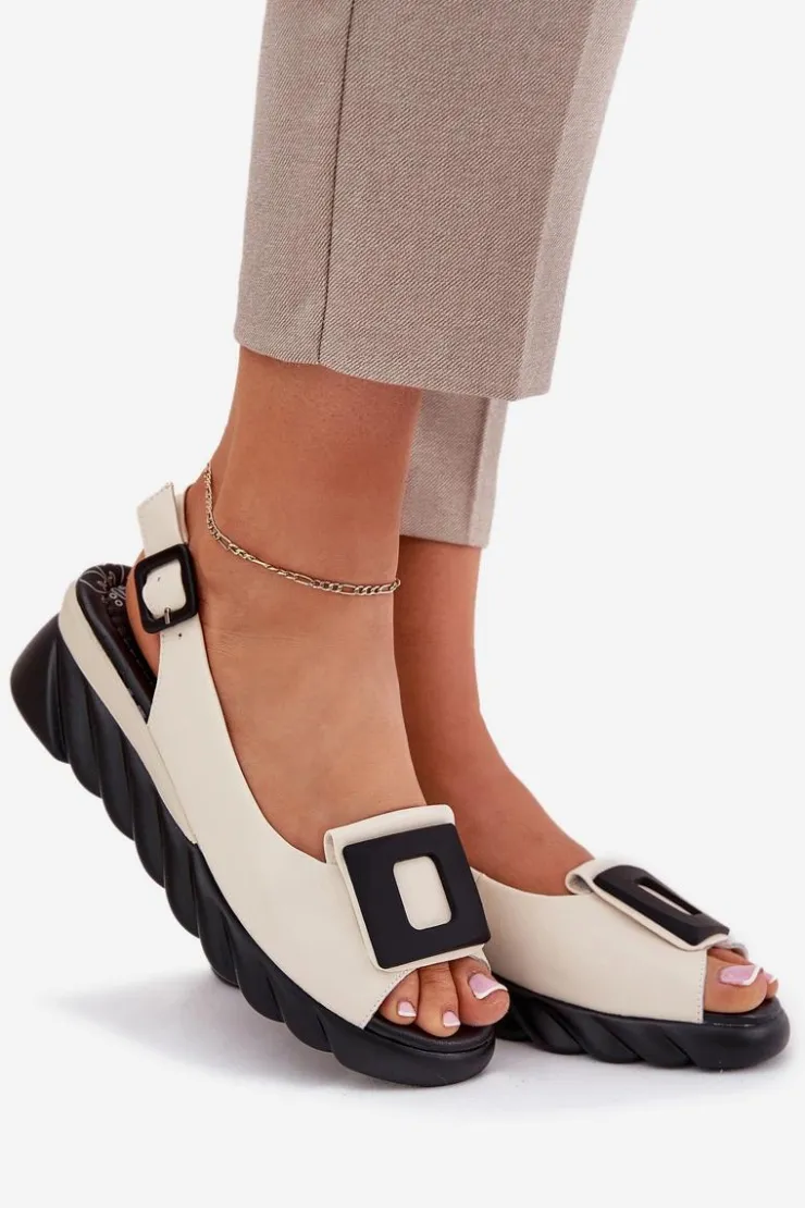Damskie sandały z naturalnej skóry, osadzone na koturnie, to elegancki wybór na ciepłe dni. Model wyróżnia się ozdobą z przodu, która nadaje im wyjątkowego charakteru. Zapinane na klamrę z regulowanym paskiem, zapewniają idealne dopasowanie do stopy. Dodatkowo miękka wkładka gwarantuje komfort przez cały dzień. Te sandały będą doskonałym wyborem do letnich stylizacji, łącząc elegancję z wygodą. Przy wyborze rozmiaru prosimy sugerować się tabelą rozmiarów.