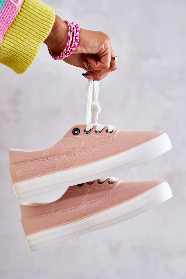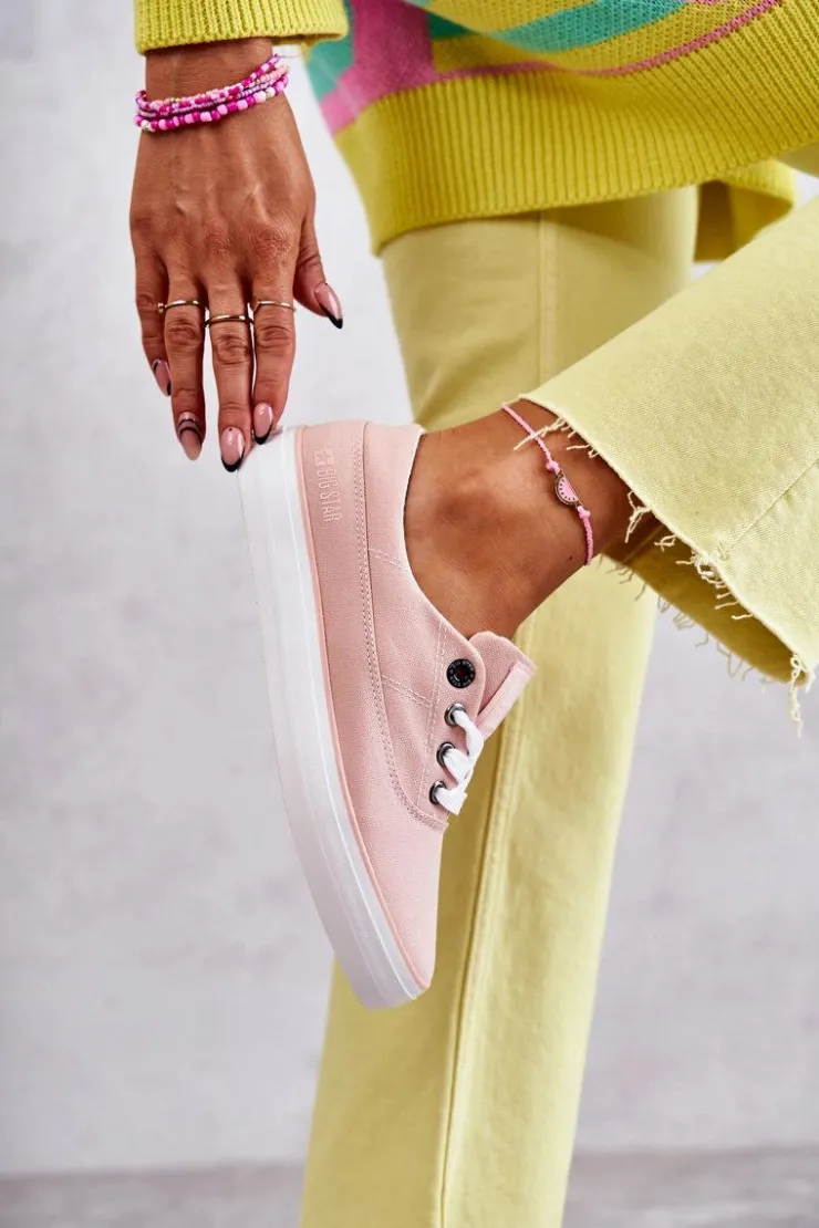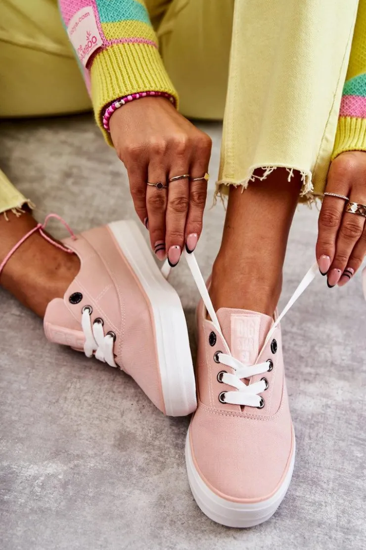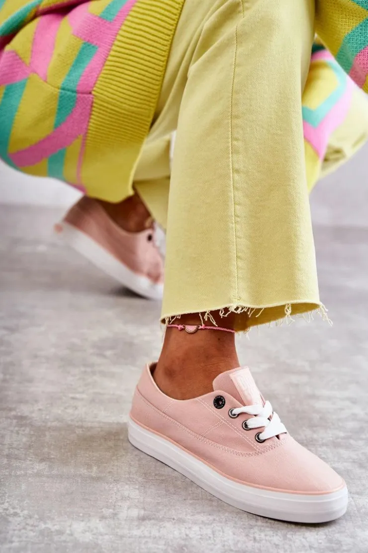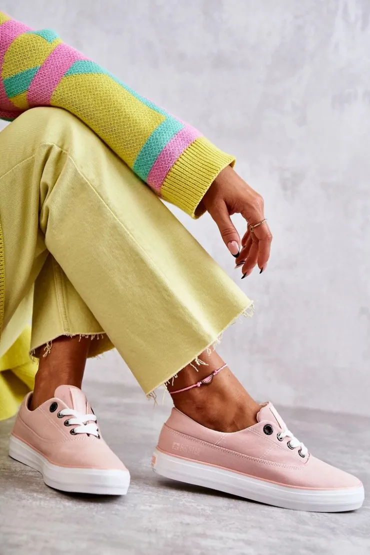 Niskie damskie trampki zostały wykonane z materiału tekstylnego. Buty posiadają okrągły, miękki nosek. Delikatnie usztywniany zapiętek. Model ten posiada sznurowanie pozwalające na odpowiednie dopasowanie obuwia do tęgości nogi. Dodatkowo tenisówki posiadają antypoślizgową, gumową podeszwę. Model ten świetnie sprawdzi się na co dzień do pracy czy szkoły. Przy wyborze rozmiaru prosimy sugerować się tabelą rozmiarów.