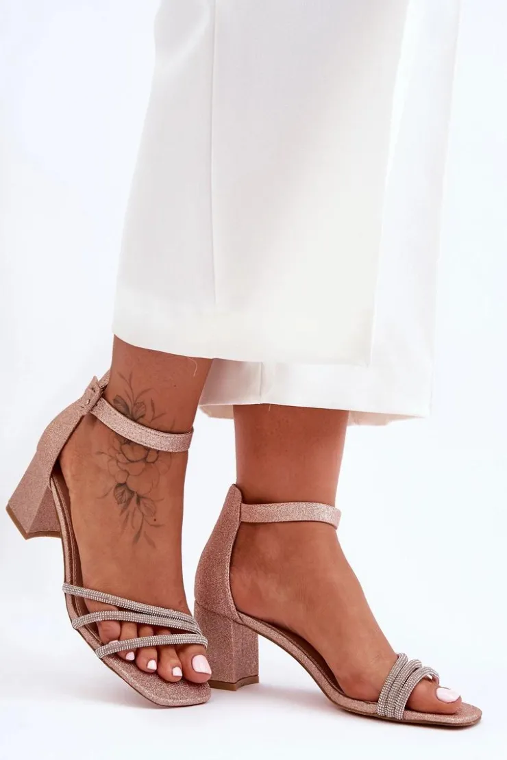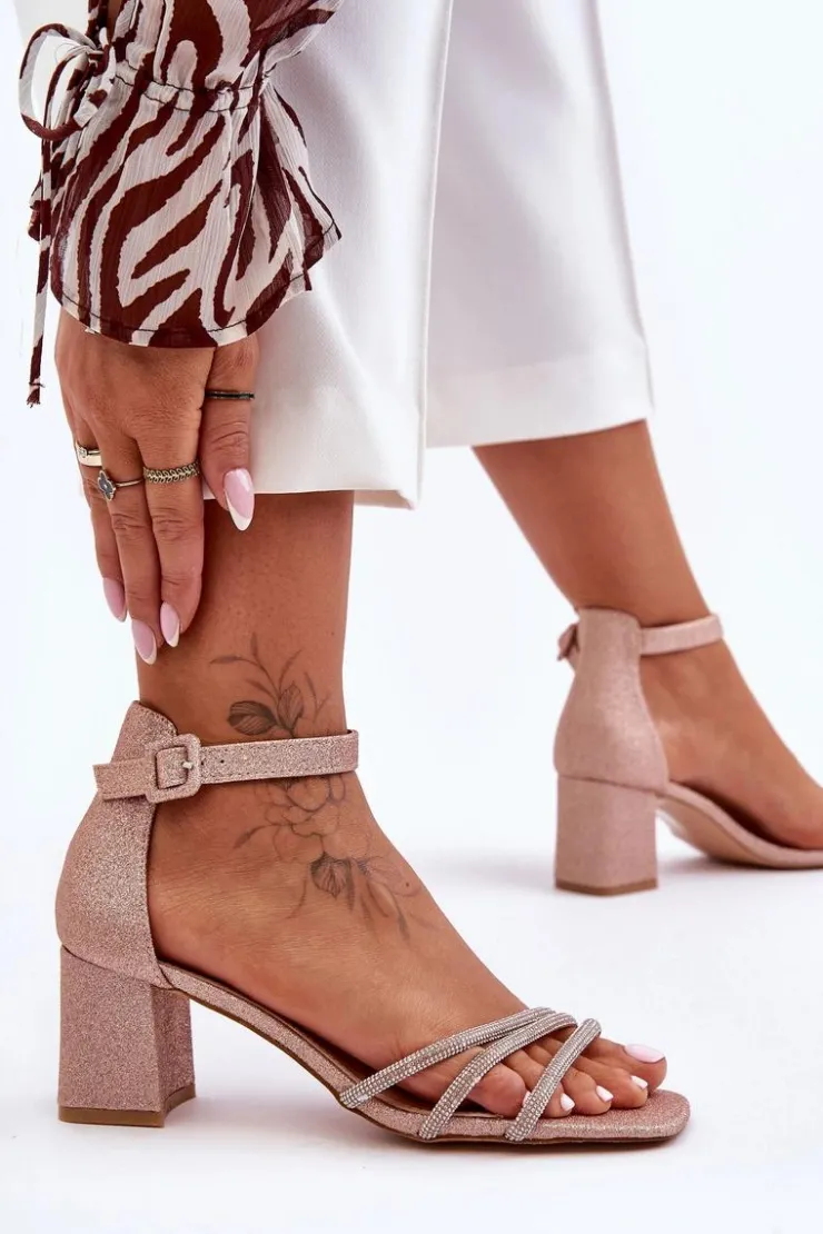 Klasyczne, błyszczące damskie sandałki na niskim obcasie w postaci słupka. Z przodu zdobione małymi cyrkoniami. Zapinane wokół kostki na regulowany pasek ze sprzączką. Idealne na różnego rodzaju imprezy! Koniecznie powinnaś je mieć w swojej szafie! Przy wyborze rozmiaru prosimy kierować tabelą rozmiarów.