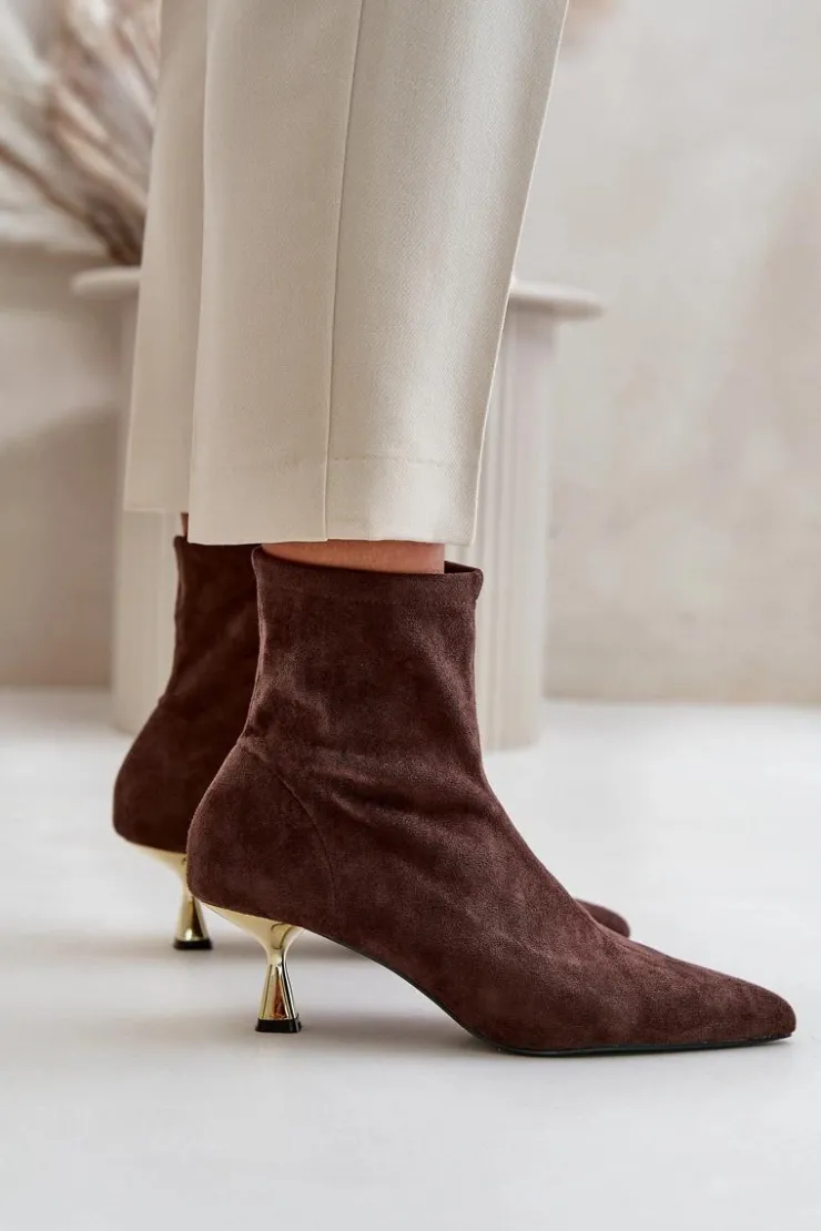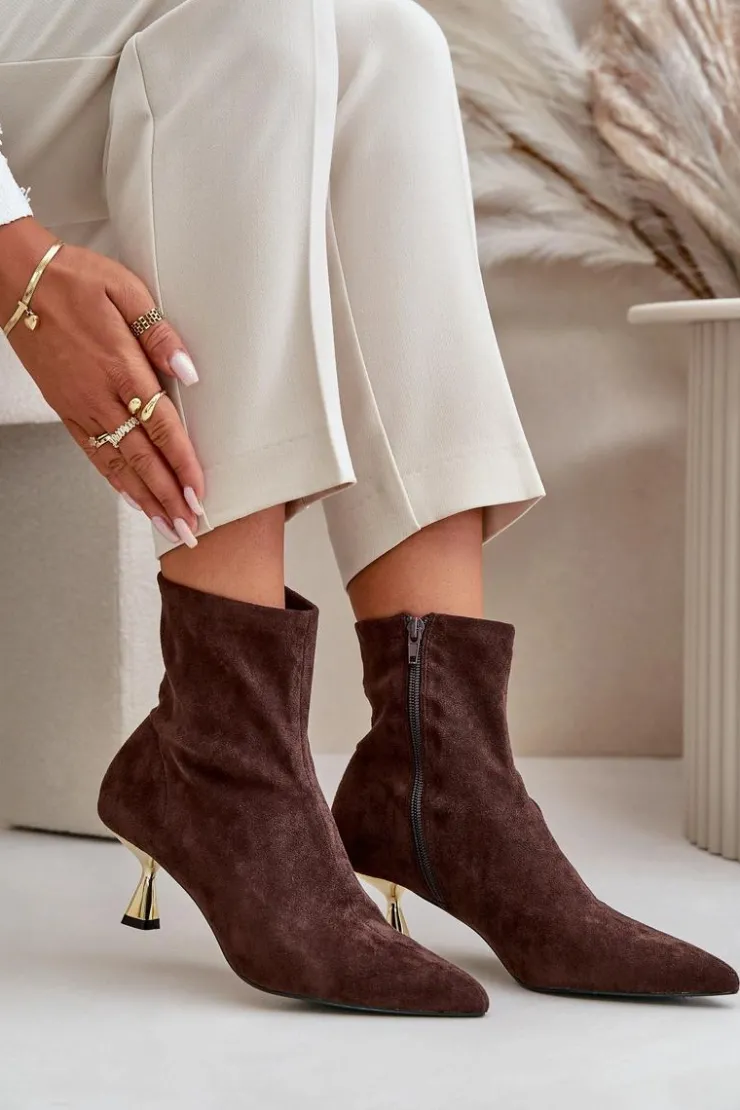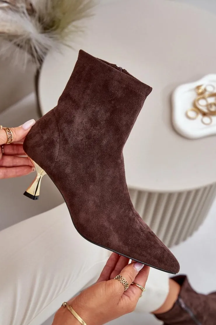 Stylowe botki damskie na ozdobnej szpilce to elegancki dodatek, który z pewnością przyciągnie spojrzenia. Wykonane z eko zamszu. Zapinane na zamek, który zapewnia wygodę i łatwość zakładania. Noski w szpic dodają wyrafinowanego charakteru, podkreślając kobiecość i smukłość sylwetki. Idealne na specjalne okazje, jak i do codziennych stylizacji, kiedy chcesz dodać sobie odrobinę elegancji. Przy wyborze rozmiaru prosimy sugerować się tabelą rozmiarów.