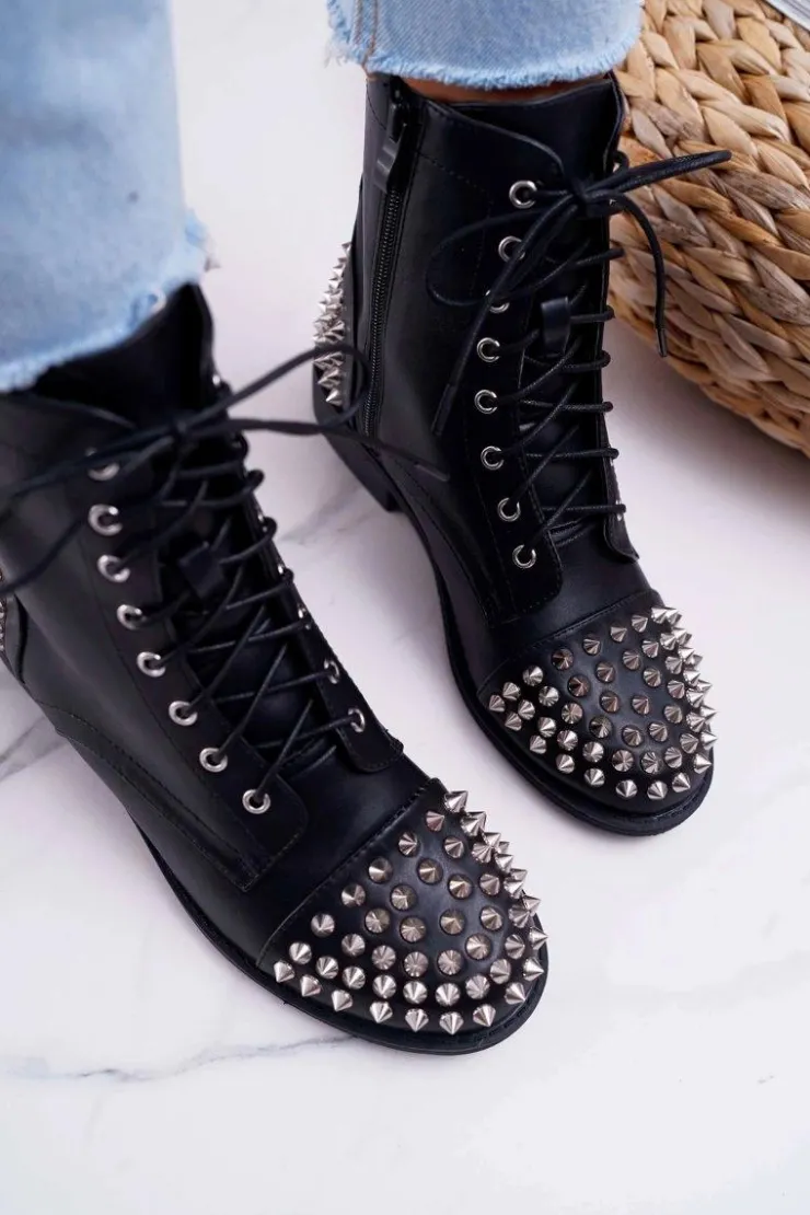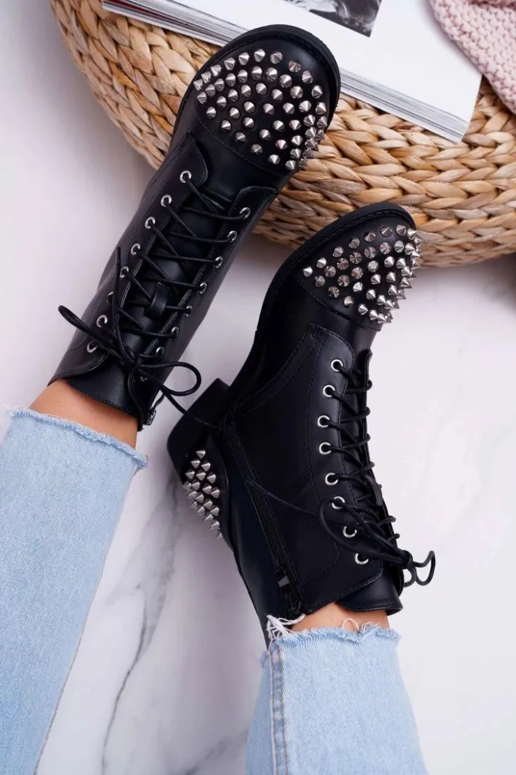 Najnowsza kolekcja rockowych botków z ćwiekami! Klasyczny, czarny kolor to must have takich stylizacji, a kolce na nosku oraz na pięcie dodają niesamowitego charakteru. Środek ocieplany kocem obuwniczym. Zakładanie ułatwia wszyty z boku zamek. Przy wyborze rozmiaru prosimy sugerować się tabelą rozmiarów.