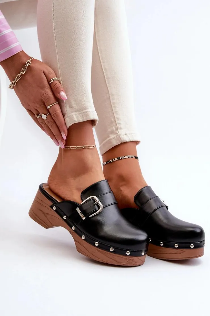Lekkie klapki osadzone na obcasie i platformie, co nadaje im subtelny wyraz. Na cholewce pasek z klamrą oraz ozdobne ćwieki wokół podeszwy. Wykonane z eko skóry, zarówno cholewka, jak i wkładka gwarantują trwałość i komfort noszenia. Ten model świetnie komponuje się z codziennymi stylizacjami, dodając im nuty szyku i wyrafinowania. Przy wyborze rozmiaru prosimy sugerować się tabelą rozmiarów.