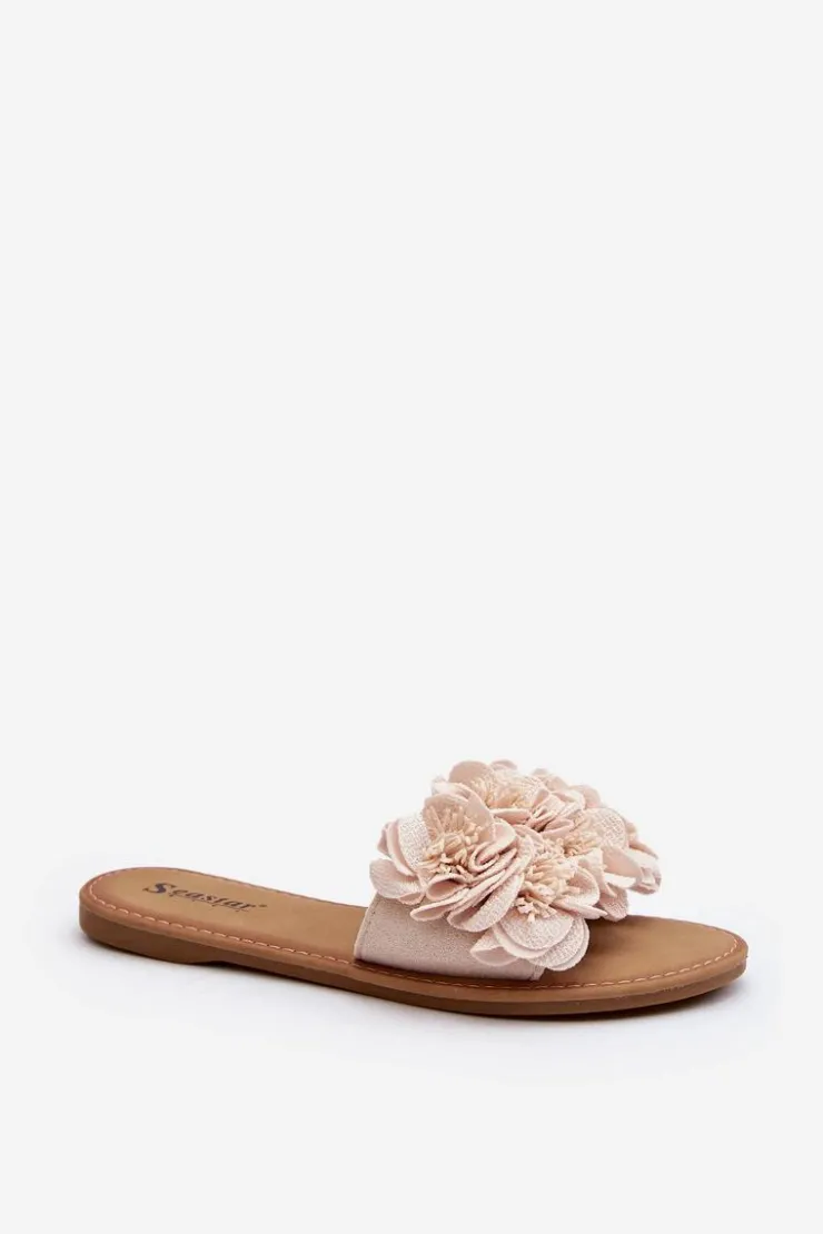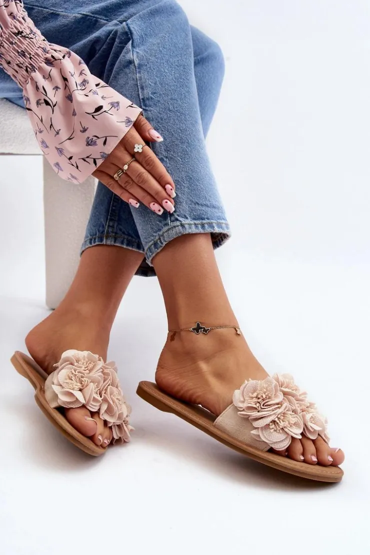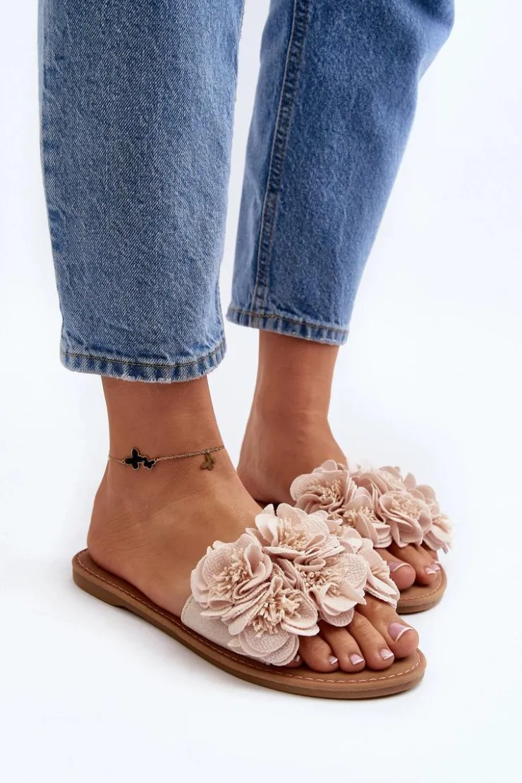 Te urocze klapki to doskonały dodatek do Twojej letniej garderoby. Ich płaski obcas zapewnia wygodę podczas noszenia, co sprawia, że są idealne na letnie spacery czy spotkania ze znajomymi. Przód ozdobiony kwiatkami z tkaniny nadaje im delikatności i dziewczęcego uroku, co doskonale komponuje się z letnim klimatem. Dodatkowo miękka wkładka z eko skóry zapewnia wygodę i komfort podczas użytkowania, nawet przez dłuższy czas. Przy wyborze rozmiaru prosimy sugerować się tabelą rozmiarów.