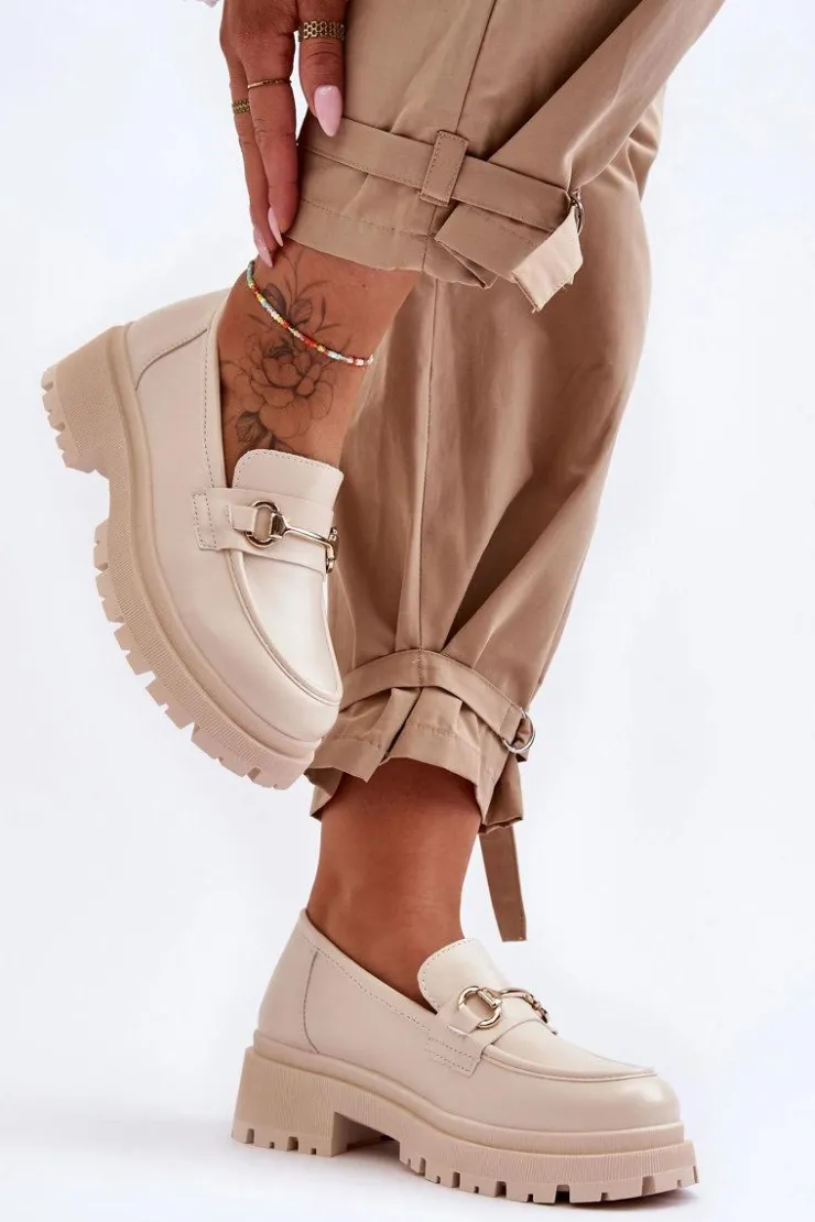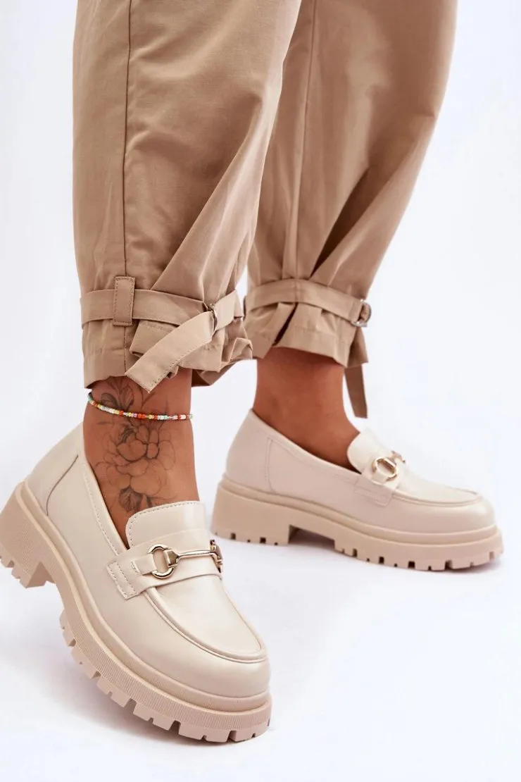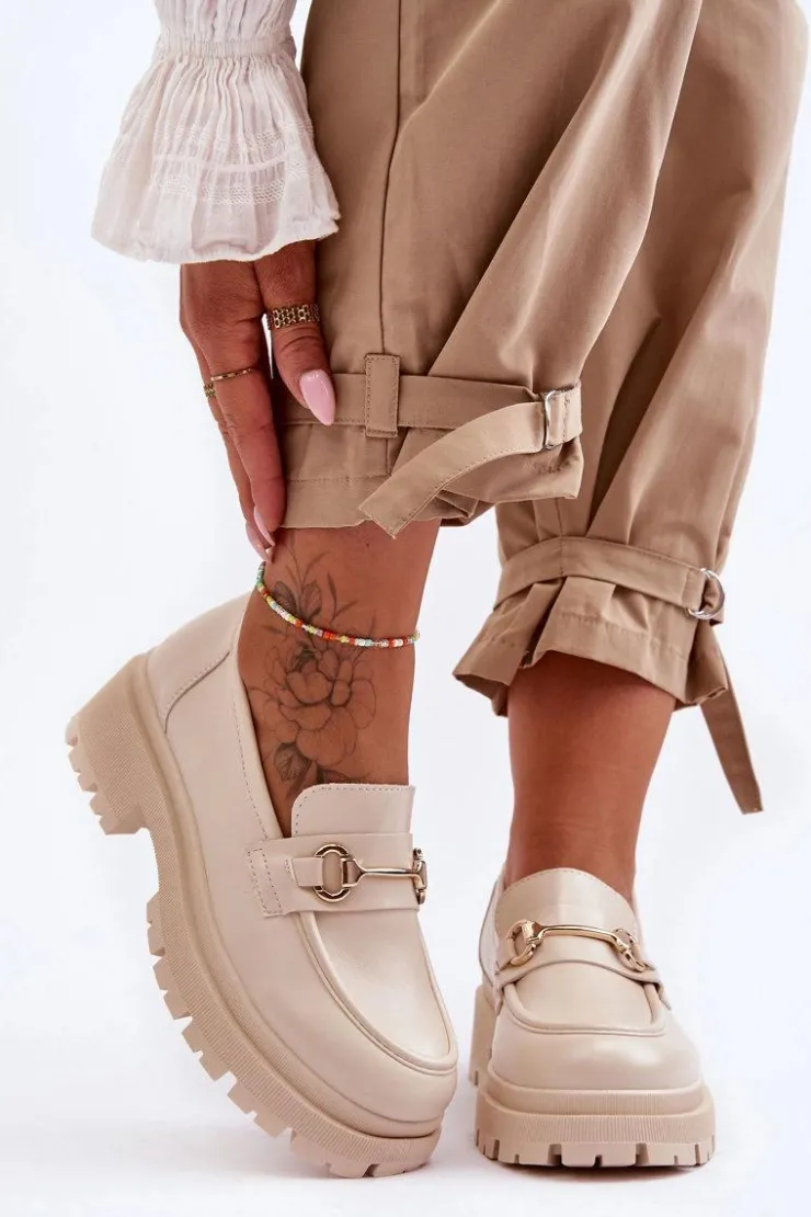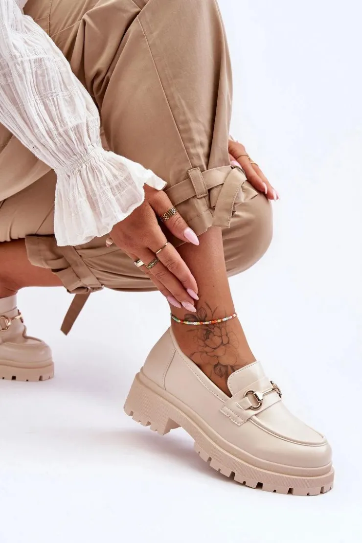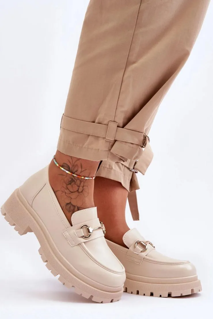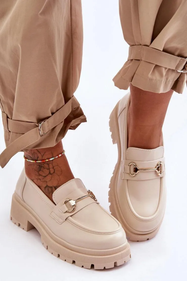 Te cudowne, damskie mokasyny osadzono na masywnej platformie i płaskim obcasie. Świetnie wpasują się w wiele stylizacji wiosenno-jesiennych. Mokasyny zostały wykonane z eko skóry. Posiadają delikatnie usztywniany zapiętek oraz miękką wkładkę. Na pasku z przodu znajduje się ozdoba z tworzywa sztucznego. Przy wyborze rozmiaru prosimy sugerować się tabelą rozmiarów.
