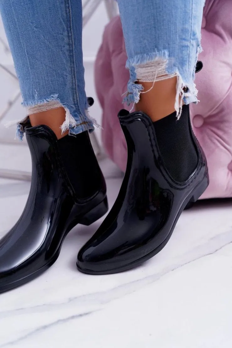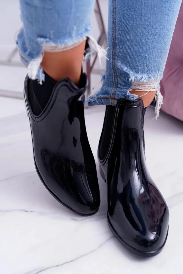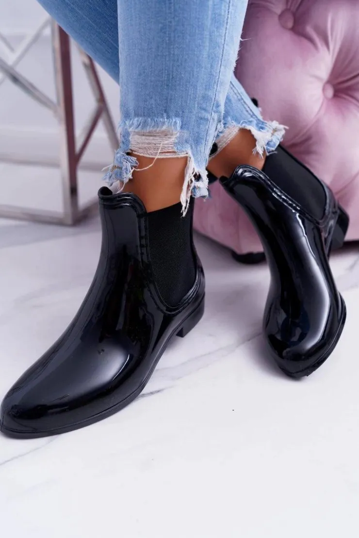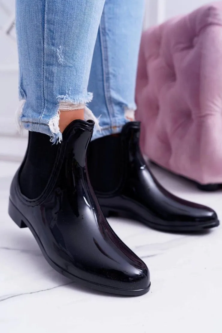 New Boto Damskie Lakierowane Wsuwane Czarne Kalosze Pola