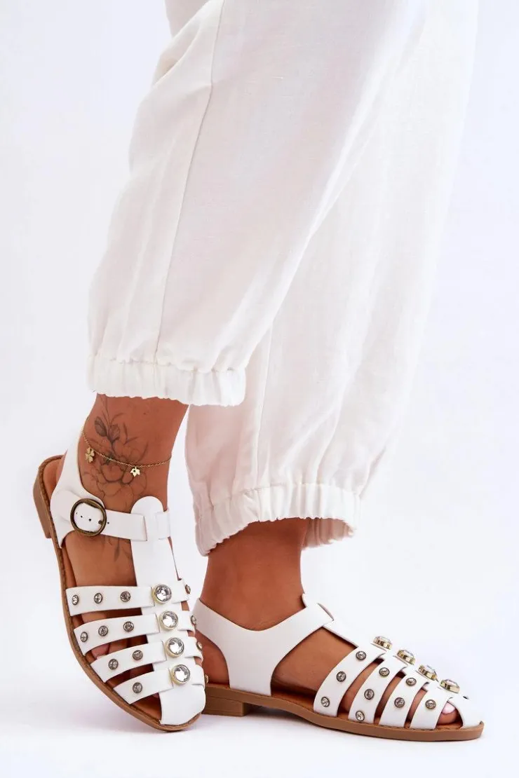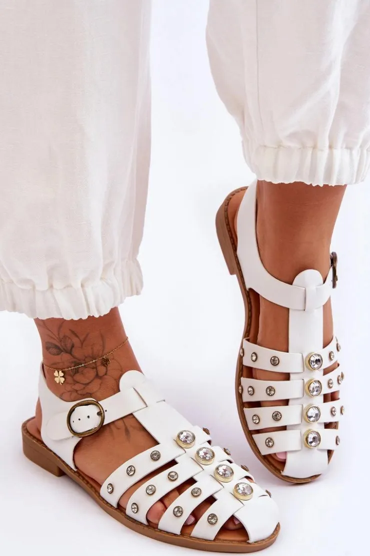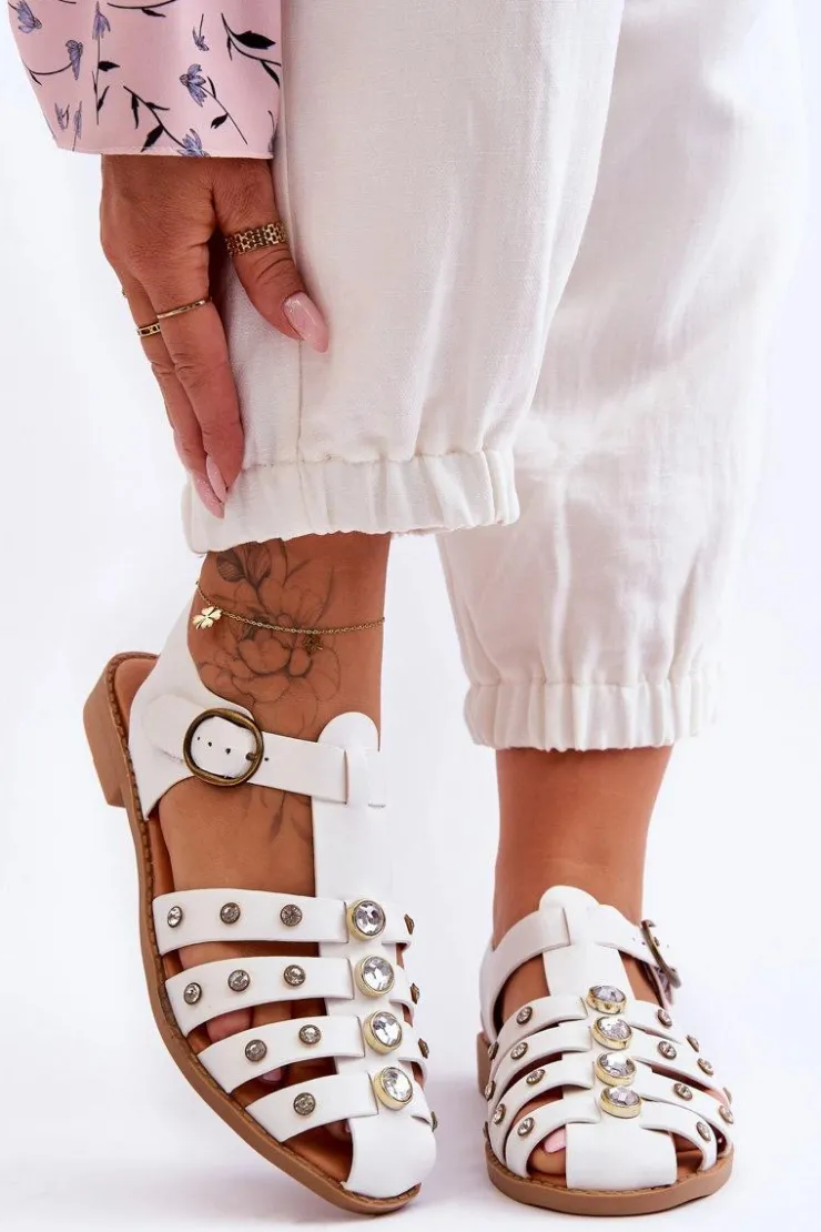 Sandały damskie zostały wykonane z eko skóry. Model ten posiada ozdobne dżety na całości cholewki imitujące cyrkonie. Klasycznie zapinane na regulowany pasek ze sprzączką. Wkładka jest miękka i wygodna podczas użytkowania. Ten niezwykle przewiewny model idealnie sprawdzi się na letnie, upalne dni! Sandałki osadzono na płaskim obcasie z antypoślizgową podeszwą. Przy wyborze rozmiaru prosimy sugerować się tabelą rozmiarów.