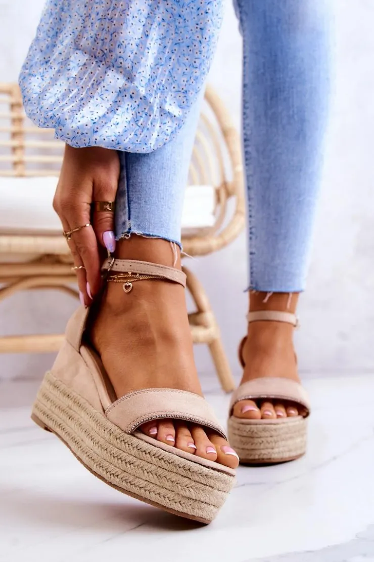 Sandały na koturnie zostały wykonane z eko zamszu. Posiadają paseczek z ozdobą imitującą cyrkonie. Stabilny koturn oraz platforma zdobiona jutowym warkoczem. Zapinane wokół kostki na sprzączkę z regulowanym paskiem. Eko skórzana wkładka zapewni komfort przez cały dzień. Podeszwa wykonana z gumowego tworzywa, która jest antypoślizgowa. Uzupełnij swoje stylizacje o te wspaniałe sandały. Przy wyborze rozmiaru prosimy sugerować się tabelą rozmiarów.