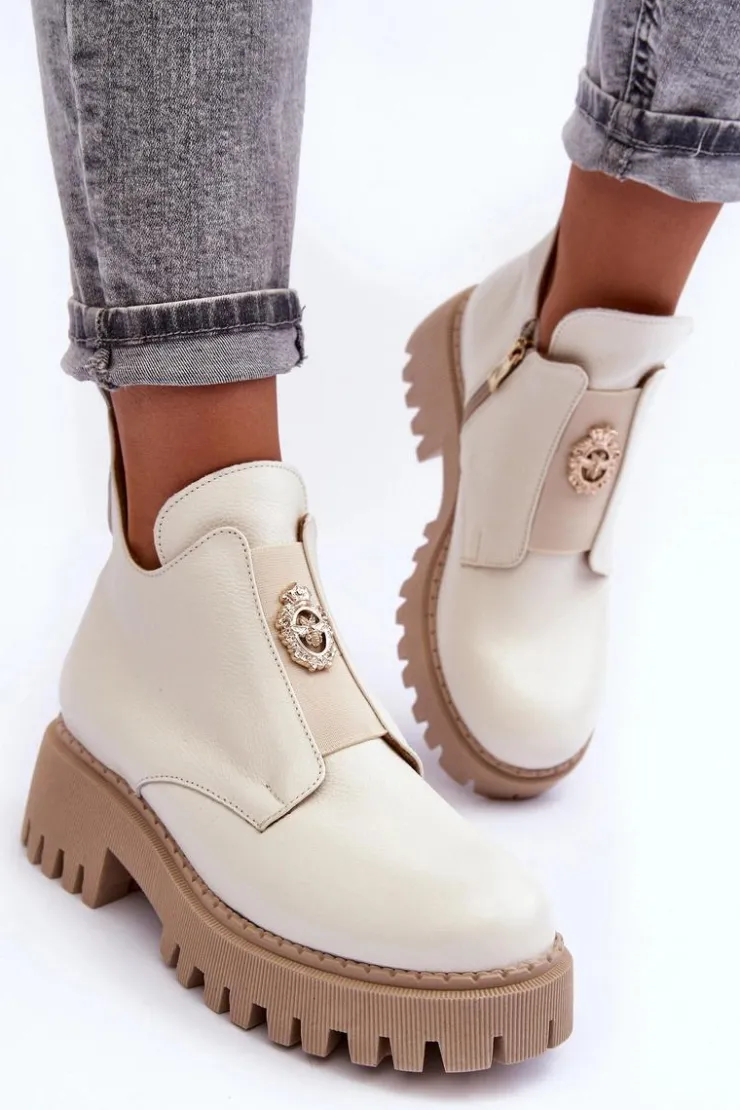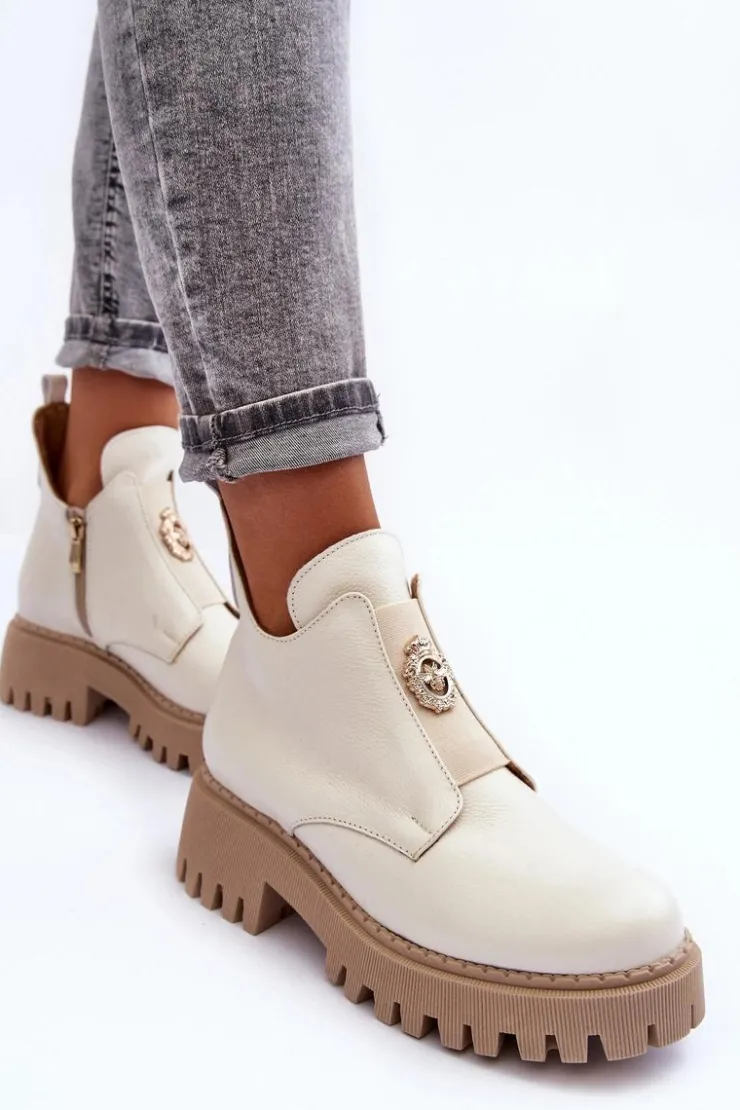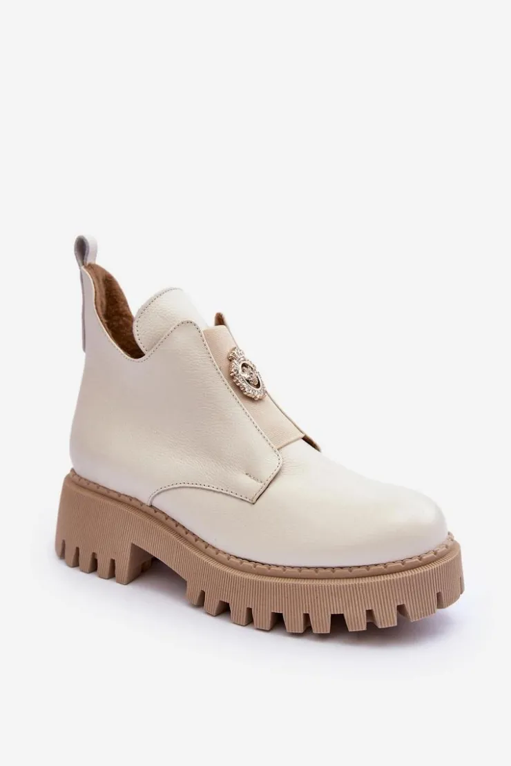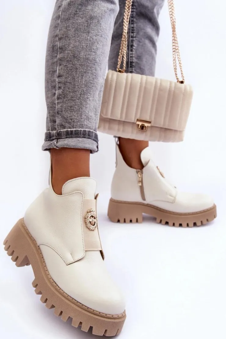 Damskie botki zostały wykonane z wysokiej jakości naturalnej skóry. Osadzone na masywnym obcasie i platformie ze żłobieniami. Model zapinany na suwak po wewnętrznej stronie cholewki. Z przodu na elastycznej wstawce znajduje się ozdoba z tworzywa sztucznego. Wnętrze ocieplone kocem obuwniczym. Ten wyjątkowy model wzbogaci wiele Twoich stylizacji! Przy wyborze rozmiaru prosimy sugerować się tabelą rozmiarów.