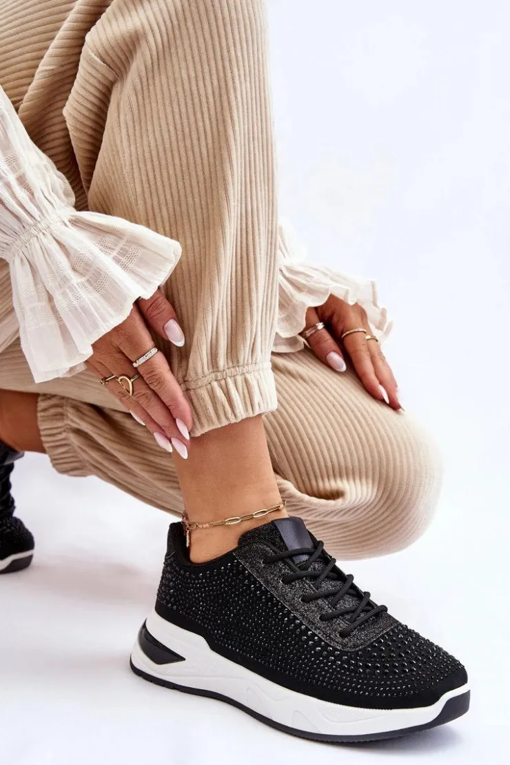 Klasyczne, damskie buty sportowe zostały wykonane z materiału tekstylnego. Dodatkowo posiadają zdobienia w postaci dżetów imitujących cyrkonie. Zostały osadzone na platformie. Model ten posiada klasyczne sznurowanie. Miękka wkładka wykonana z materiału zapewni wygodę podczas użytkowania. Koniecznie powinnaś je mieć! Przy wyborze rozmiaru prosimy kierować się tabelą rozmiarów.