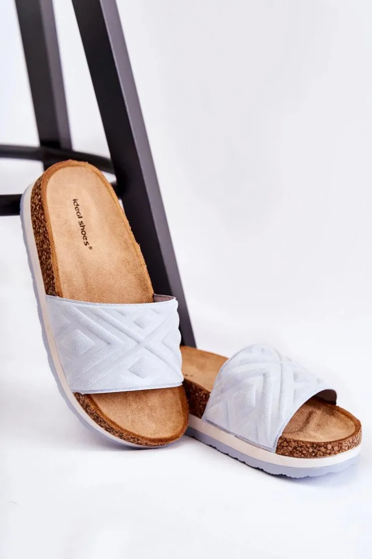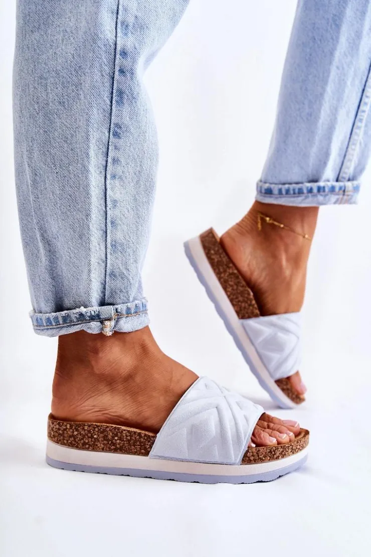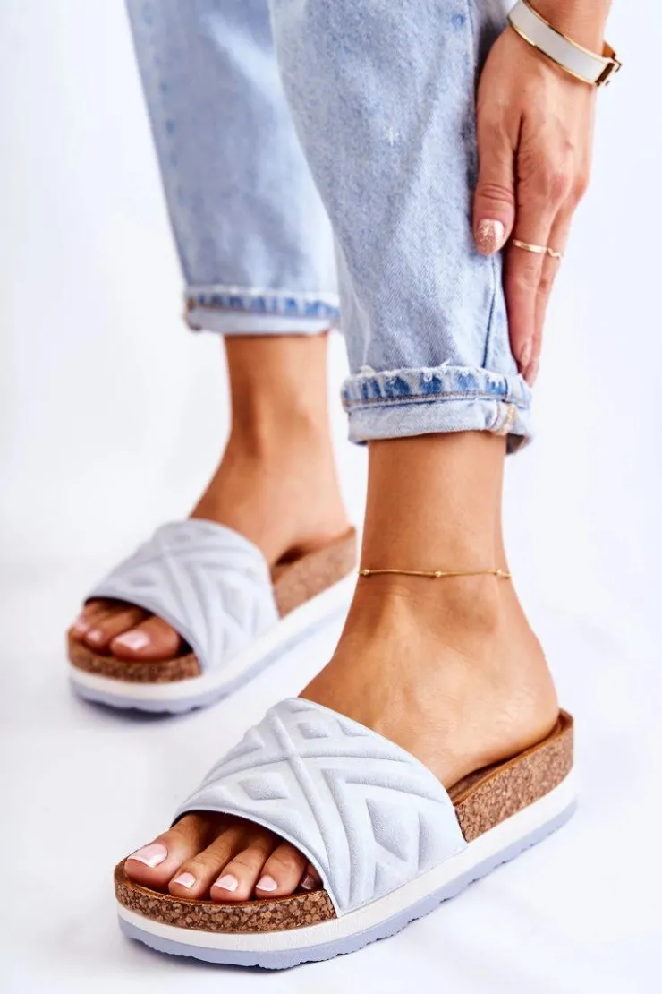 Modne klapki damskie wykonane z miłego w dotyku eko zamszu. Model osadzone na masywnej korkowej platformie z podeszwą z tworzywa sztucznego. Wkładka jest profilowana i także wykonana z eko zamszu, która zapewni komfort podczas użytkowania. Model z odkrytym noskiem. Świetny fason na upalne dni, który powinnaś mieć w swojej szafie! Przy wyborze rozmiaru prosimy sugerować się tabelą rozmiarów.