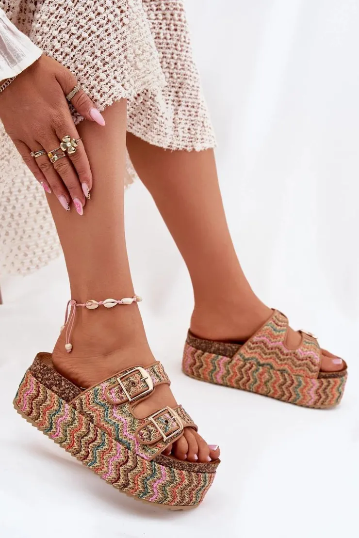 Klapki damskie z plecionką, osadzone na masywnej platformie, to modna i komfortowa propozycja na ciepłe dni. Posiadają dwa regulowane paski z klamrami, które pozwalają na idealne dopasowanie do stopy. Profilowana wkładka zapewnia wygodę przez cały dzień. Doskonałe do letnich stylizacji, łączą funkcjonalność z nowoczesnym wyglądem. Przy wyborze rozmiaru rosimy sugerować się tabelą rozmiarów.