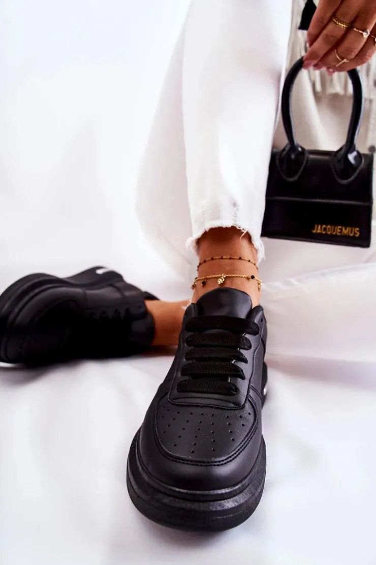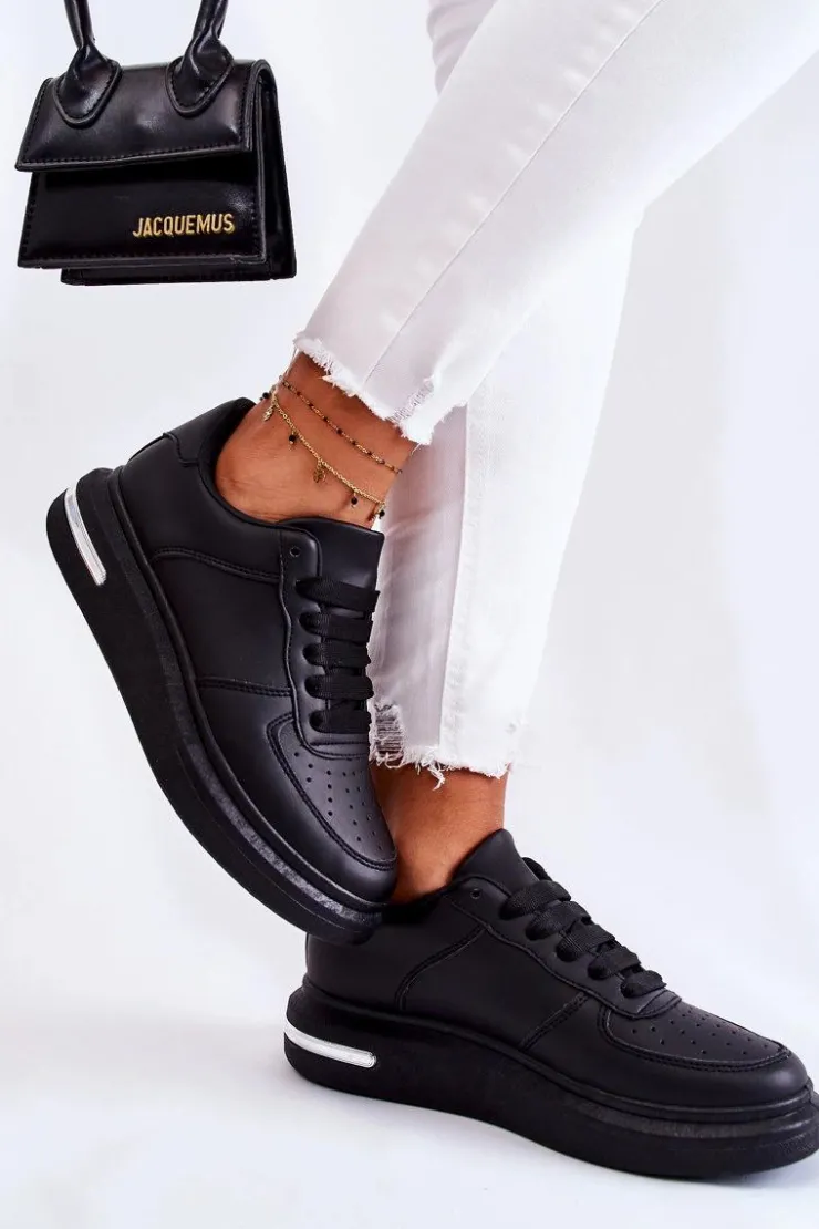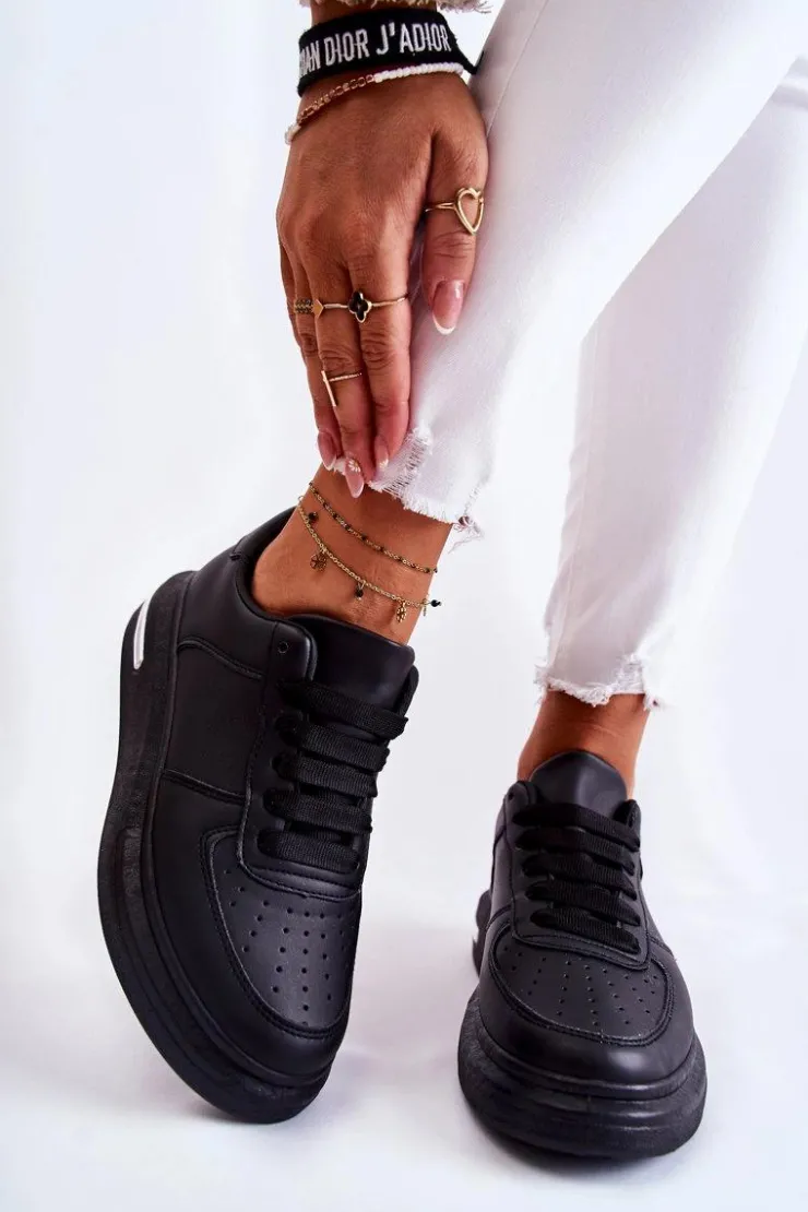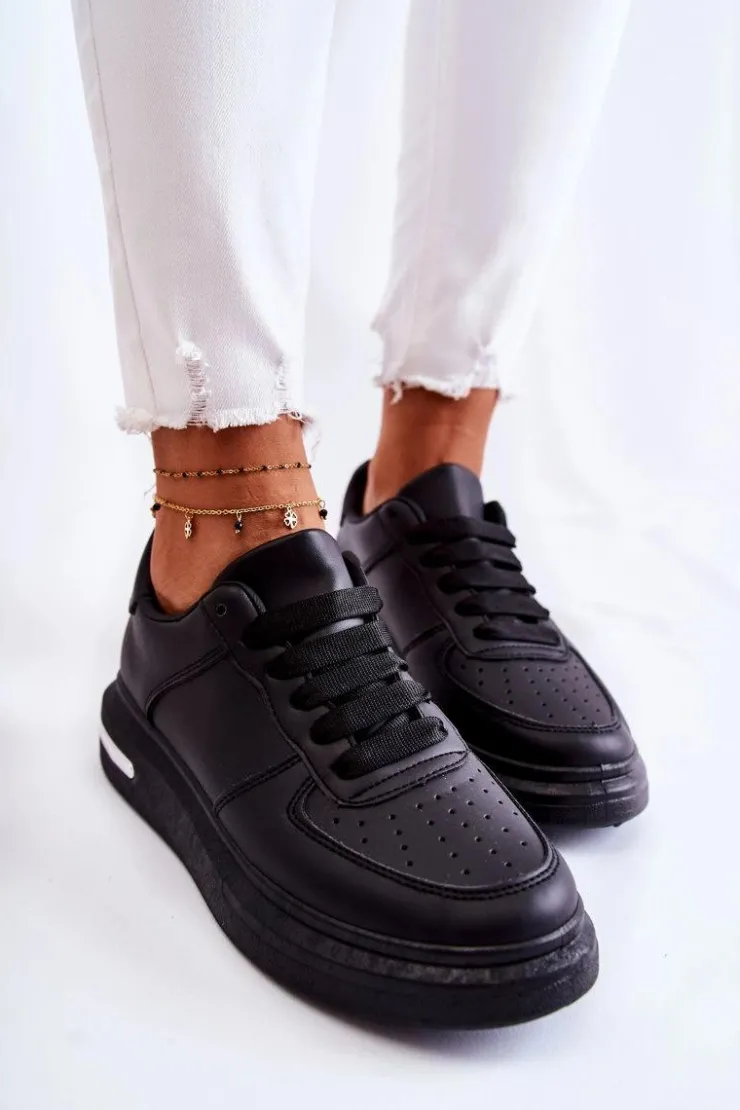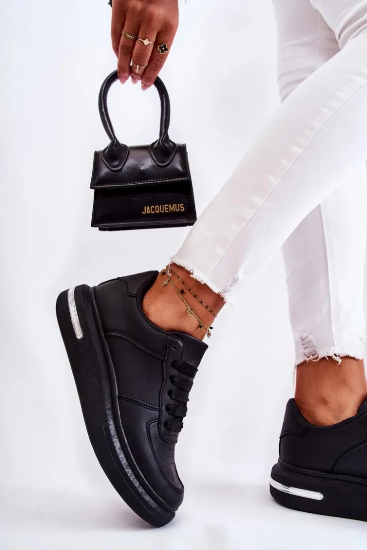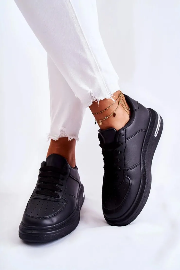 Klasyczne buty sportowe zostały wykonane z eko skóry. Osadzone na masywnej platformie z lustrzanym elementem. Model wiązany na płaskie sznurowadła. Miękka wkładka wykonana z pianki została pokryta tkaniną. Model z perforacją na przodzie, co pozwala na odpowiednią cyrkulację powietrza. Nosek zaokrąglony. Koniecznie powinnaś je mieć w swojej szafie! Przy wyborze rozmiaru prosimy kierować tabelą rozmiarów.