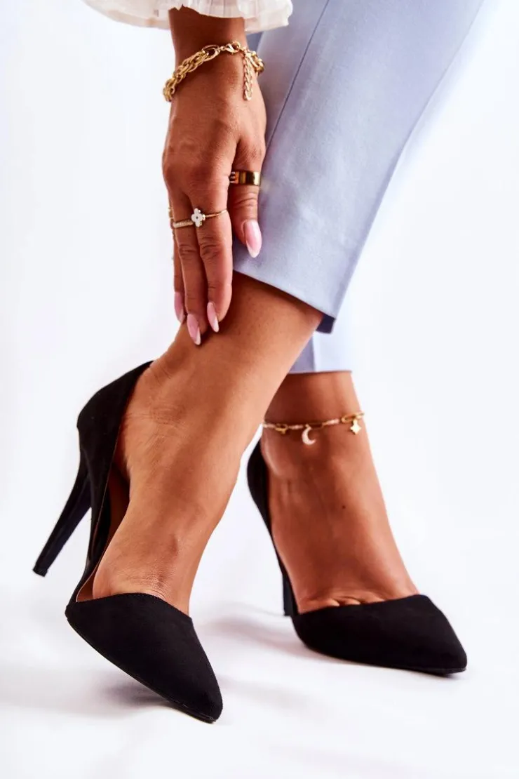 Klasyczne szpilki zostały wykonane z eko zamszu. Posiadają subtelne wycięcia po bokach cholewki. Zapiętek jest dodatkowo usztywniany z gumką. Buty zostały osadzone na obcasie w postaci szpilki. Nosek w szpic. Wygodna wkładka została wykonana z eko skóry. Model idealny na różnego rodzaju uroczystości. Koniecznie powinnaś je mieć w swojej garderobie! Przy wyborze rozmiaru prosimy sugerować się tabelą rozmiarów.