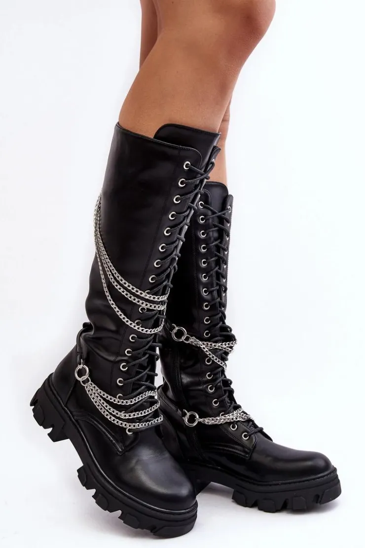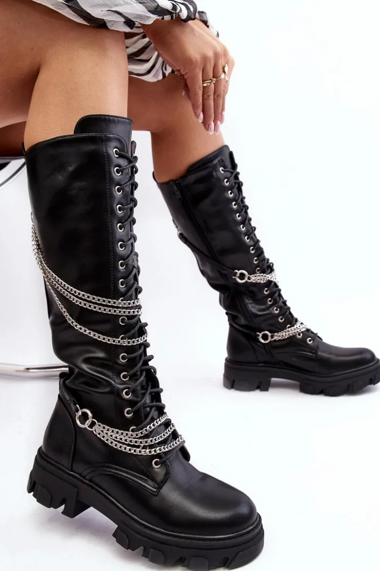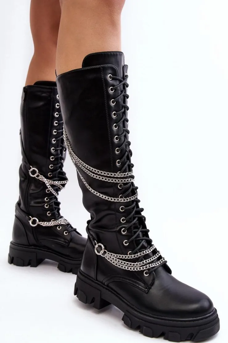 New Boto Kozaki Glany Damskie Z Łańcuchami Czarne Lannera