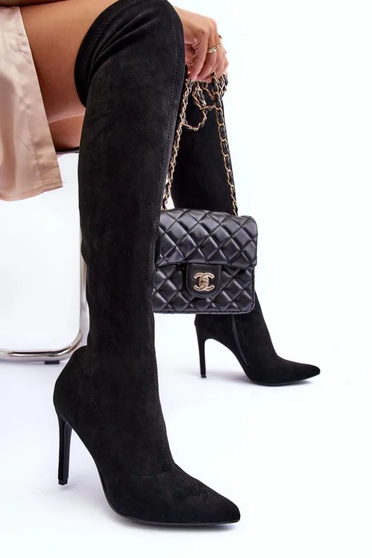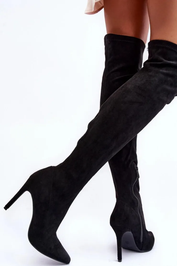 Modne kozaki za kolano zostały wykonane z eko zamszu. Zapinane na suwak w dolnej części cholewki. Obcas w postaci szpilki. Wnętrze ocieplone na wysokości stopy. Zapiętek usztywniony, noski w szpic. Koniecznie musisz mieć ten model w swojej garderobie! Przy wyborze rozmiaru prosimy kierować tabelą rozmiarów.