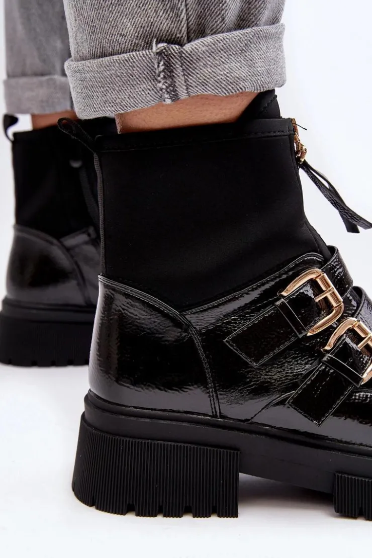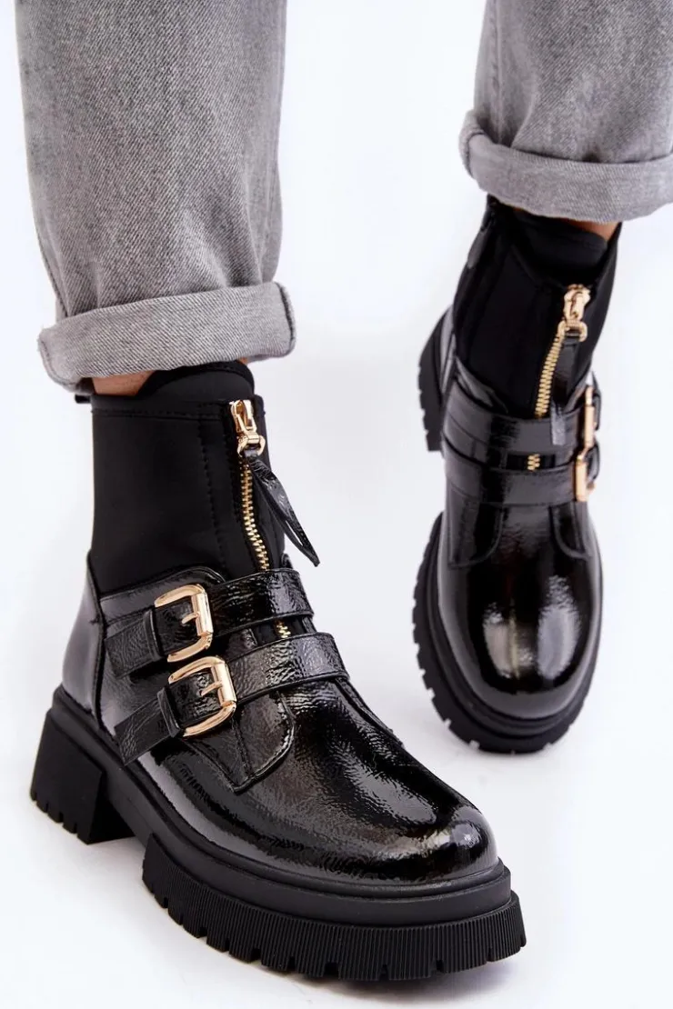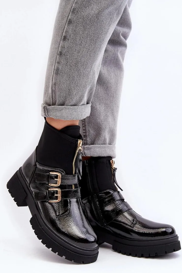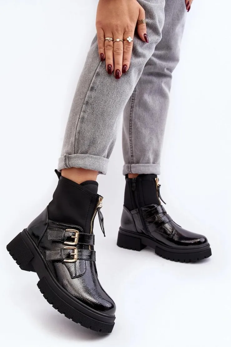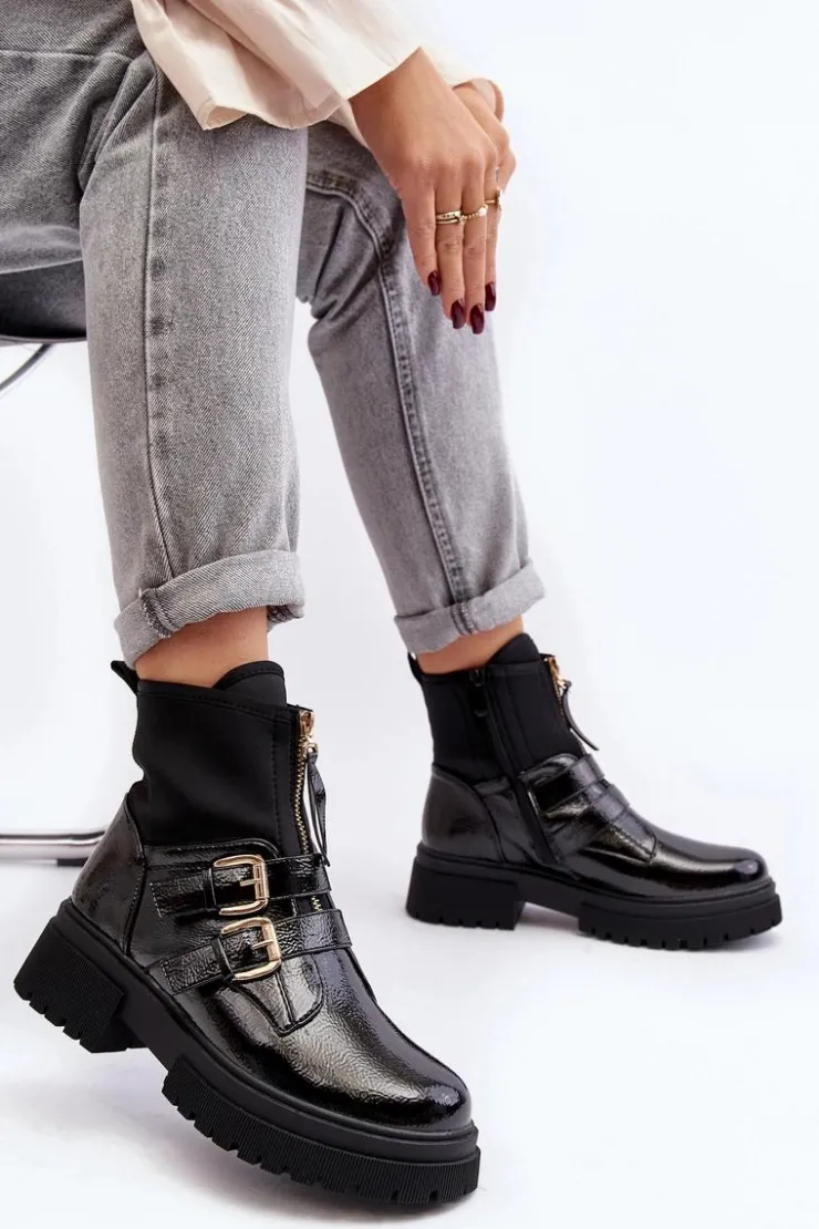 New Boto Lakierowane Botki Damskie Na Płaskim Obcasie Czarne Rellisa