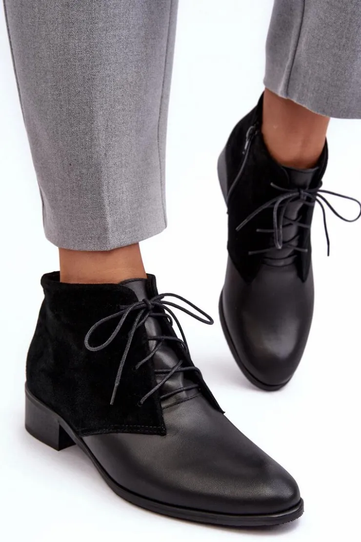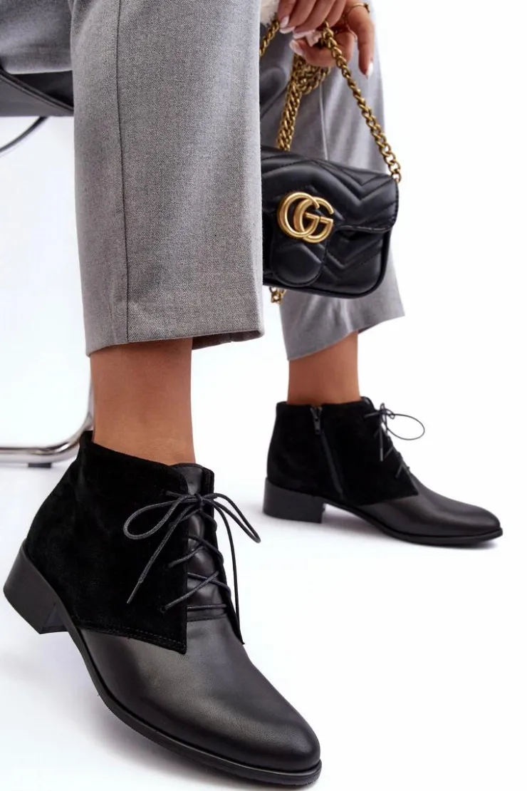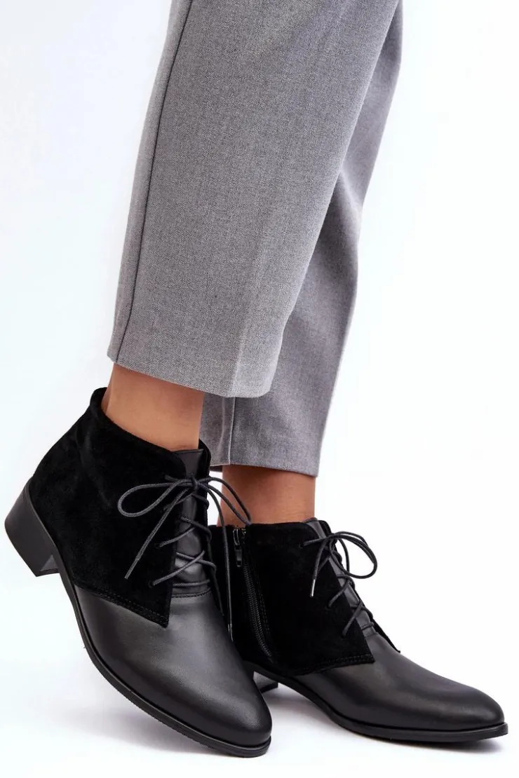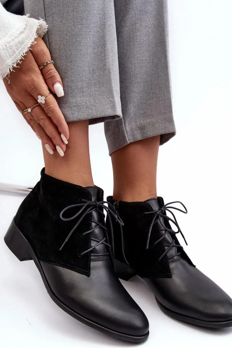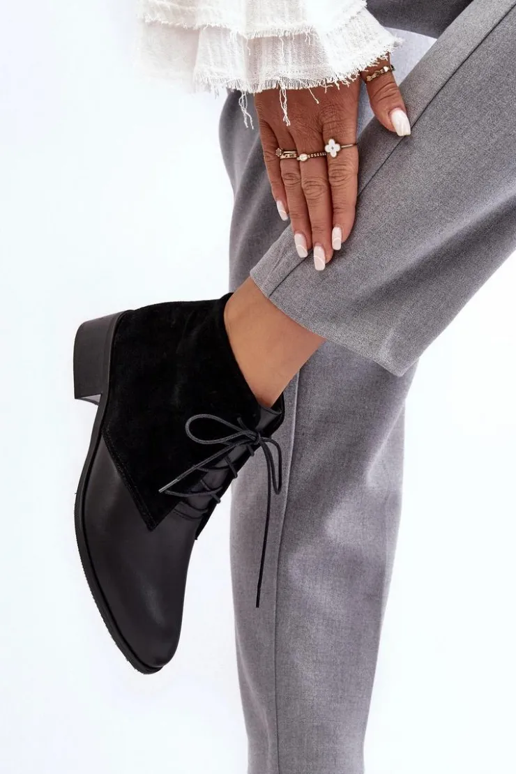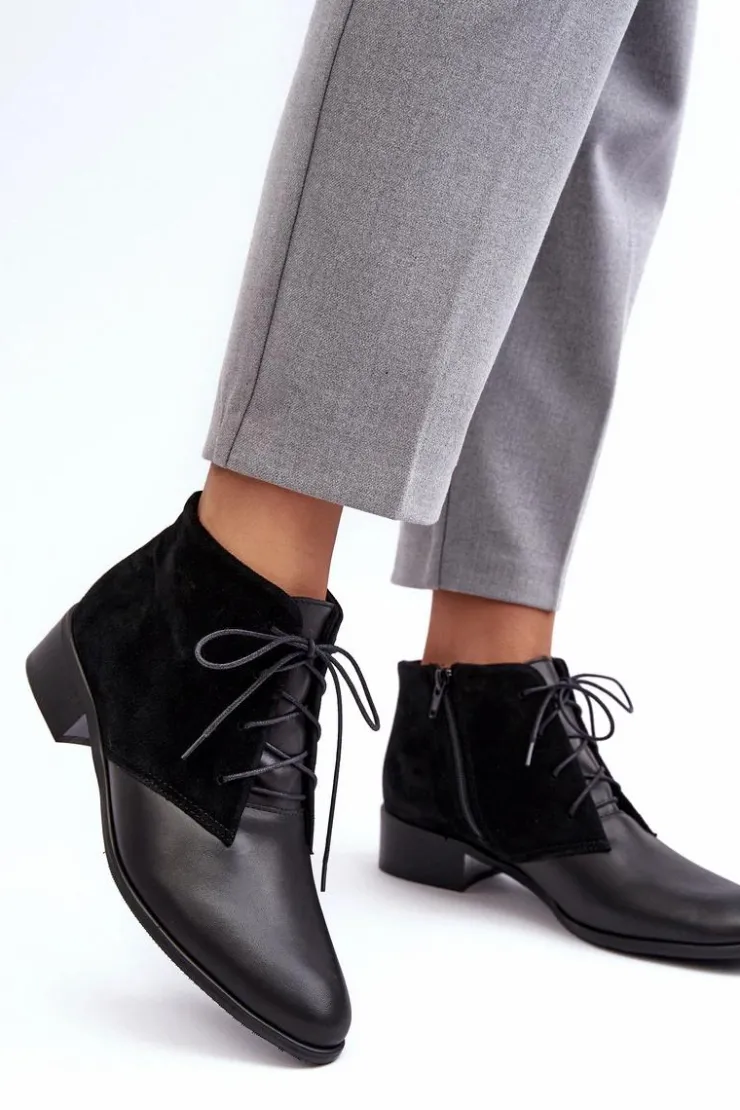Modne, damskie botki od polskiego producenta zostały wykonane z wysokiej jakości naturalnej skóry z dbałością o szczegóły. Ten ocieplany kocem obuwniczym model zapewni wygodę i ciepło w chłodniejsze dni. Osadzono je na niskim, płaskim obcasie. Botki są sznurowane, ale także zapinane z boku cholewki na suwak. Dodatkowo posiadają usztywniany zapiętek. Przy wyborze rozmiaru prosimy sugerować się tabelą rozmiarów.