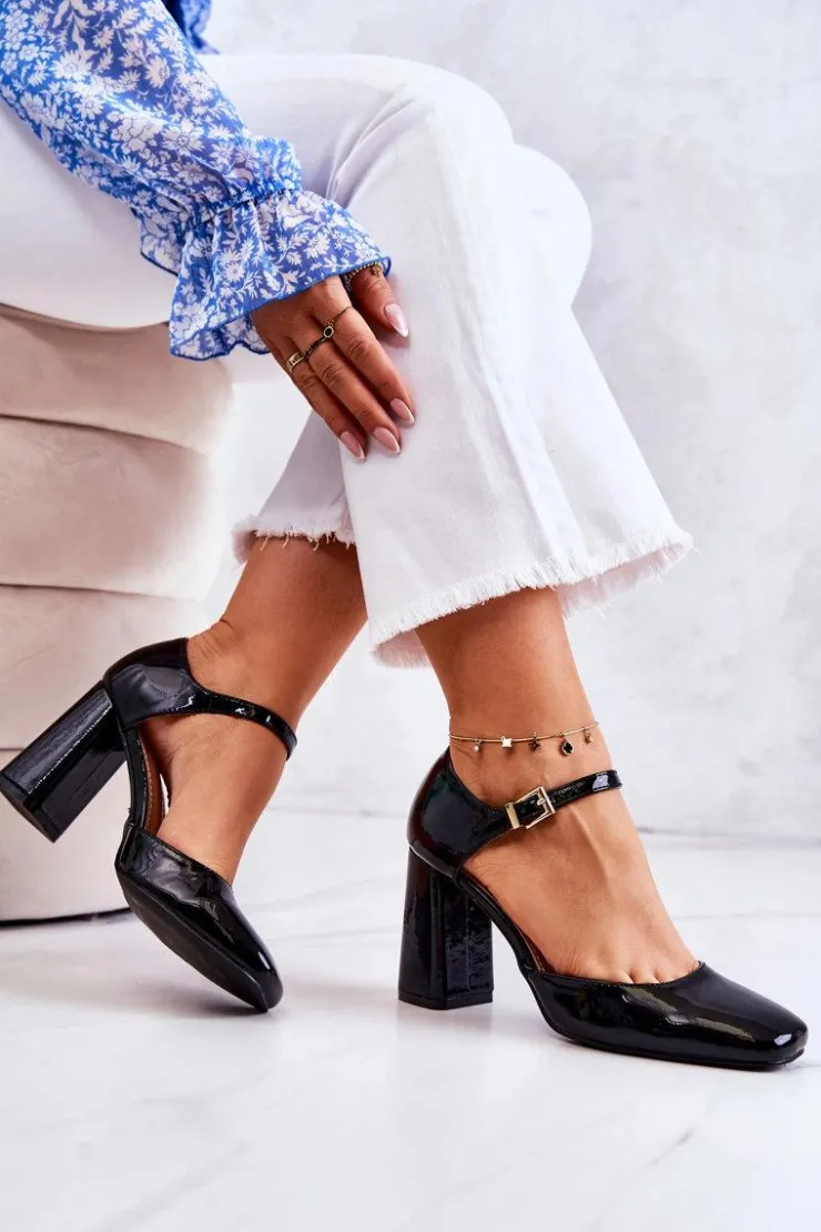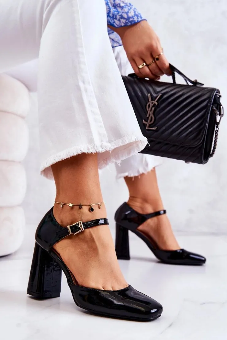 Klasyczne czółenka wykonane z lakierowanej eko skóry. Pięknie prezentują się na nodze. Obcas w postaci stabilnego słupka. Zapinane wokół kostki na regulowany pasek ze sprzączką. Nosek zakryty, kwadratowy. Miękka, wykonana z eko skóry wkładka zapewni komfort na każdym kroku. Modne i stylowe czółenka doskonale będą komponować się z eleganckimi, szerokimi spodniami czy z sukienką o fasonie marynarki. Uniwersalność, elegancja i wygoda – te cechy idealnie określają ten model czółenek! Przy wyborze rozmiaru prosimy kierować się tabelą rozmiarów