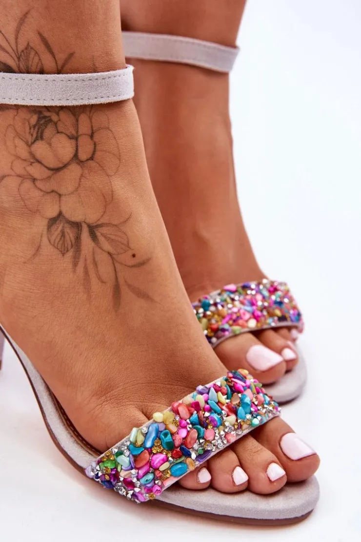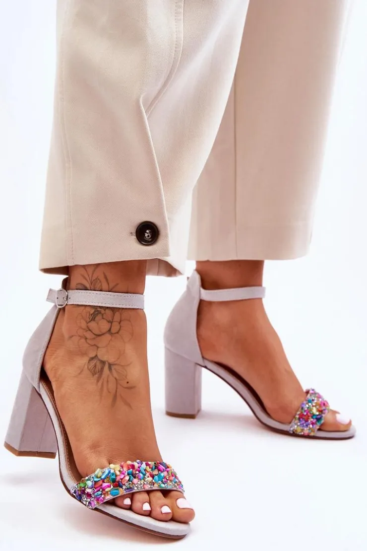 Modne sandały damskie zostały wykonane z miłego w dotyku eko zamszu. Osadzone na obcasie w postaci słupka. Paseczek na przodzie został ozdobiony modnymi kamieniami, co dodaje tym butom elegancji. Miękka wkładka z eko skóry zadba o Twój komfort podczas użytkowania. Model ten świetnie sprawdzi się na różnego rodzaju ważnych uroczystościach czy spotkaniach biznesowych. Przy wyborze rozmiaru prosimy sugerować się tabelą rozmiarów.