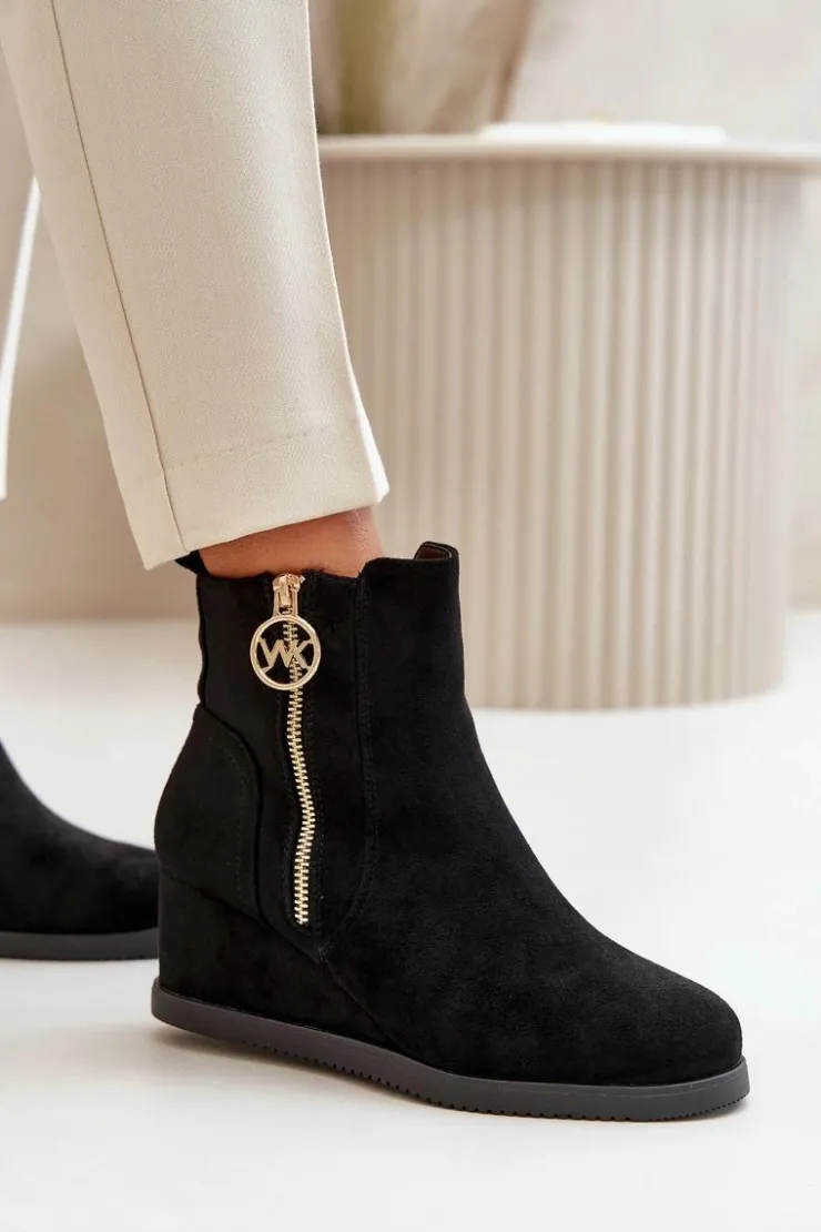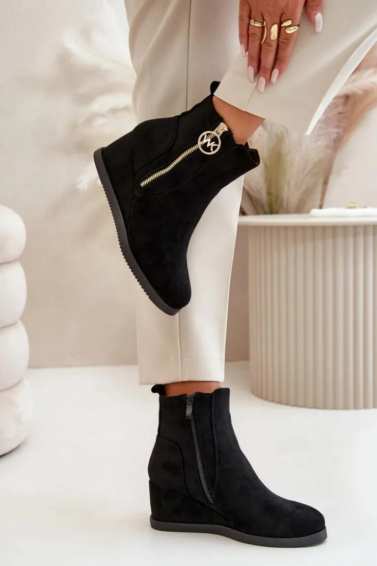Botki damskie wykonane z eko zamszu, prezentują się elegancko i nowocześnie, idealnie wpisując się w różnorodne stylizacje. Zamek umieszczony po wewnętrznej stronie ułatwia szybkie i wygodne zakładanie oraz zdejmowanie. Osadzone na stabilnym koturnie, zapewniają komfort podczas chodzenia, a także subtelnie dodają centymetrów do wzrostu. Zapiętek został usztywniony dla dodatkowego wsparcia, a zaokrąglone noski dodają butom klasycznego uroku. Wnętrze butów jest ocieplone kocem obuwniczym, co gwarantuje ciepło i komfort nawet w najchłodniejsze dni. Przy wyborze rozmiaru prosimy sugerować się tabelą rozmiarów.