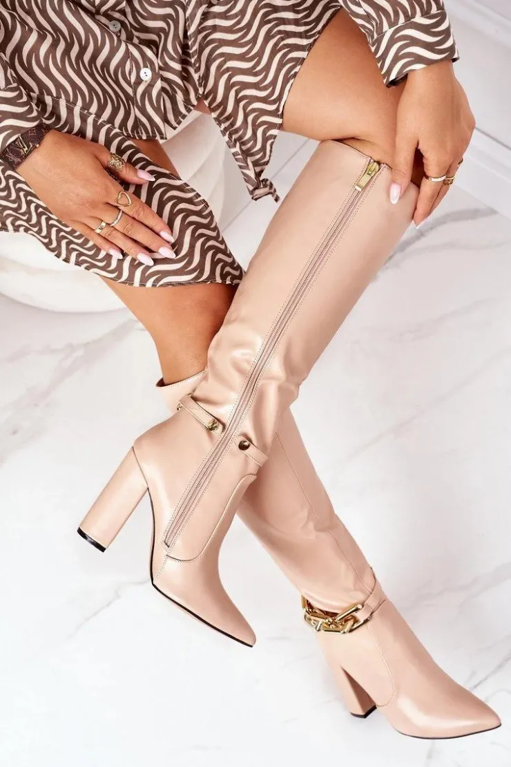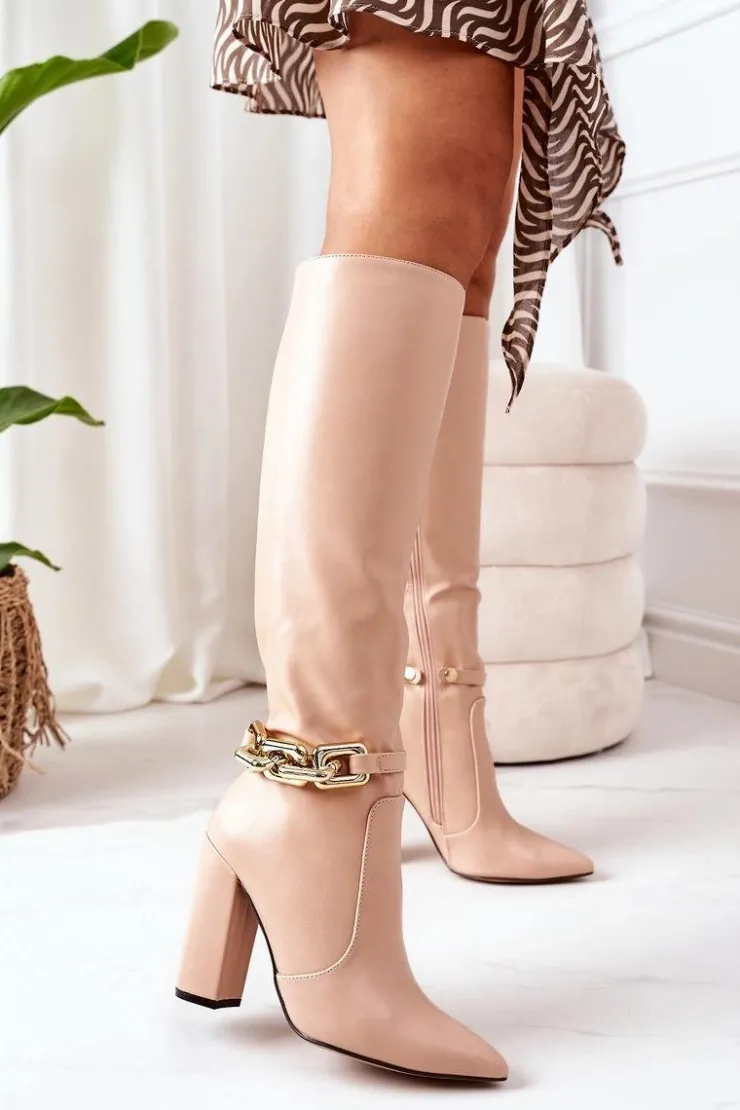 Piękne kozaki na słupku z noskiem w szpic. Cholewka wykonana jest ze skóry ekologicznej. Złoty łańcuch jest odpinany. Przy wyborze rozmiaru prosimy sugerować się tabelą rozmiarów.