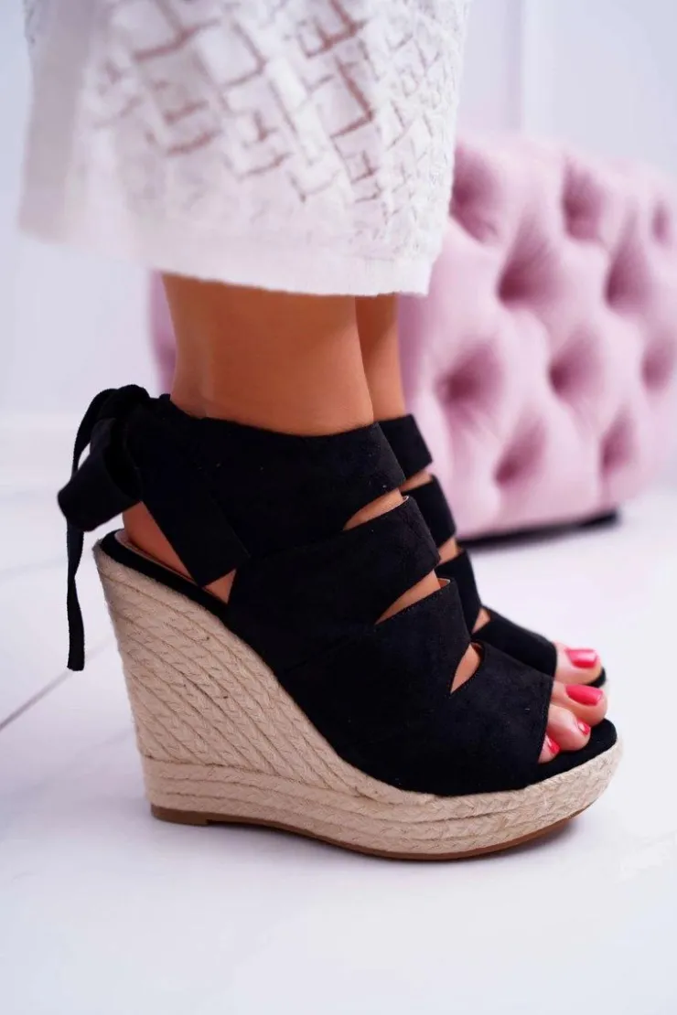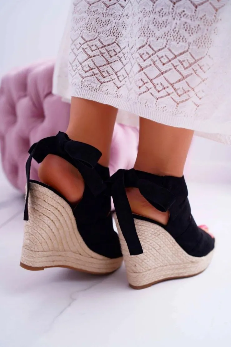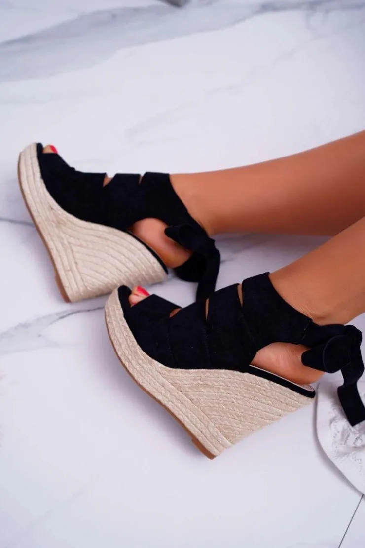 New Boto Sandały Damskie Na Koturnie Lniane Wiązane Czarne Cantare