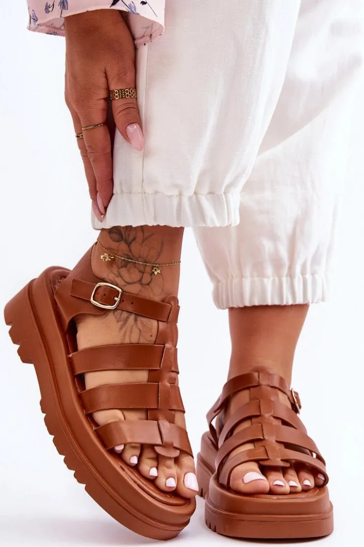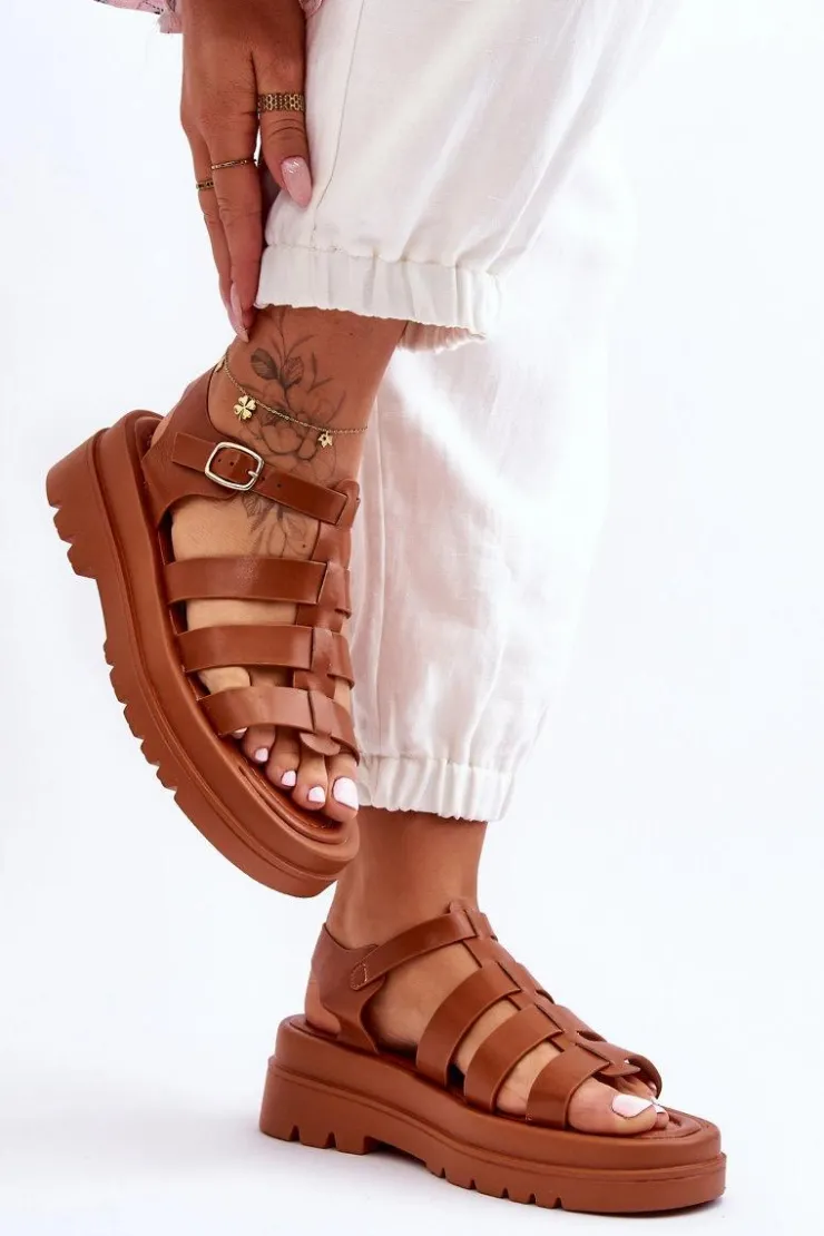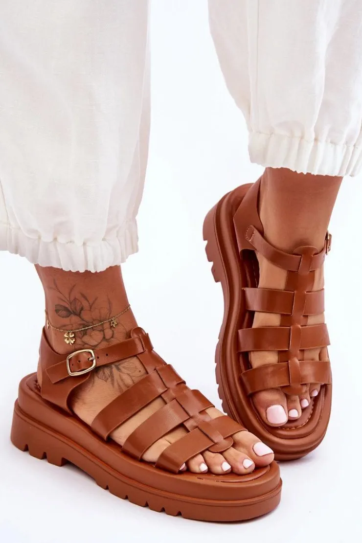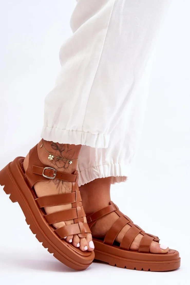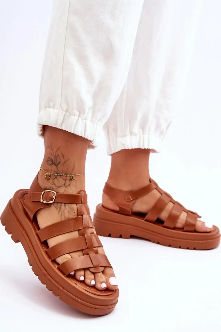 Przewiewne sandały damskie zostały wykonane z eko skóry. Zapinane na regulowany pasek ze sprzączką. Sandałki posiadają odkryty, lekko kwadratowy nosek oraz odkrytą piętę. Miękka, eko skórzana wkładka zapewni wygodę podczas użytkowania. Płaski obcas oraz platforma sprawiają, że buty są niezwykle stabilne. Te sandałki to idealny fason na upalne dni. Świetnie będą prezentować się z zarówno ze spodniami, jak i sukienkami. Przy wyborze rozmiaru prosimy sugerować się tabelą rozmiarów.