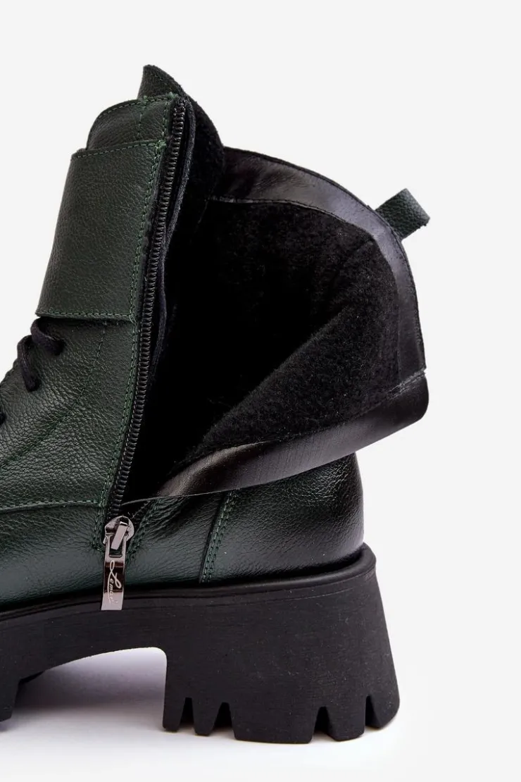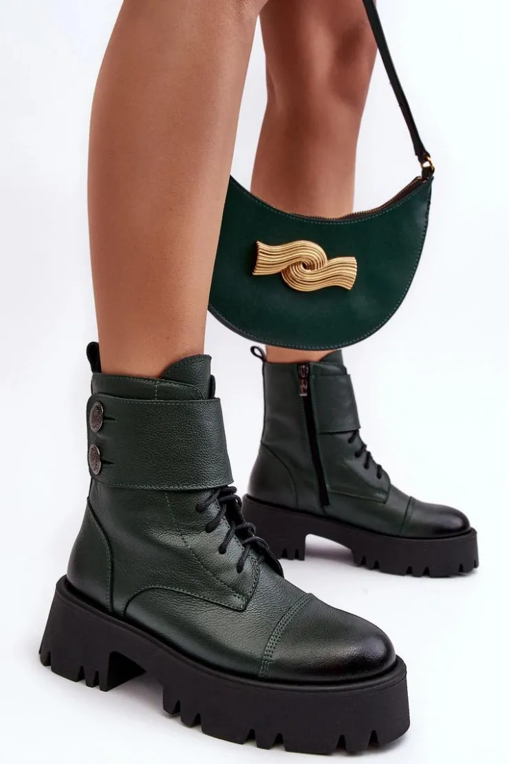 Botki damskie wykonane ze skóry naturalnej. Osadzone na masywnym, płaskim obcasie i platformie. Zapinane na suwak z boku. Cholewka ozdobiona szerokim paskiem. Wnętrze ocieplone kocem obuwniczym. Podeszwa jest antypoślizgowa. Model ten będzie pasować do wielu jesienno-zimowych stylizacji! Przy wyborze rozmiaru prosimy kierować się tabelą rozmiarów