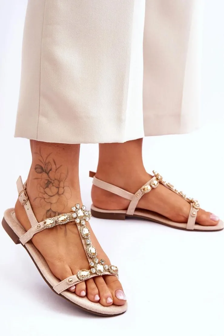 Damskie sandały zostały wykonane z eko zamszu. Paseczki posiadają zdobienia w postaci różnej wielkości kamieni oraz dżetów. Sandałki osadzono na płaskim obcasie. Model ten jest zapinany na regulowany pasek ze sprzączką i gumką. Świetny model na letni sezon! Koniecznie powinnaś je mieć! Przy wyborze rozmiaru prosimy sugerować się tabelą rozmiarów.