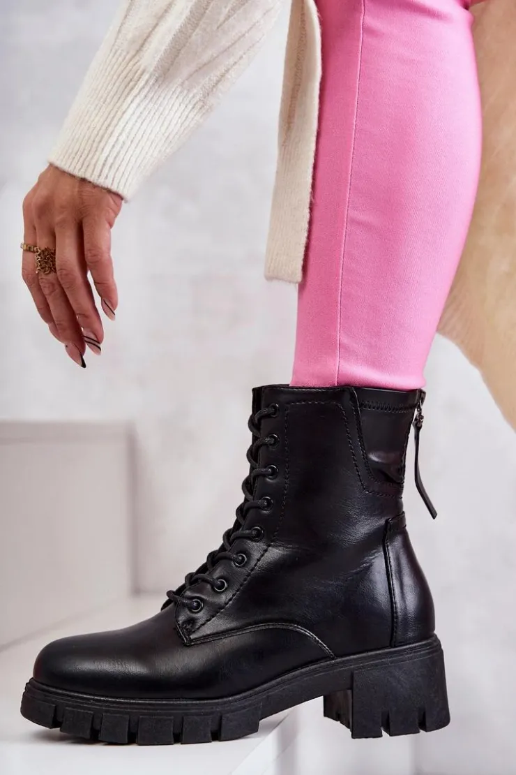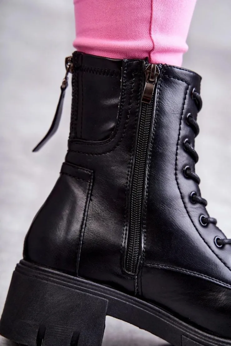 Damskie botki z wyższą cholewką za kostkę zostały wykonane z przyjemnej w dotyku eko skóry. Model ten posiada wiązanie oraz suwak. Osadzone na platformie oraz płaskim obcasie. Podeszwa jest wykonana z gumowego tworzywa. Botki posiadają w środku ocieplenie w postaci miłego w dotyku koca obuwniczego. Zapiętek usztywniany pozwoli na odpowiednią stabilizację stopy. Przy wyborze rozmiaru prosimy sugerować się tabelą rozmiarów.