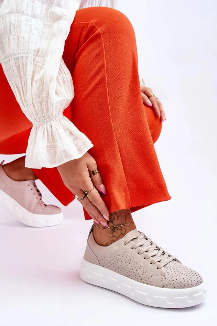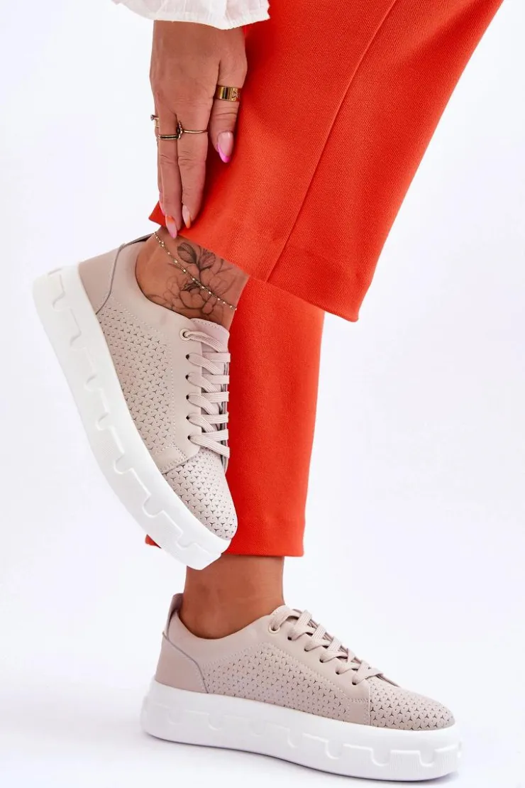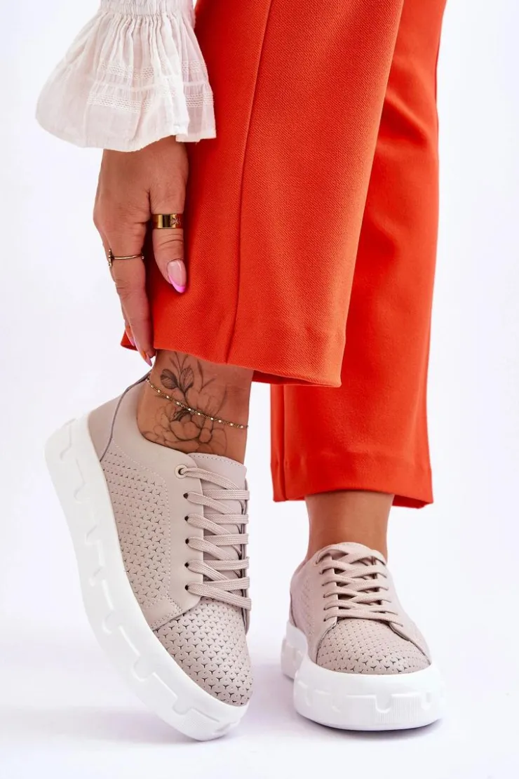 New Damskie buty S.Barski Skórzane Buty Sportowe Na Masywnej Platformie Beżowe Montigo