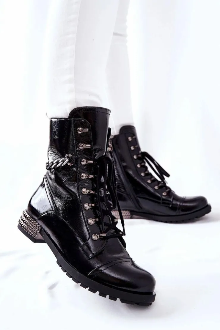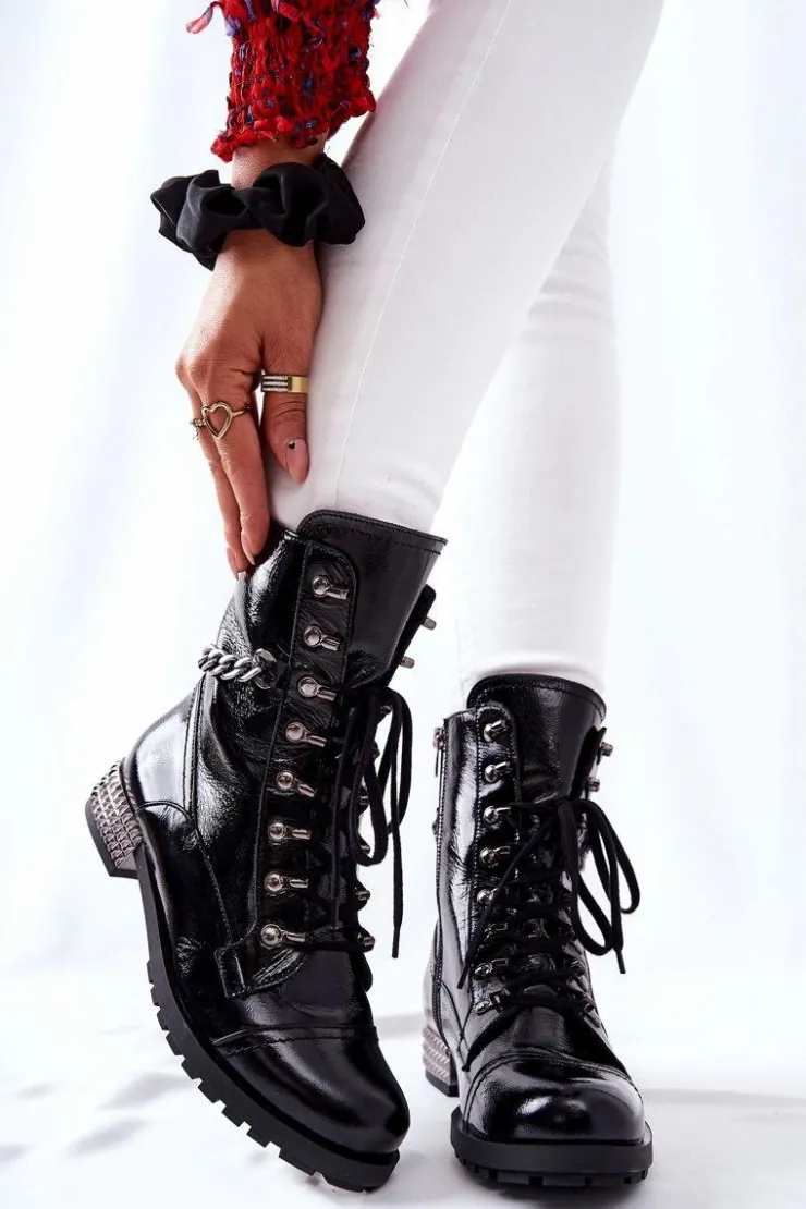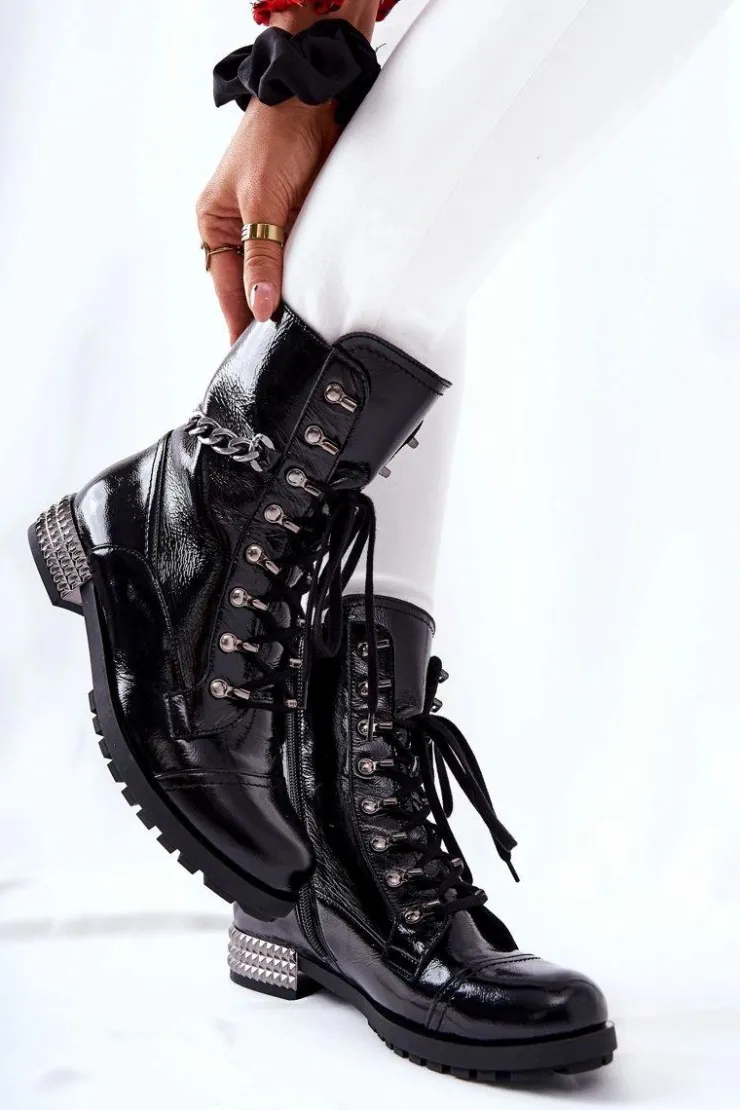 Piękne botki w stylu workerów. Zostały wykonane z naturalnej skóry. Posiadają suwak oraz sznurowanie. Obcas zdobiony ćwiekami oraz dodatkowy łańcuch na cholewce z pewnością doda ostrego charakteru. Ocieplenie w postaci koca obuwniczego. Nie może ich zabraknąć w Twojej szafie! Przy wyborze rozmiaru prosimy sugerować się tabelą rozmiarów.