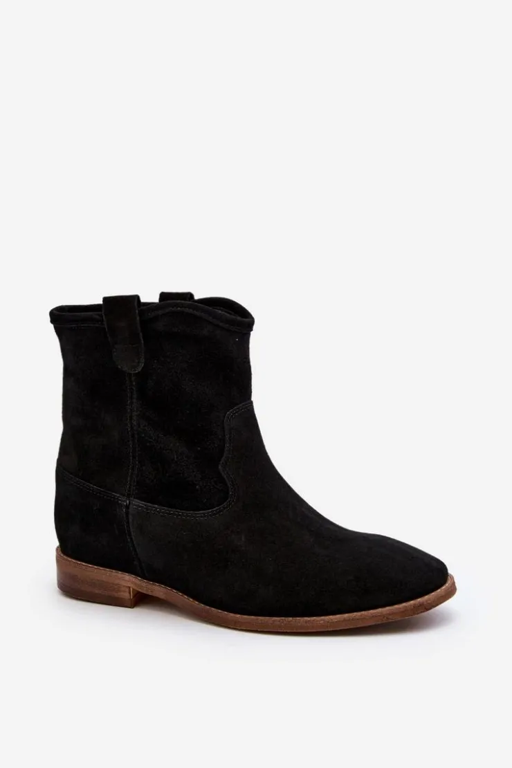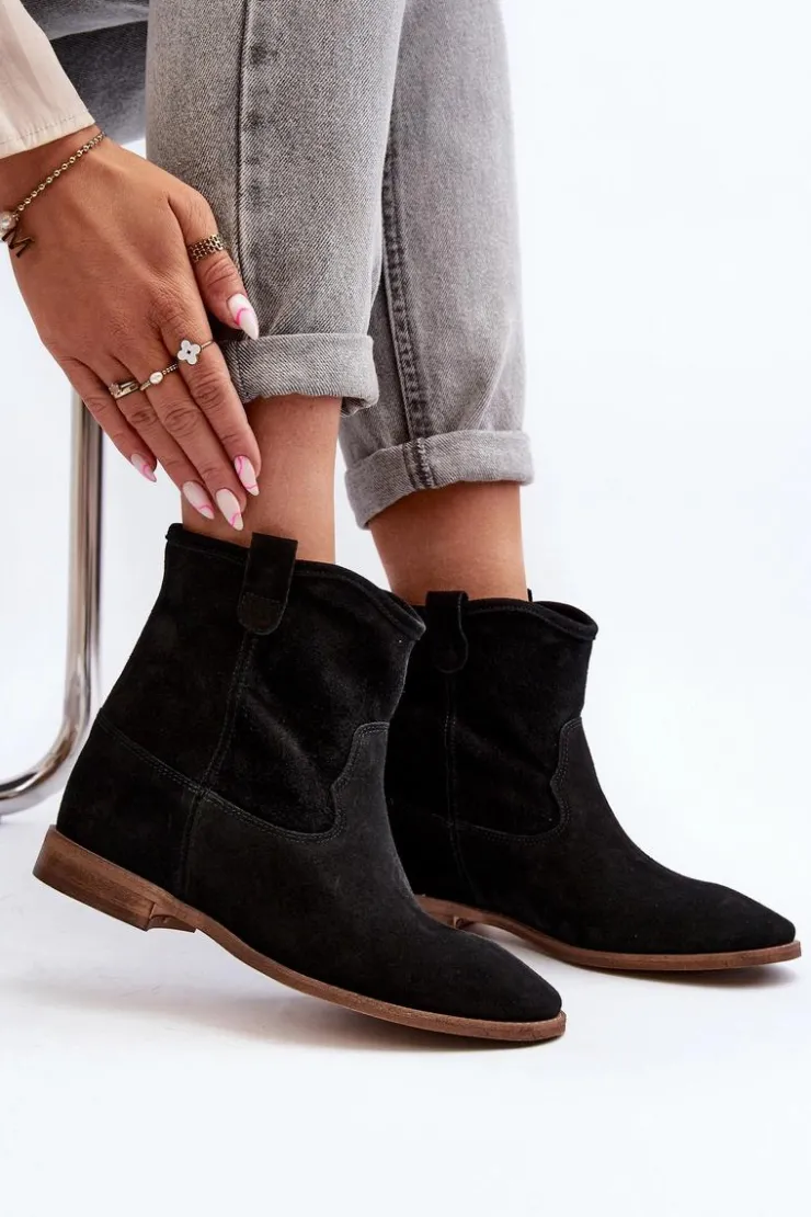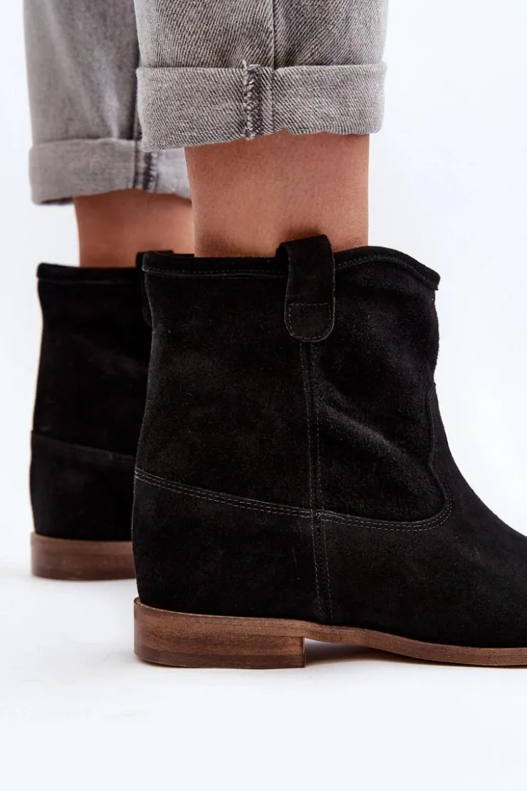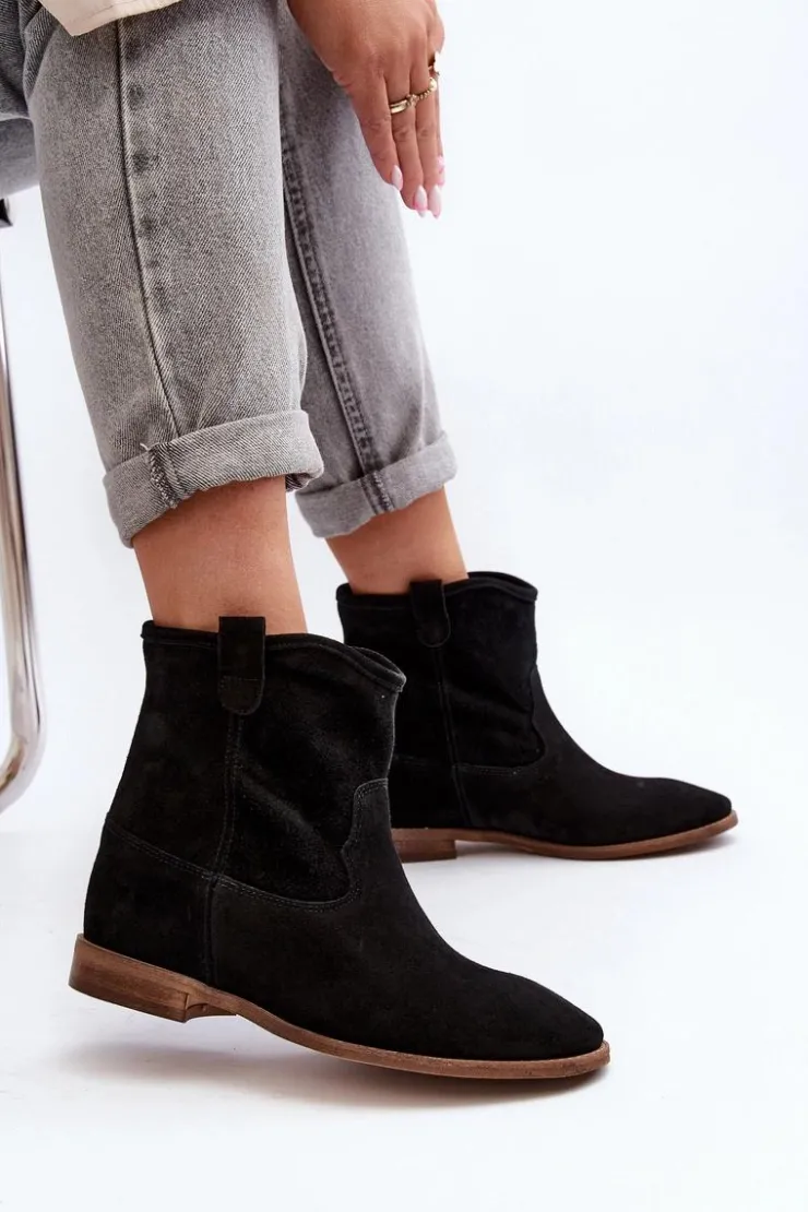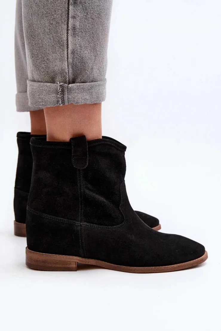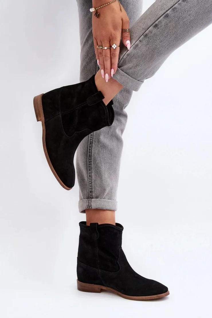 Botki damskie wykonane z naturalnego zamszu. Osadzone na płaskim obcasie z ukrytym koturnem. Noski zaokrąglone. Wkładka z naturalnej skóry zapewni komfort podczas użytkowania. Ten klasyczny model dopasujesz do wielu stylizacji! Przy wyborze rozmiaru prosimy kierować się tabelą rozmiarów