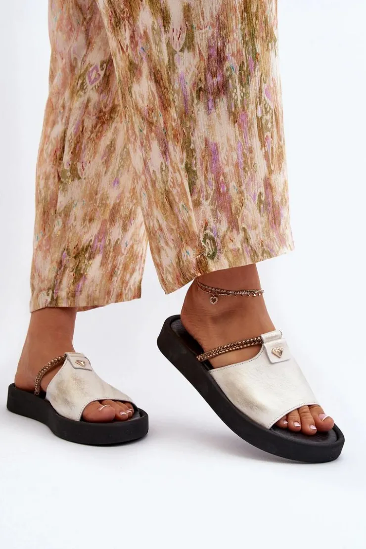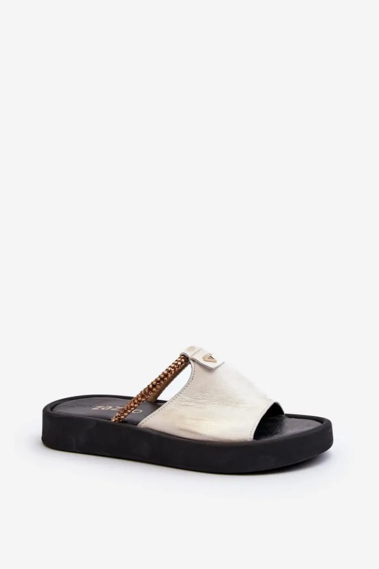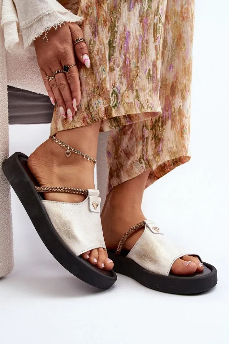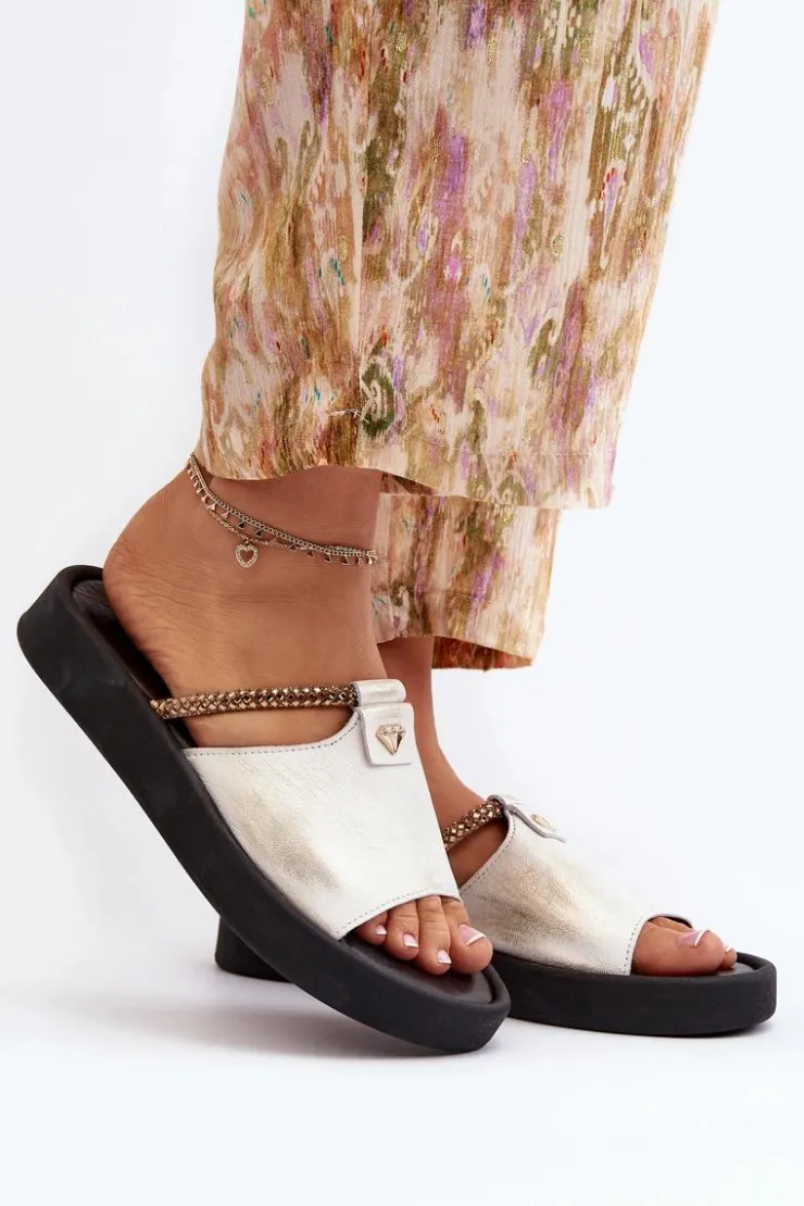 Wygodne klapki damskie wykonane ze skóry naturalnej. Osadzone na grubej podeszwie z gumowego tworzywa. Model ten posiada ozdobny paseczek z mieniącymi się dżetami. Miękka wkładka zapewni komfort nawet w upalne dni! Koniecznie sprawdź całą naszą kolekcję damskich klapek! Przy wyborze rozmiaru prosimy sugerować się tabelą rozmiarów.