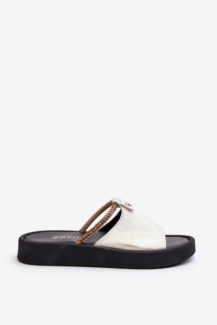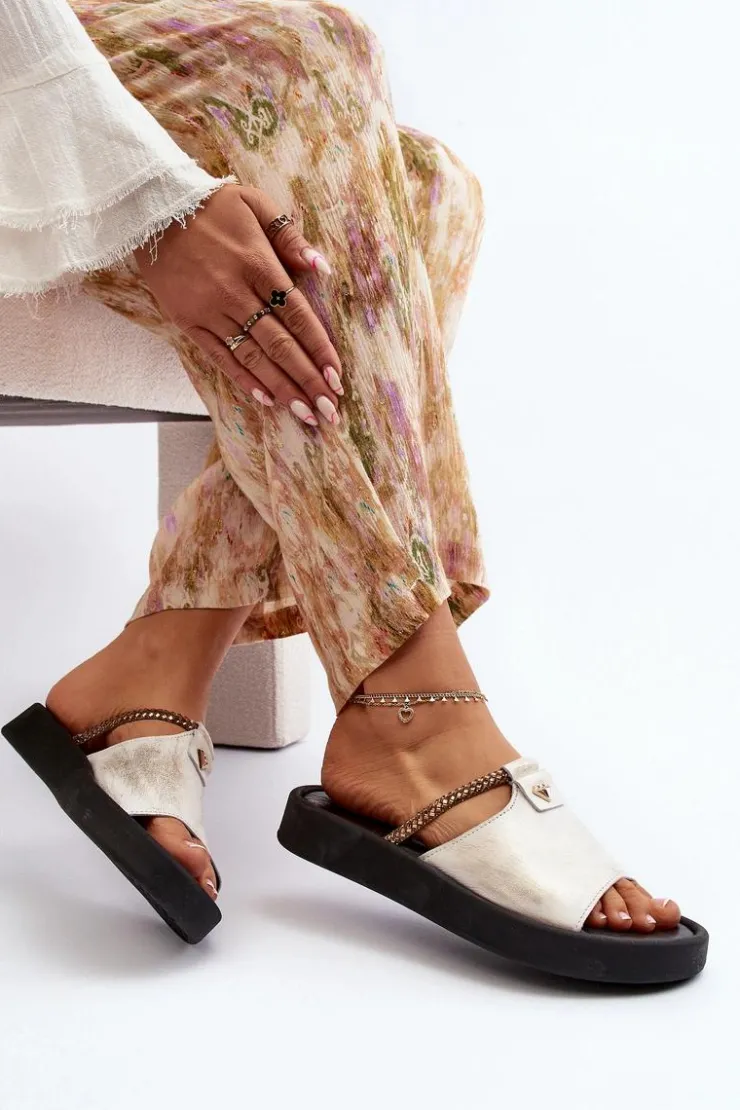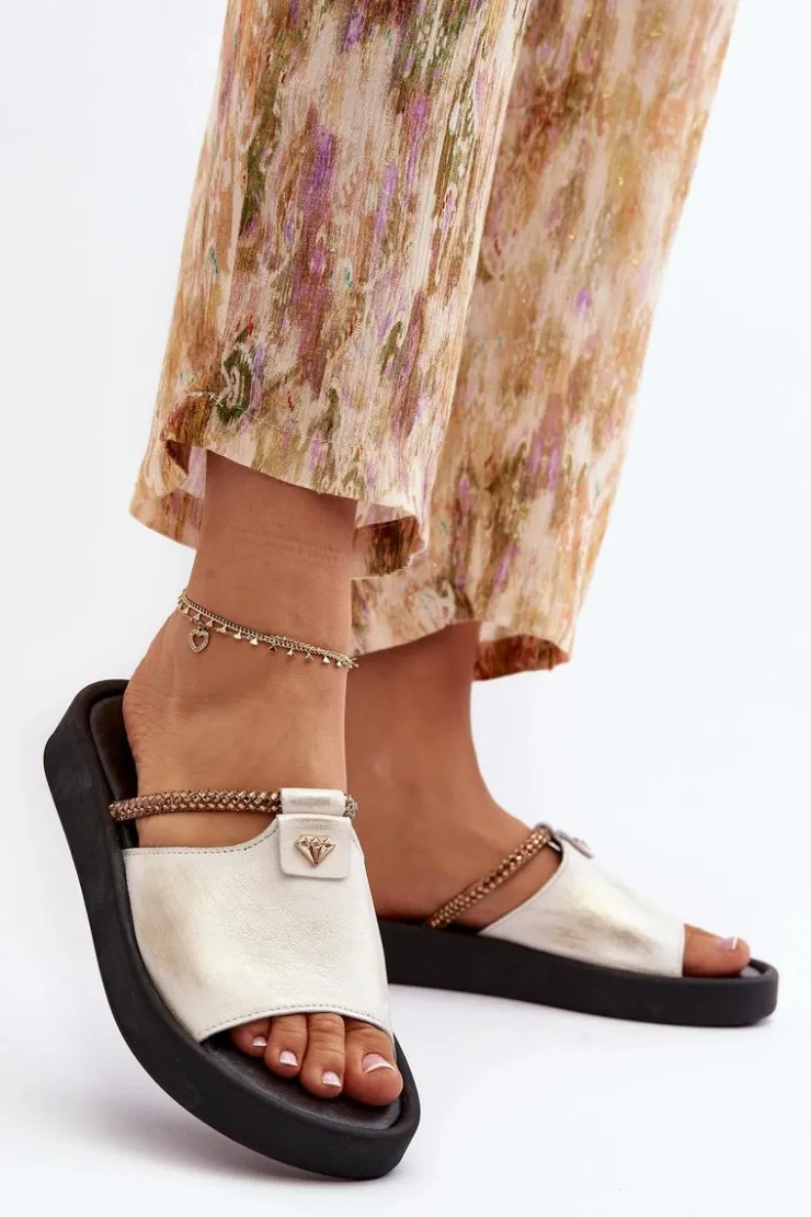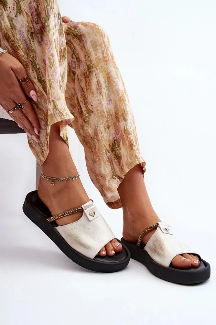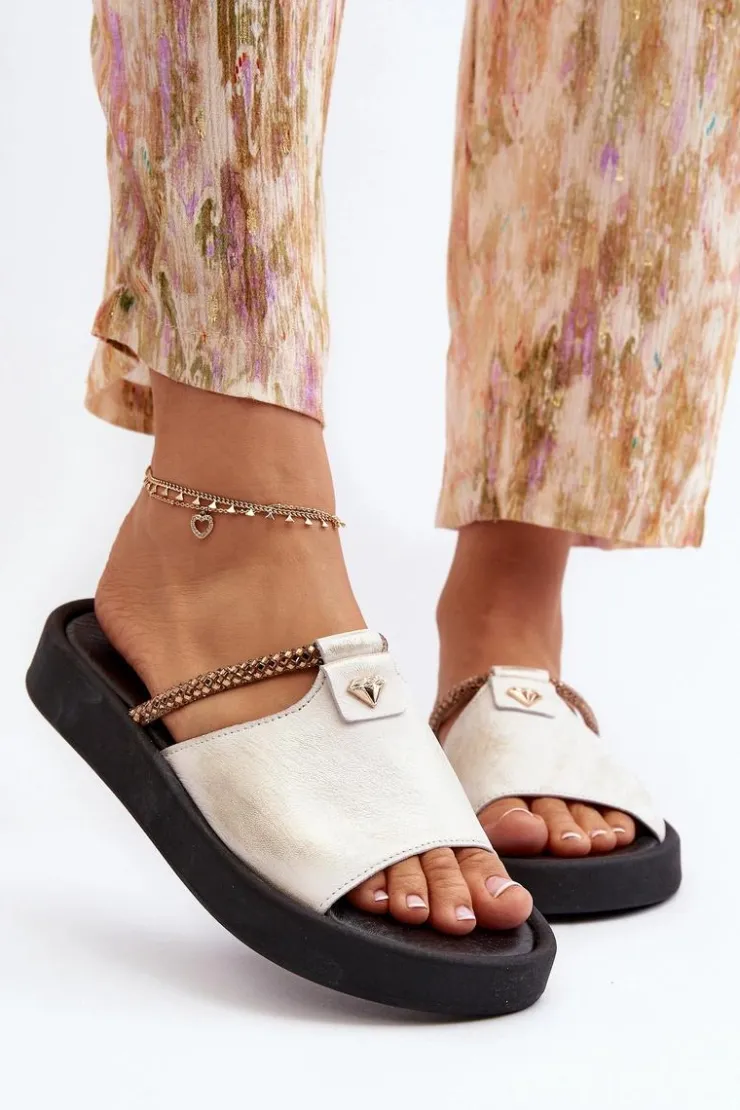 Wygodne klapki damskie wykonane ze skóry naturalnej. Osadzone na grubej podeszwie z gumowego tworzywa. Model ten posiada ozdobny paseczek z mieniącymi się dżetami. Miękka wkładka zapewni komfort nawet w upalne dni! Koniecznie sprawdź całą naszą kolekcję damskich klapek! Przy wyborze rozmiaru prosimy sugerować się tabelą rozmiarów.